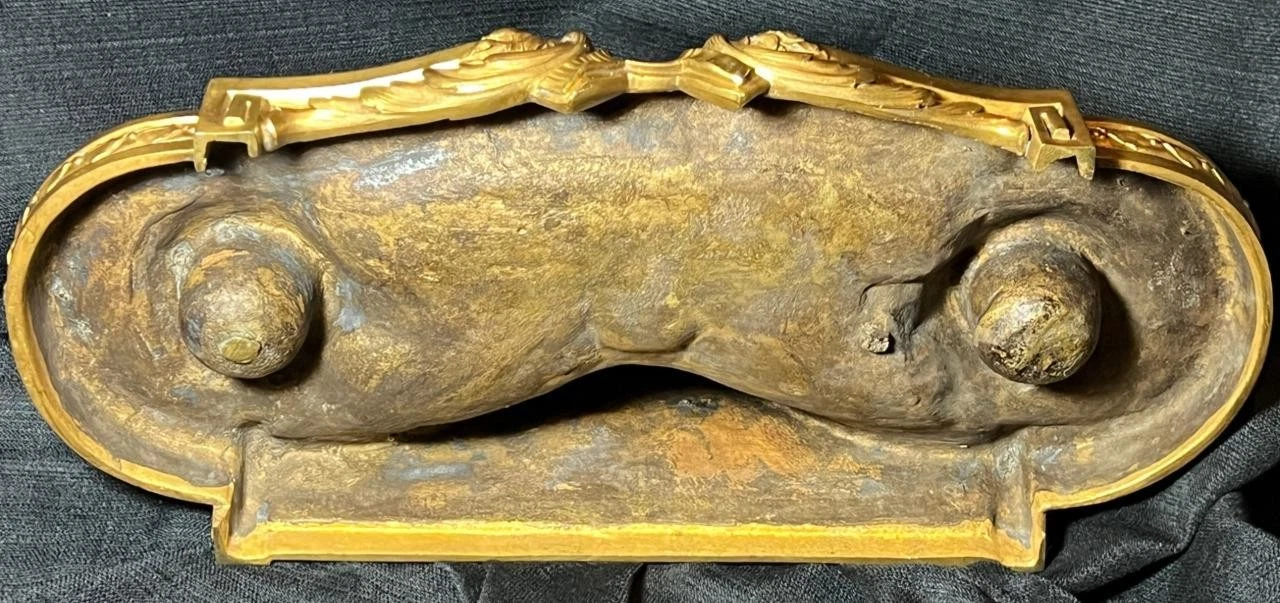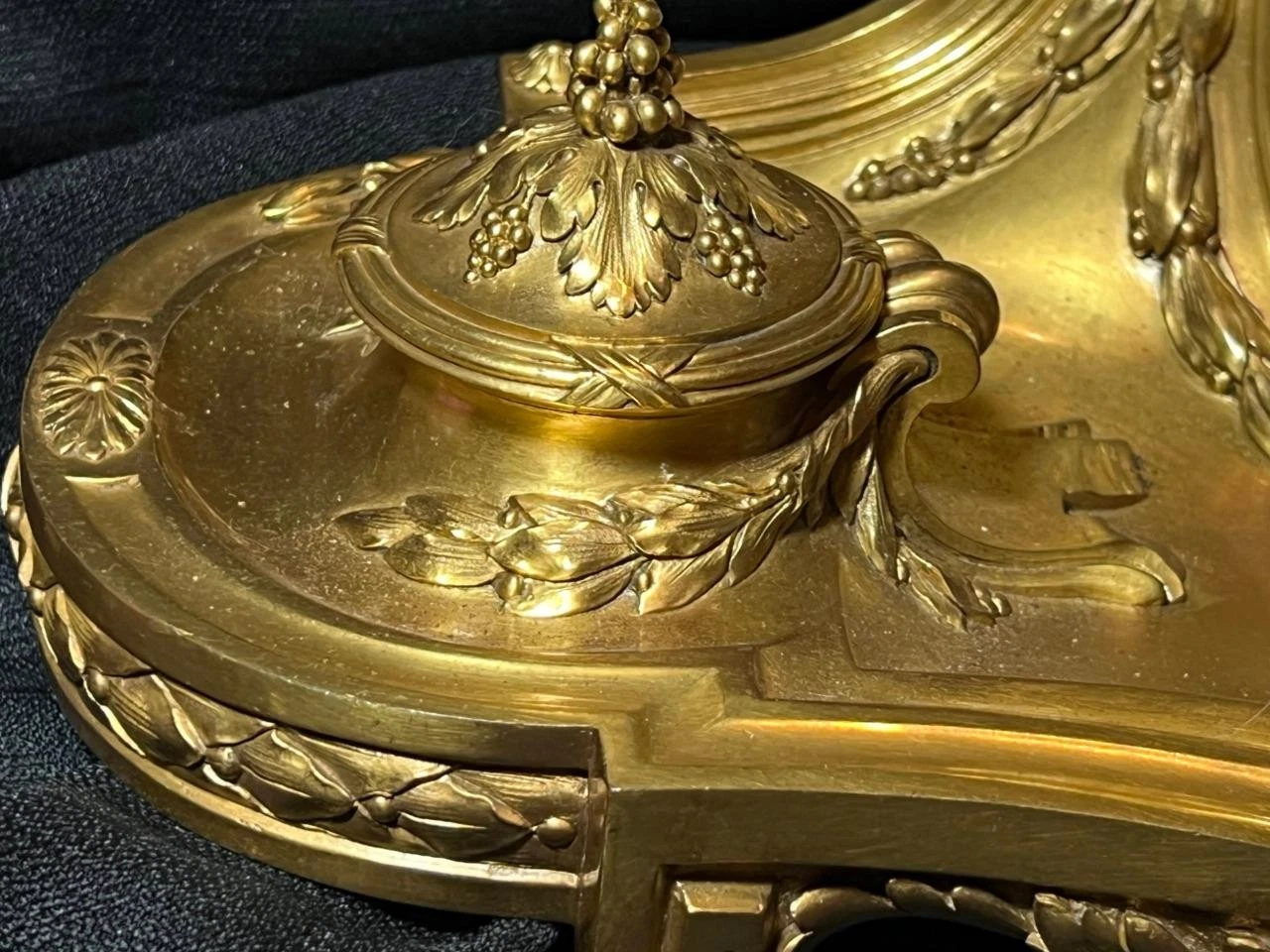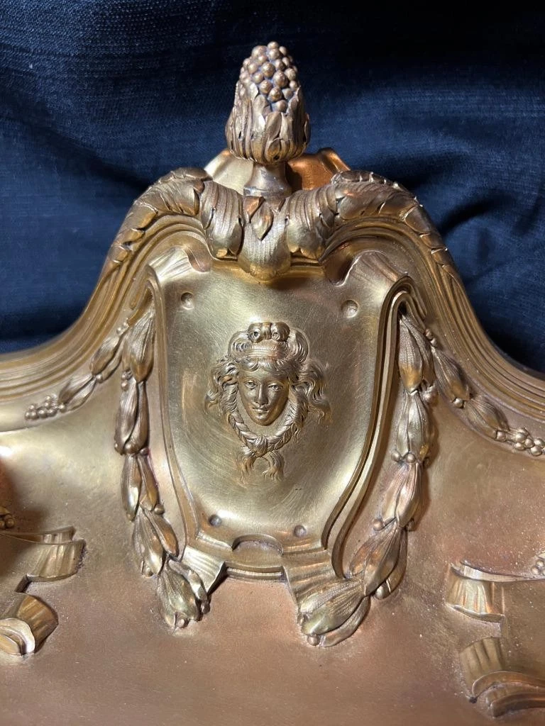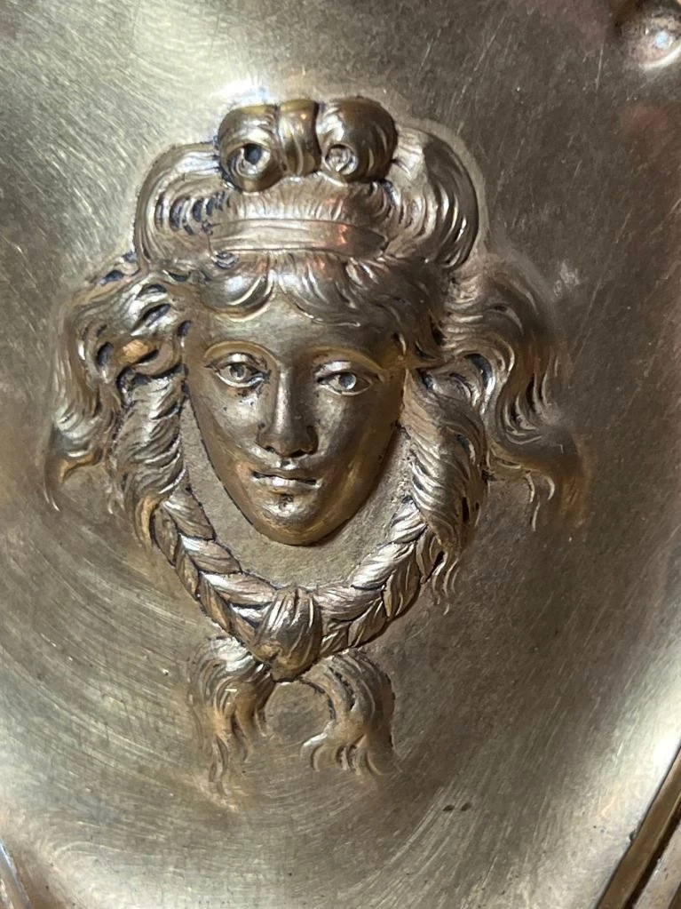 - The Central Mask: The backplate features a finely chased female mask, likely representing a Greco-Roman goddess (such as Diana/Artemis) or a Bacchante, a common motif in Neoclassical bronze work.