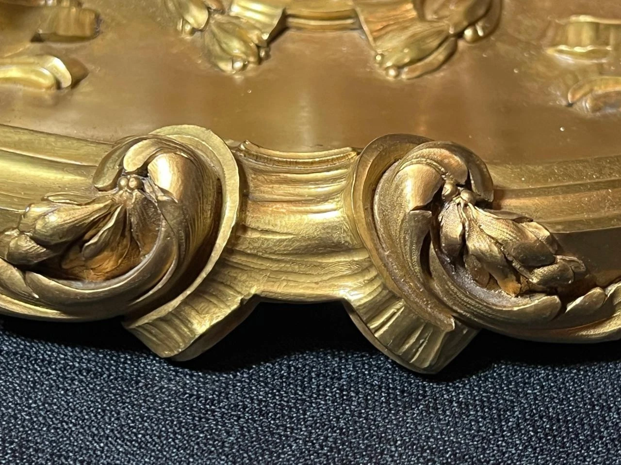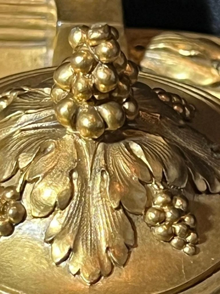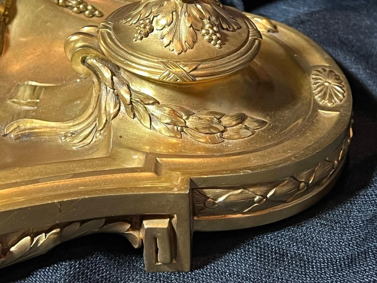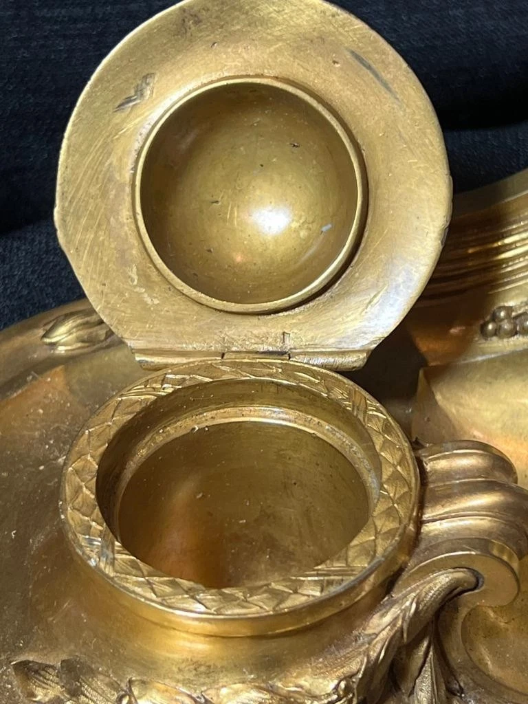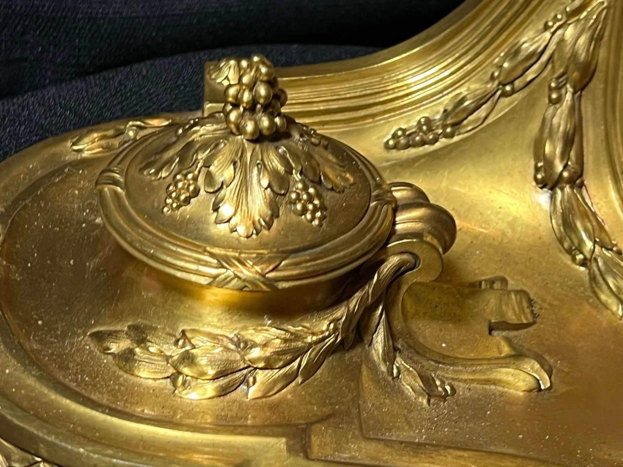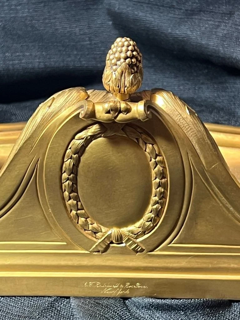 The inkstand is made of heavy cast bronze with a gold gilt (doré) ormolu finish. This process involves applying a high-karat gold layer to the bronze to create a lustrous, enduring finish that resists tarnishing. Caldwell was famous for the superior quality of their chasing (the hand-finishing of the metal) and their gilding, which rivaled the best French foundries of the 18th century.
