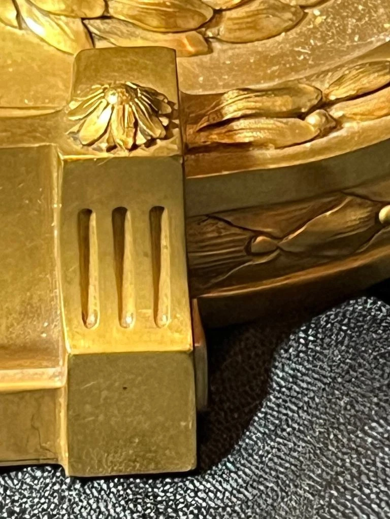 - Decorative Details: The base features a border of repeating leaf-and-dart or laurel motifs, and the feet are fluted and decorated with rosettes (daisies), a hallmark of the Louis XVI aesthetic.