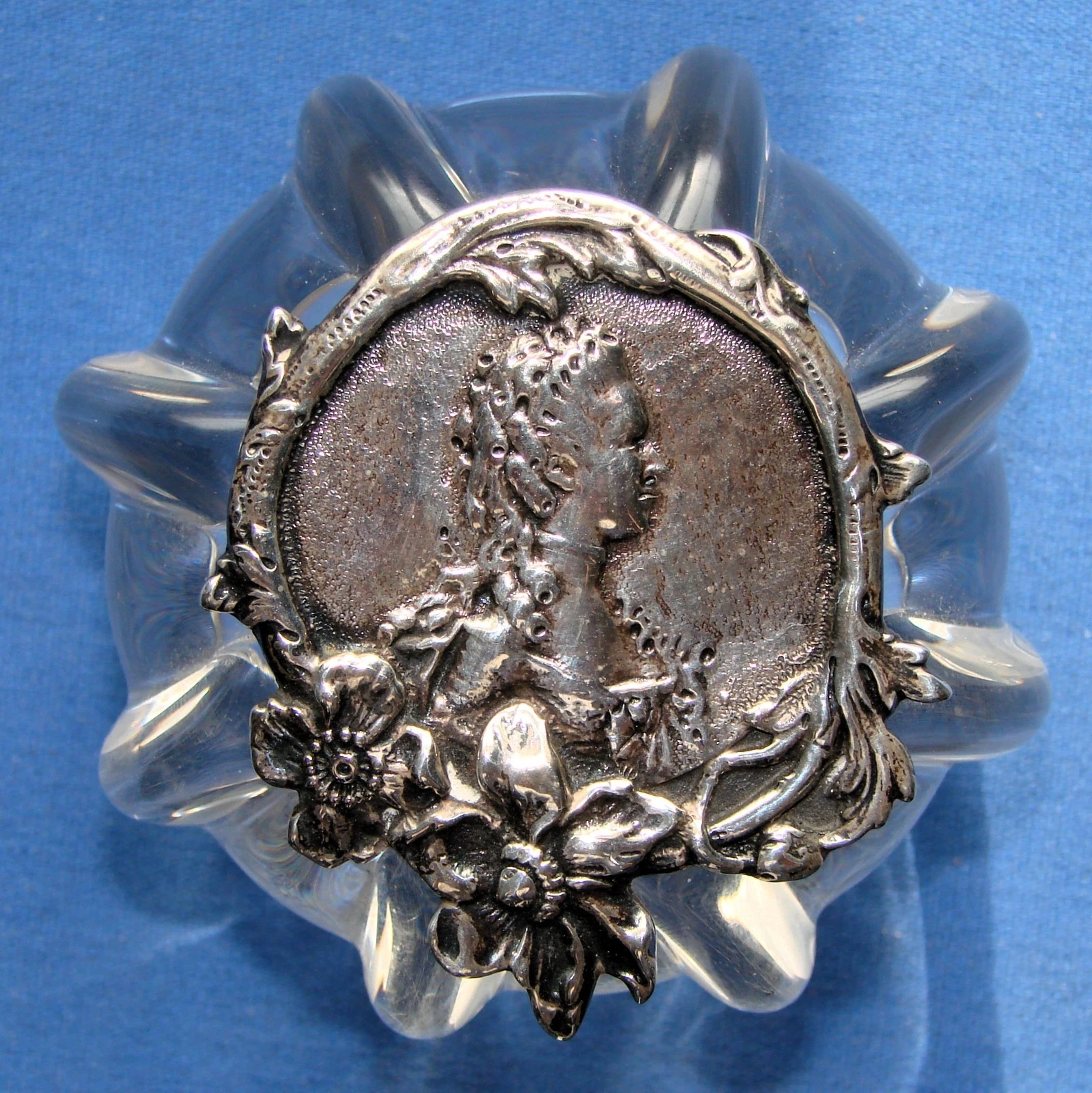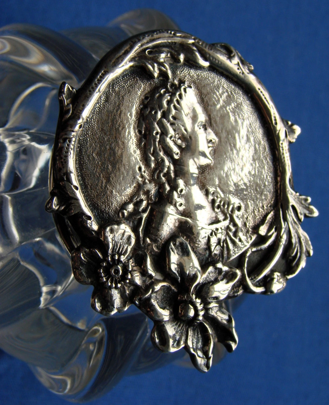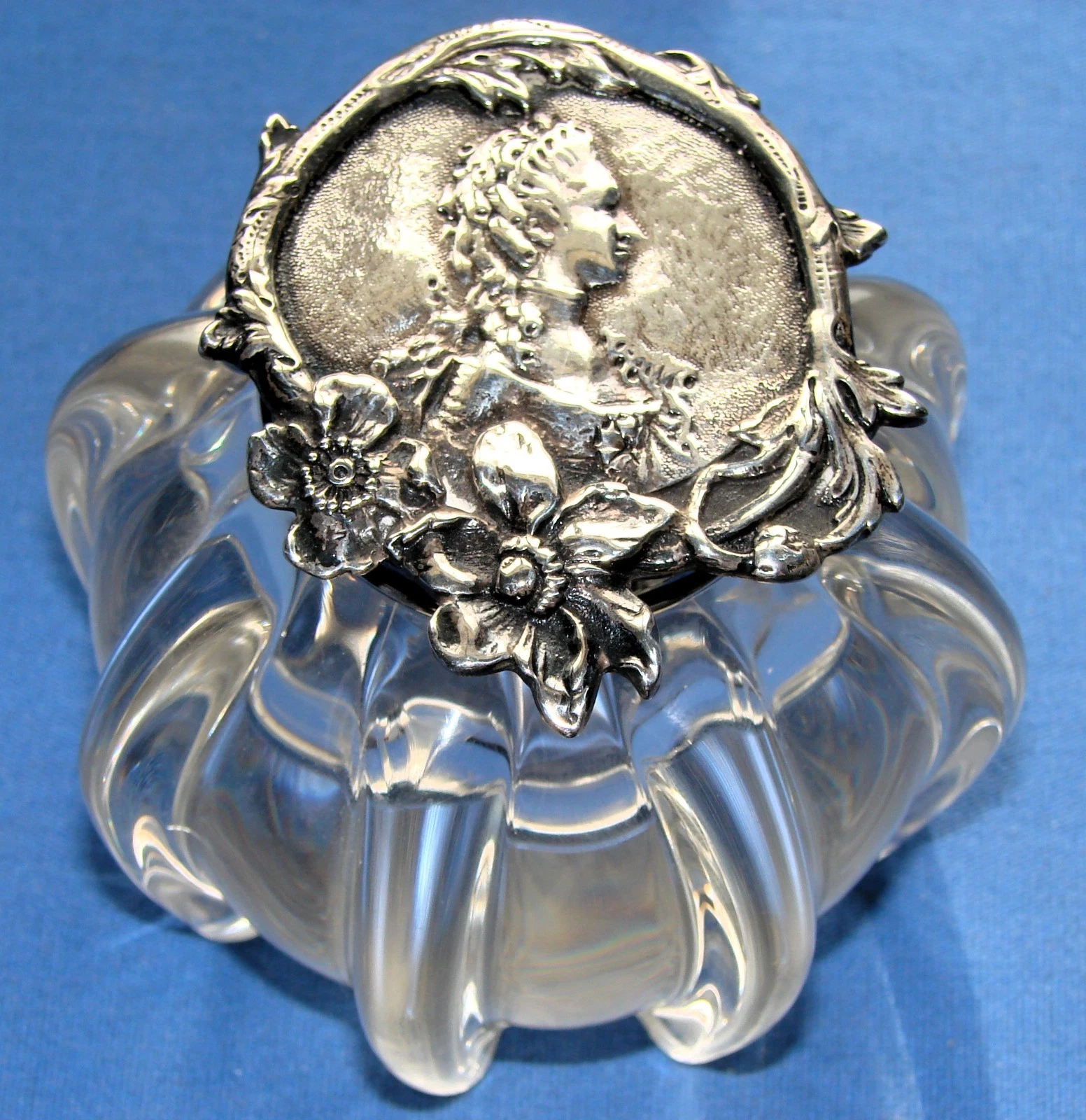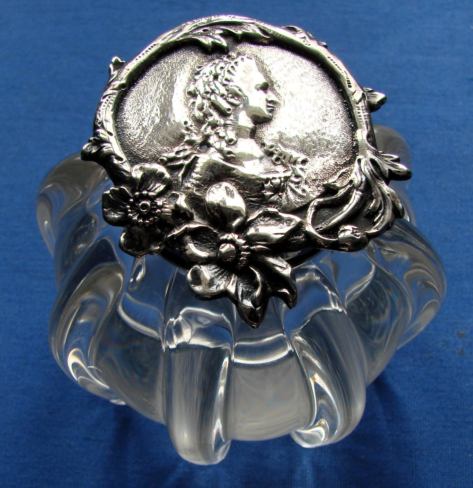- The Lid (Repoussé): The hinged sterling silver lid features elaborate Rococo Revival ornamentation.