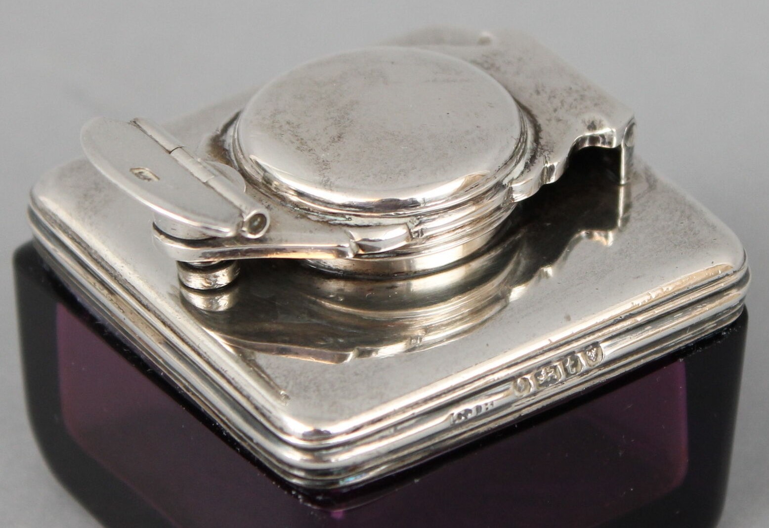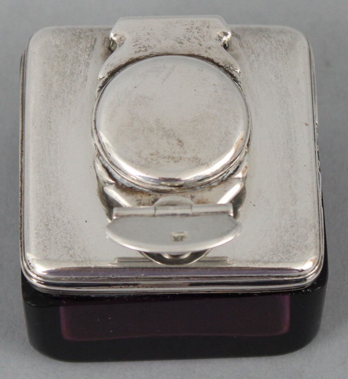 The top of this early 19th century inkwell is made of sterling silver. The lid has a locking mechanism. The bottom is made of cut and polished amethyst-colored glass. The hallmarks date the piece to 1834, attributed to silversmith Christopher John Buckler of London.