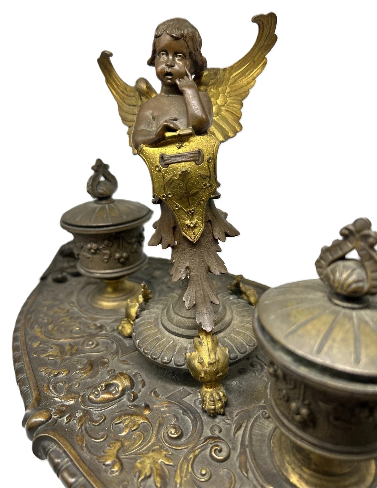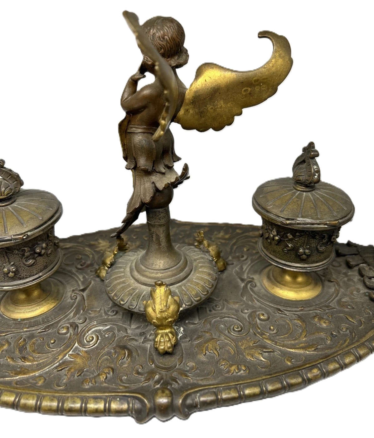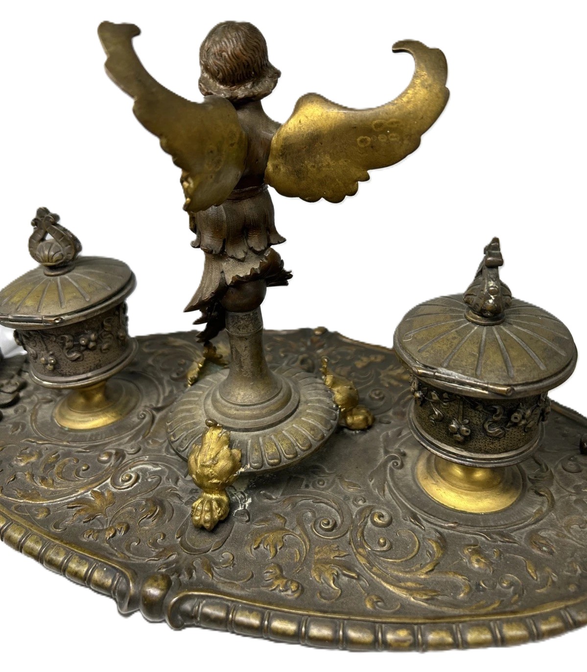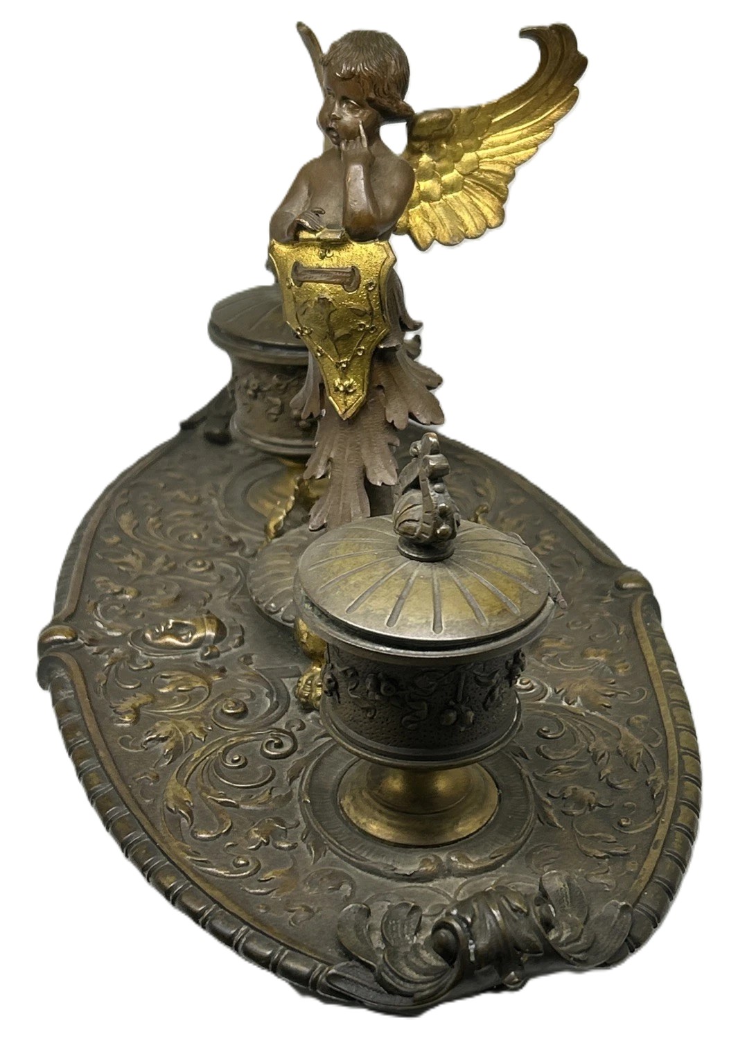 - Dual Inkwells: Flanking the central angel are two matching inkwells. They are urn-shaped, with decorated bodies in relief, featuring garlands of fruit. Each inkwell has a domed lid with an ornate finial.