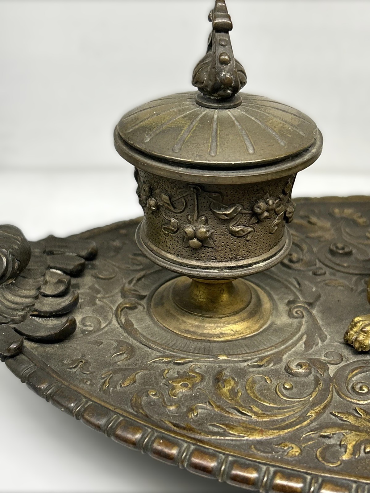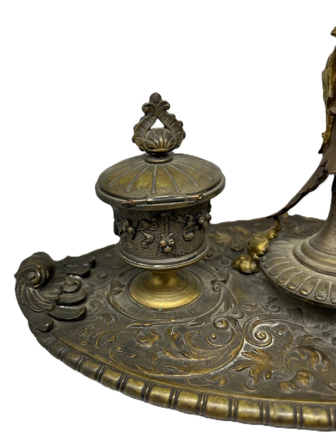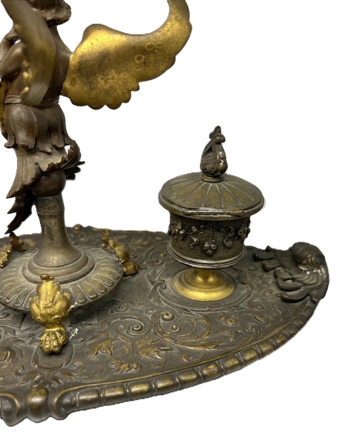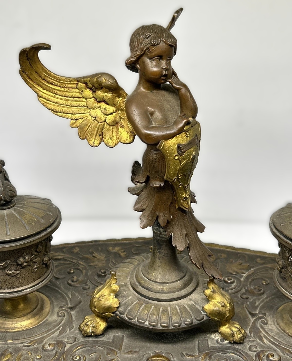 - Dual Inkwells: Flanking the central angel are two matching inkwells. They are urn-shaped, with decorated bodies in relief, featuring garlands of fruit. Each inkwell has a domed lid with an ornate finial.
