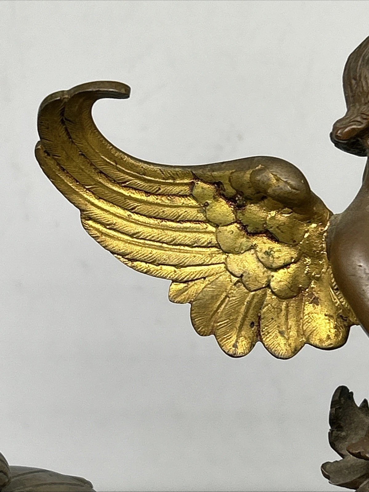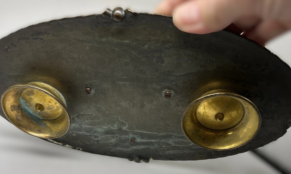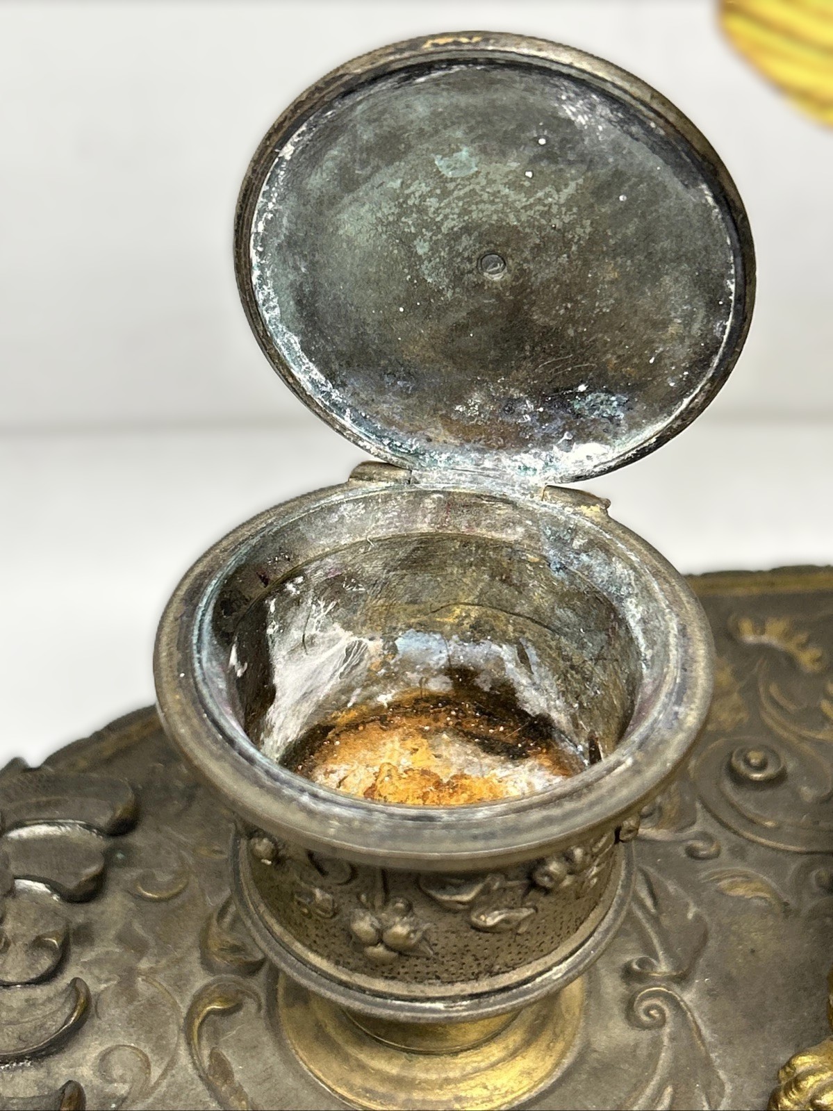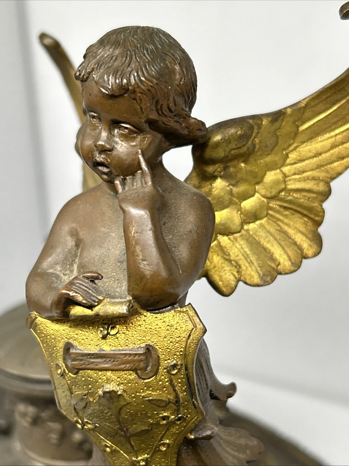 - Dual Inkwells: Flanking the central angel are two matching inkwells. They are urn-shaped, with decorated bodies in relief, featuring garlands of fruit. Each inkwell has a domed lid with an ornate finial.
