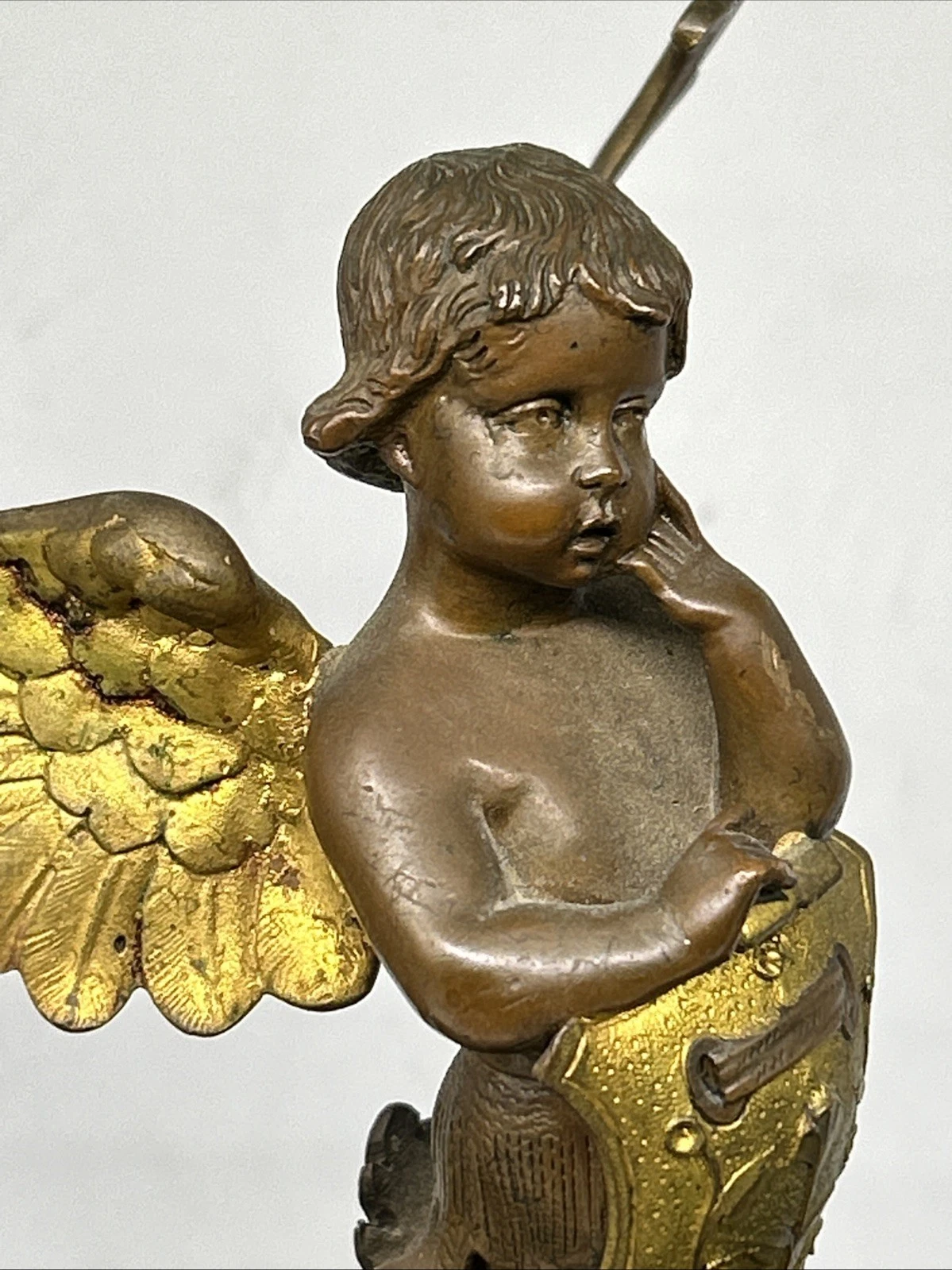 - Central Angel Figure: A sculpted figure of an angel or cherub stands centrally. This angelic figure has a youthful expression, with one hand raised to its chin. The figure has two large, detailed gilt wings that extend upwards and outwards.