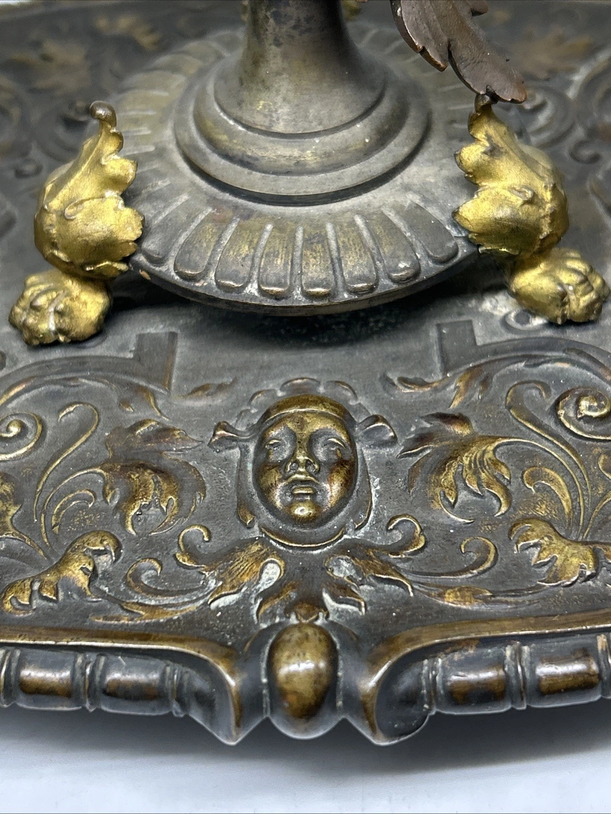 - Ornate Base: The entire arrangement rests on a decorative, oval-shaped base with a scalloped rim. The surface of the base is decorated with cast vines and leaves. There is a face mask positioned centrally at the front of the base.