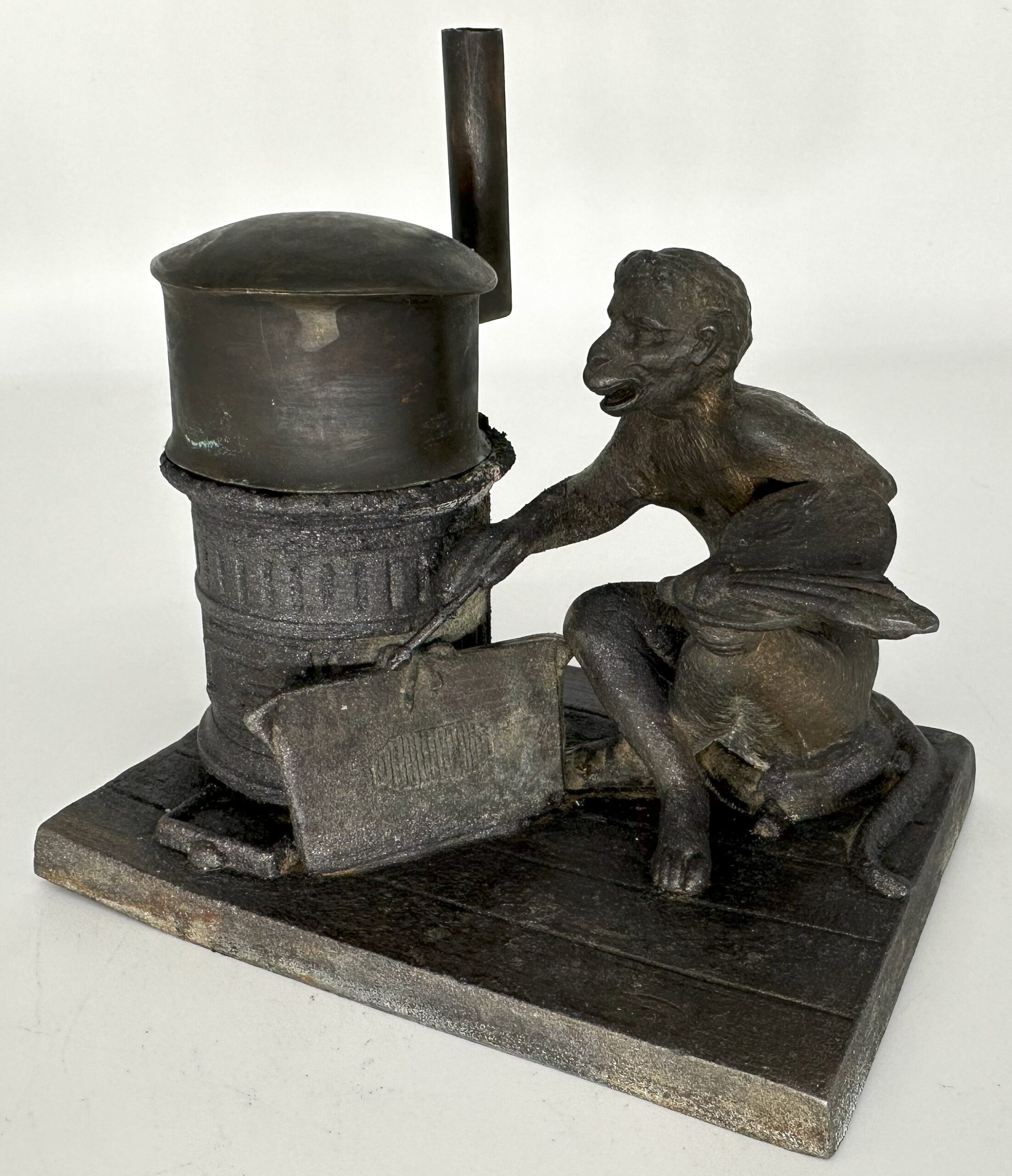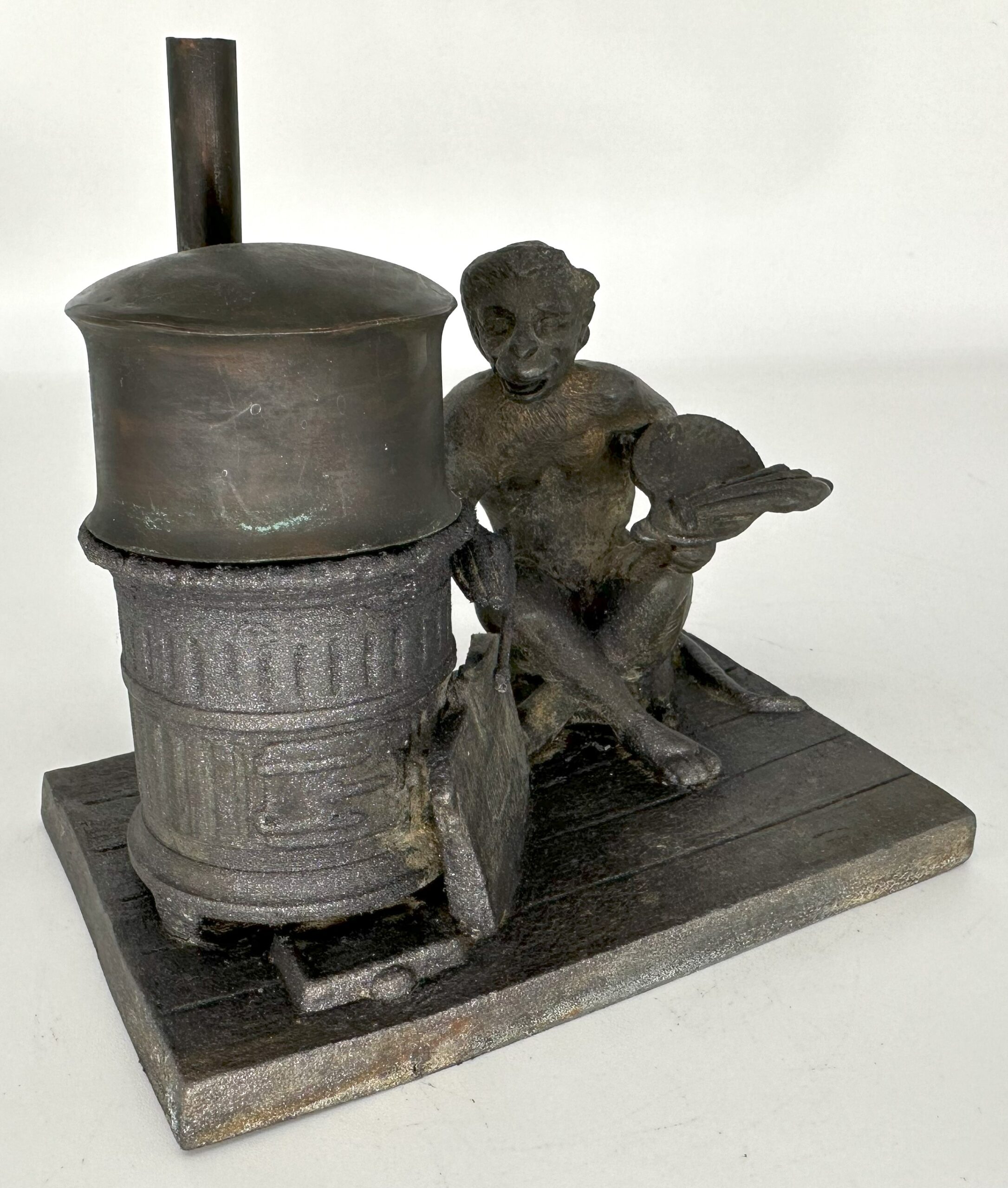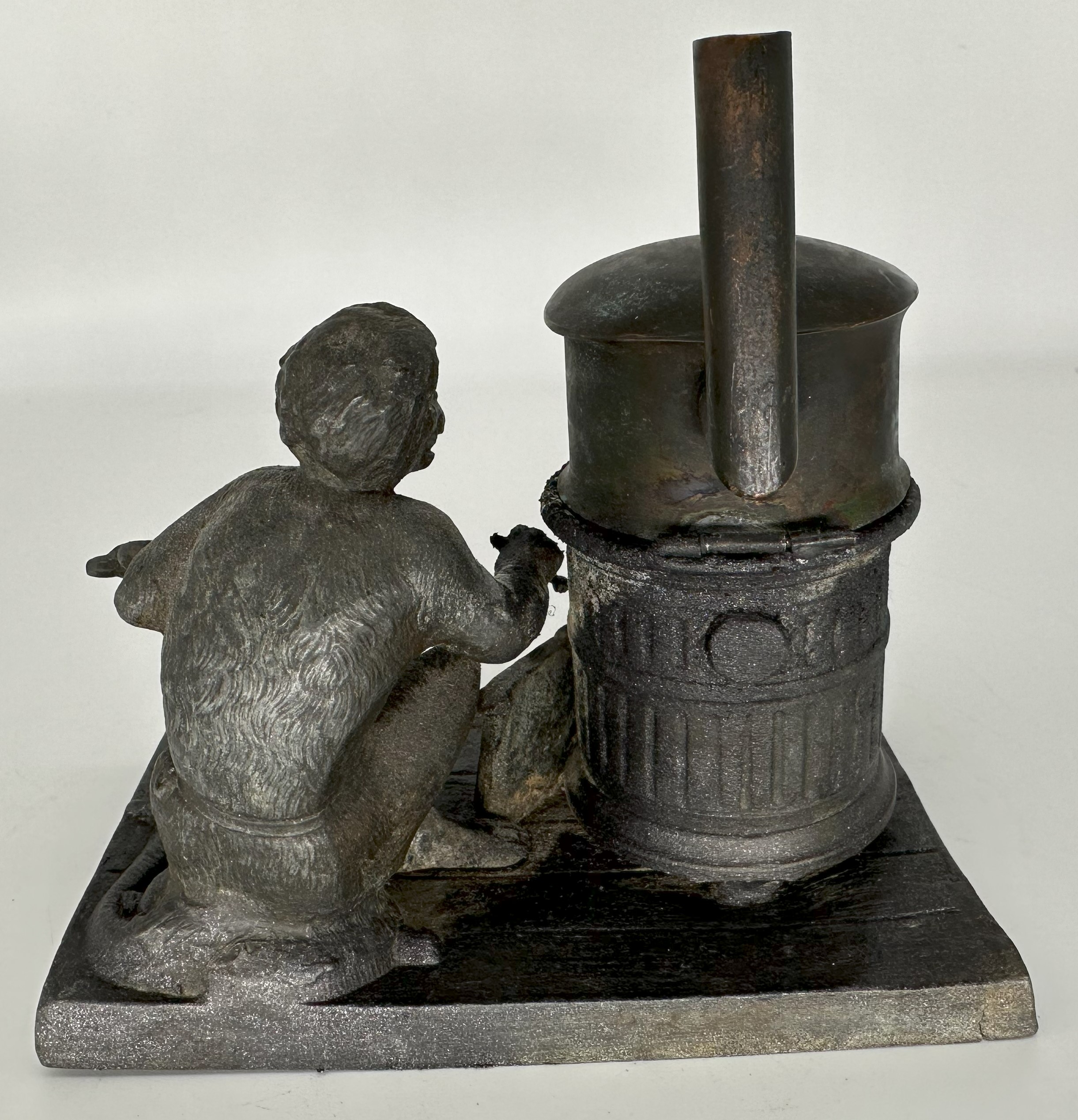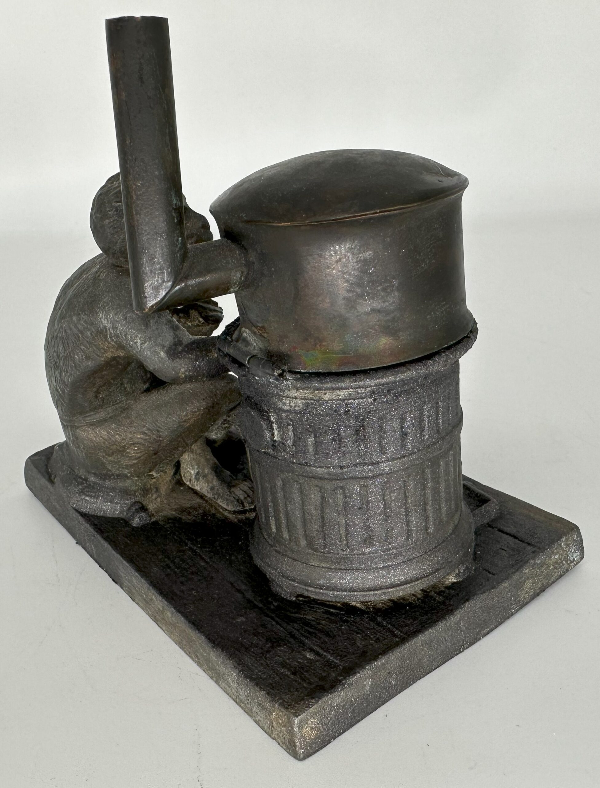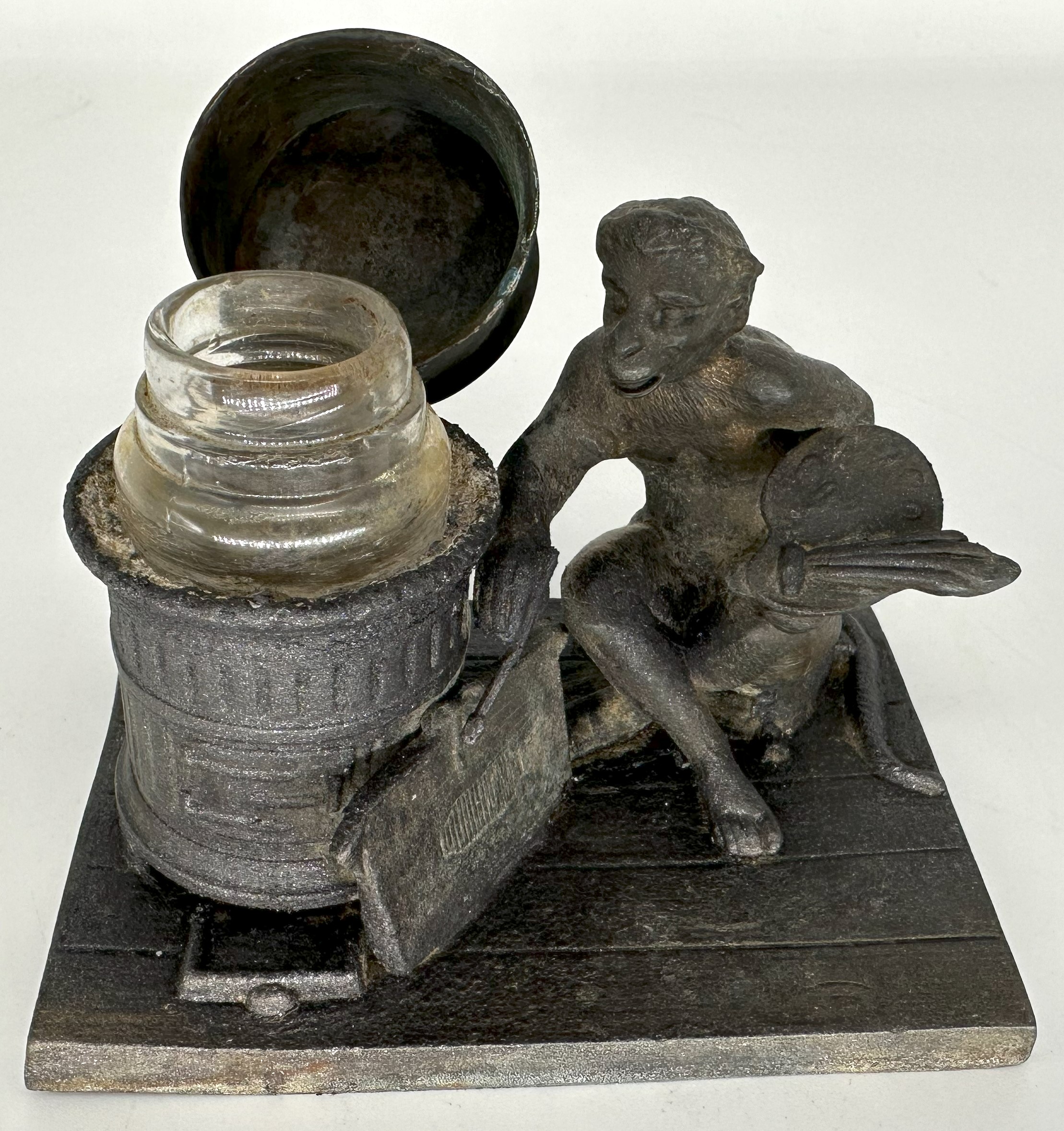This inkstand features an anthropomorphic monkey sitting on a cushion next to a coal-fired stove. The monkey is holding an artist’s palette and paint brush in his hands; a portfolio is propped on the stove, next to his feet. The stove pipe could serve as a penholder.
