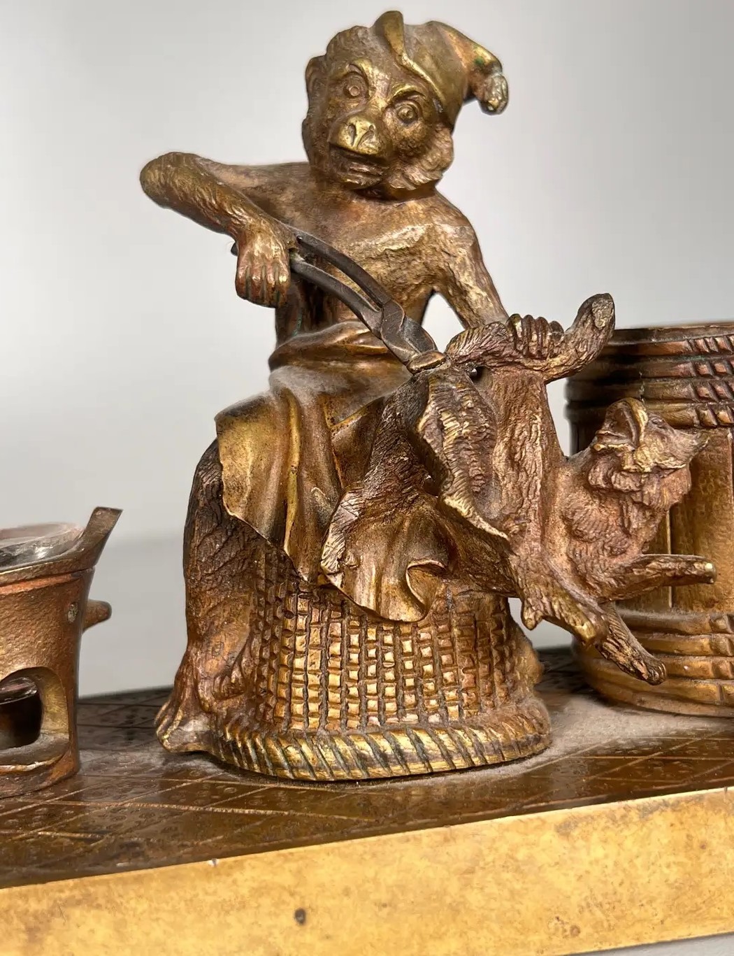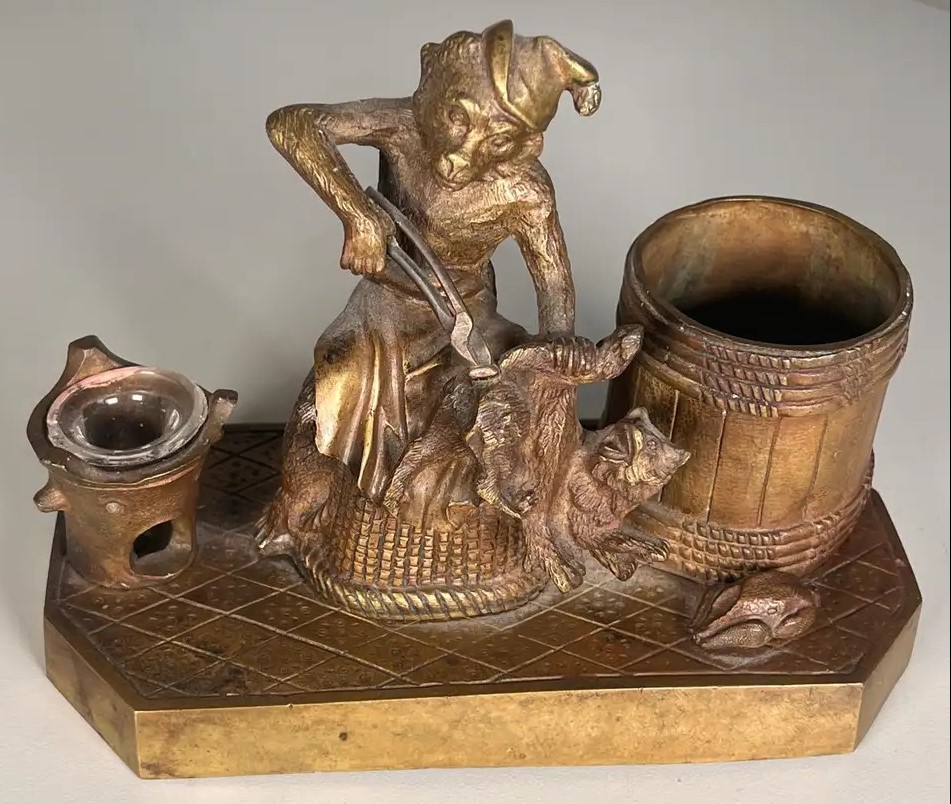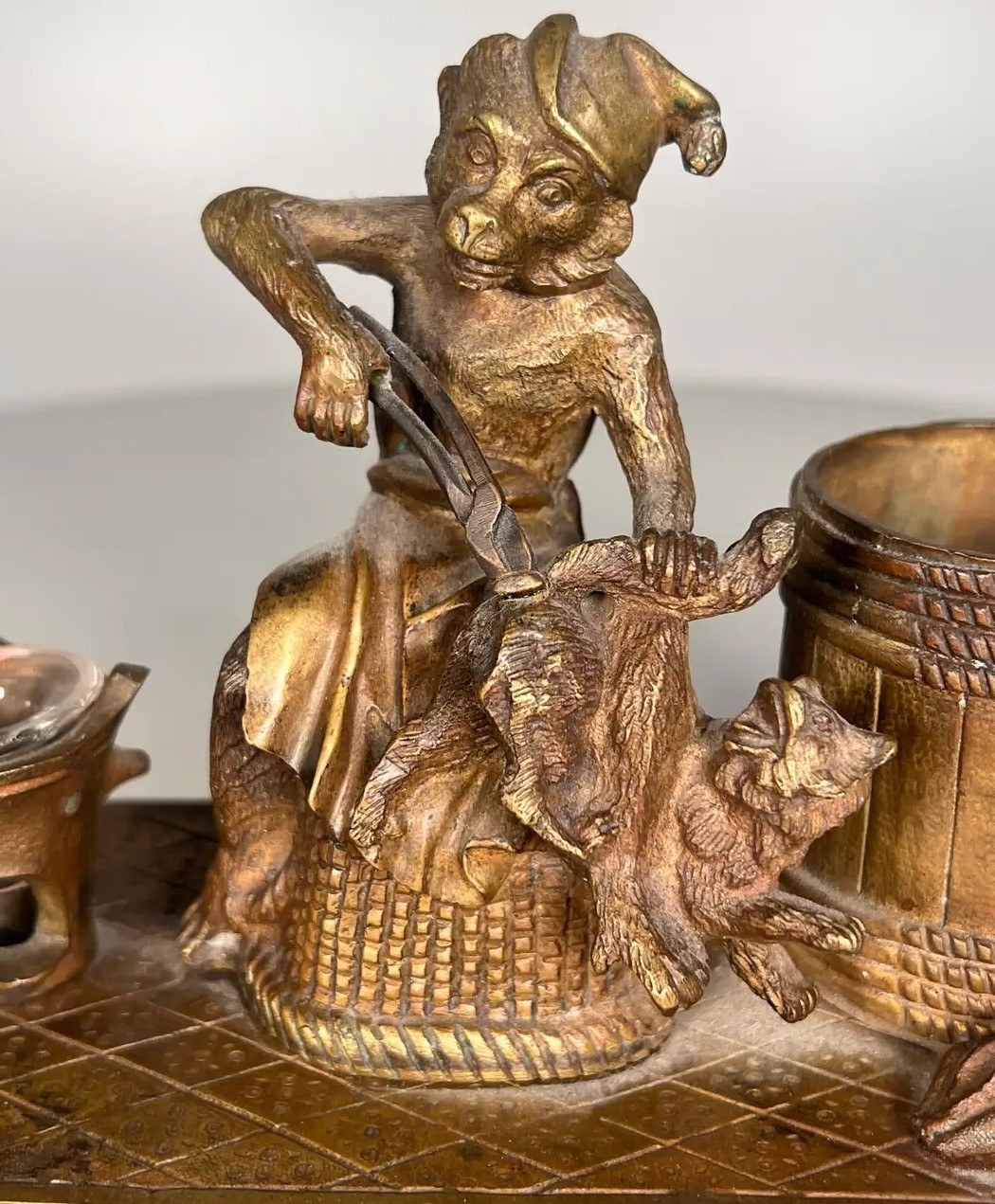 What can one say about this inkstand which depicts an anthropomorphic monkey castrating a cat? The inkwell is missing its lid. In front of the storage barrel is a whole chicken, perhaps used to lure the cat.