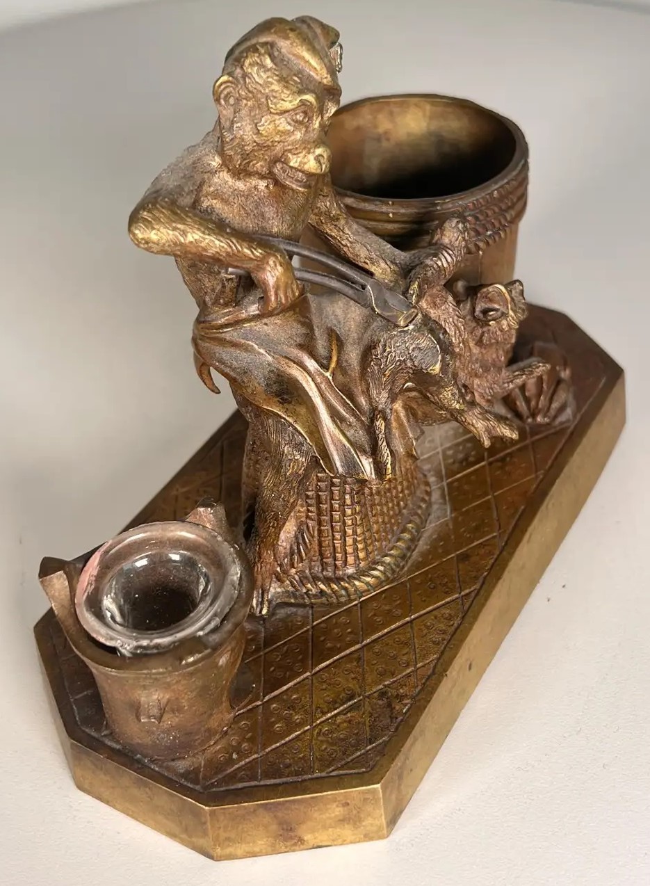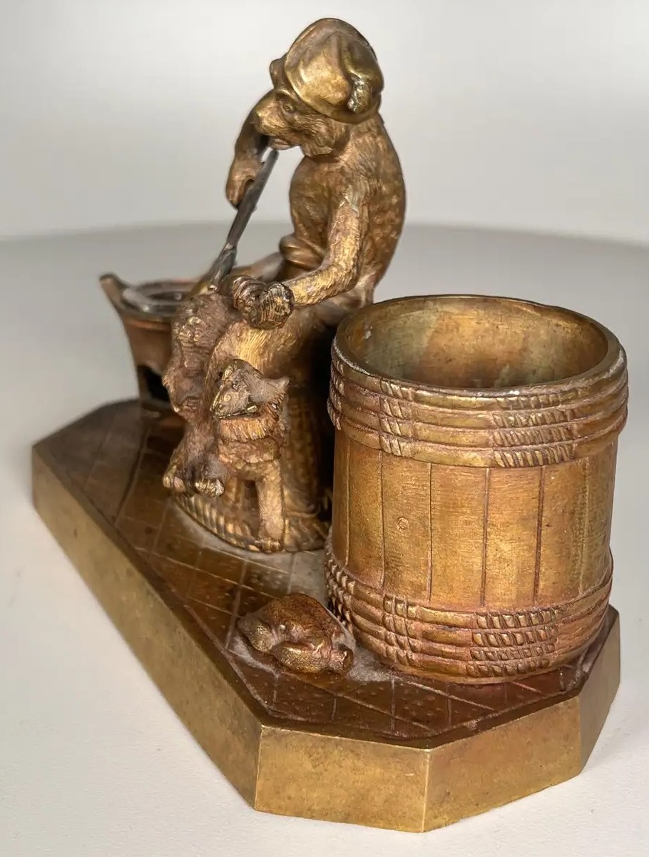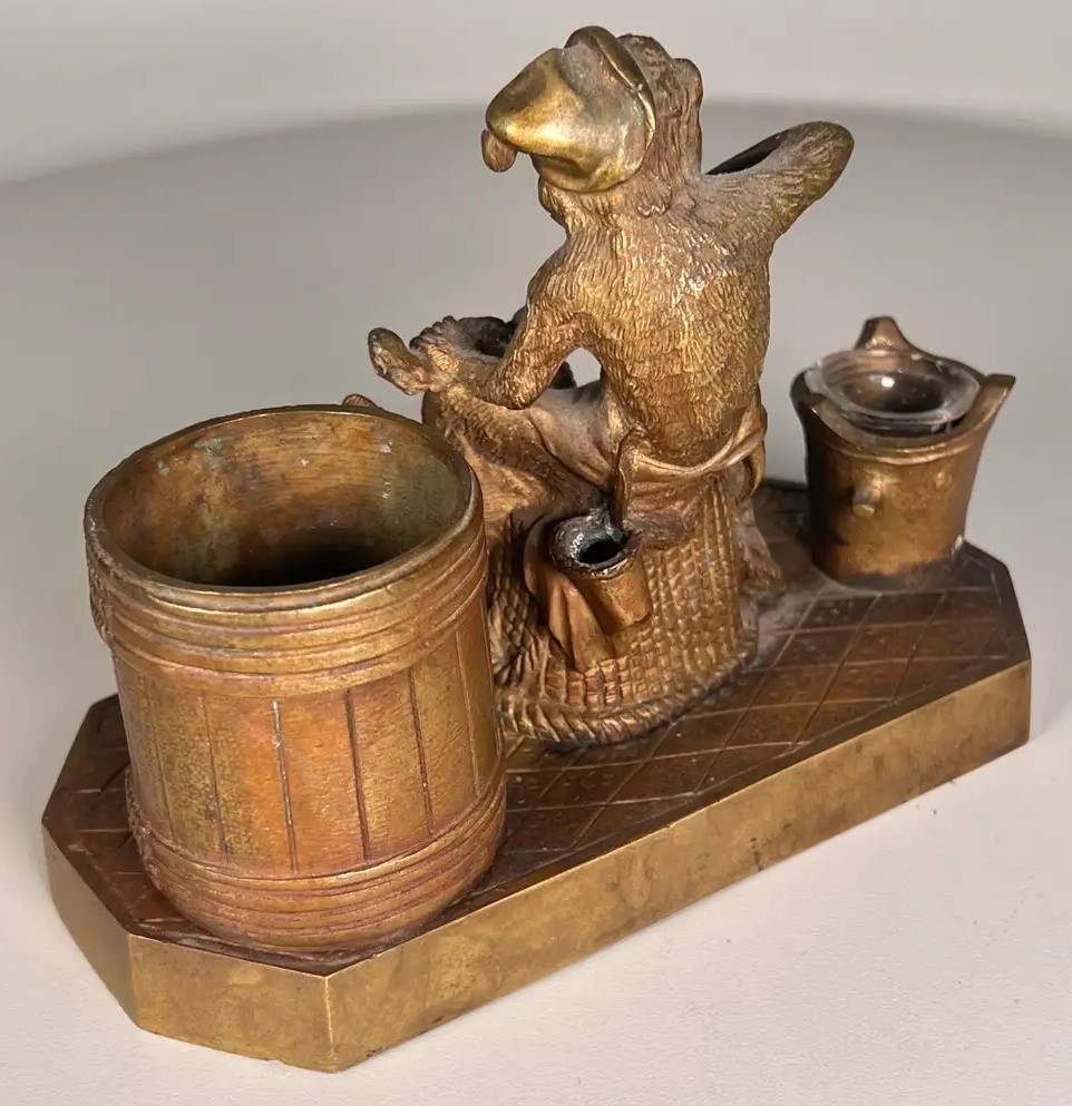 What can one say about this inkstand which depicts an anthropomorphic monkey castrating a cat? The inkwell is missing its lid. In front of the storage barrel is a whole chicken, perhaps used to lure the cat.