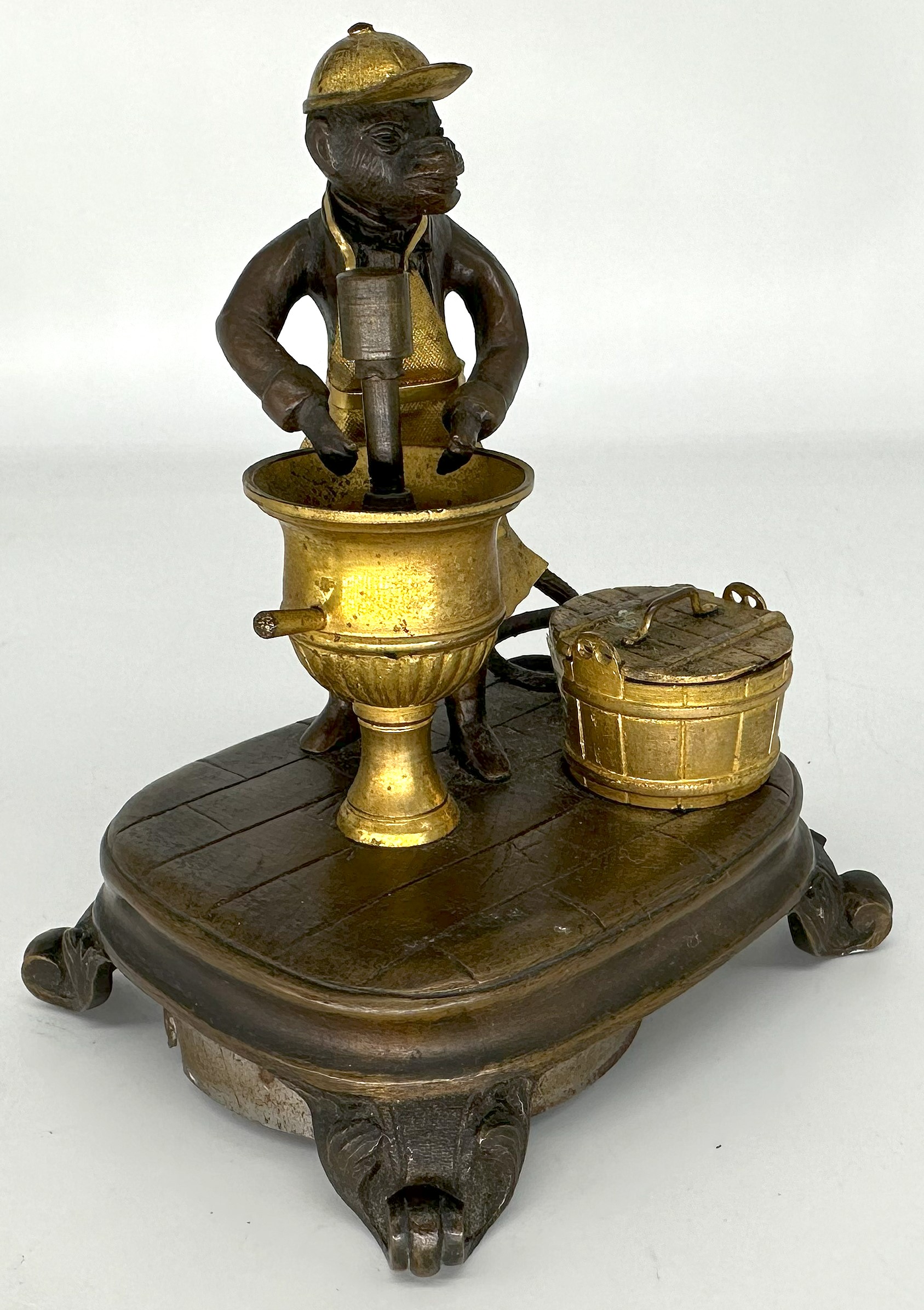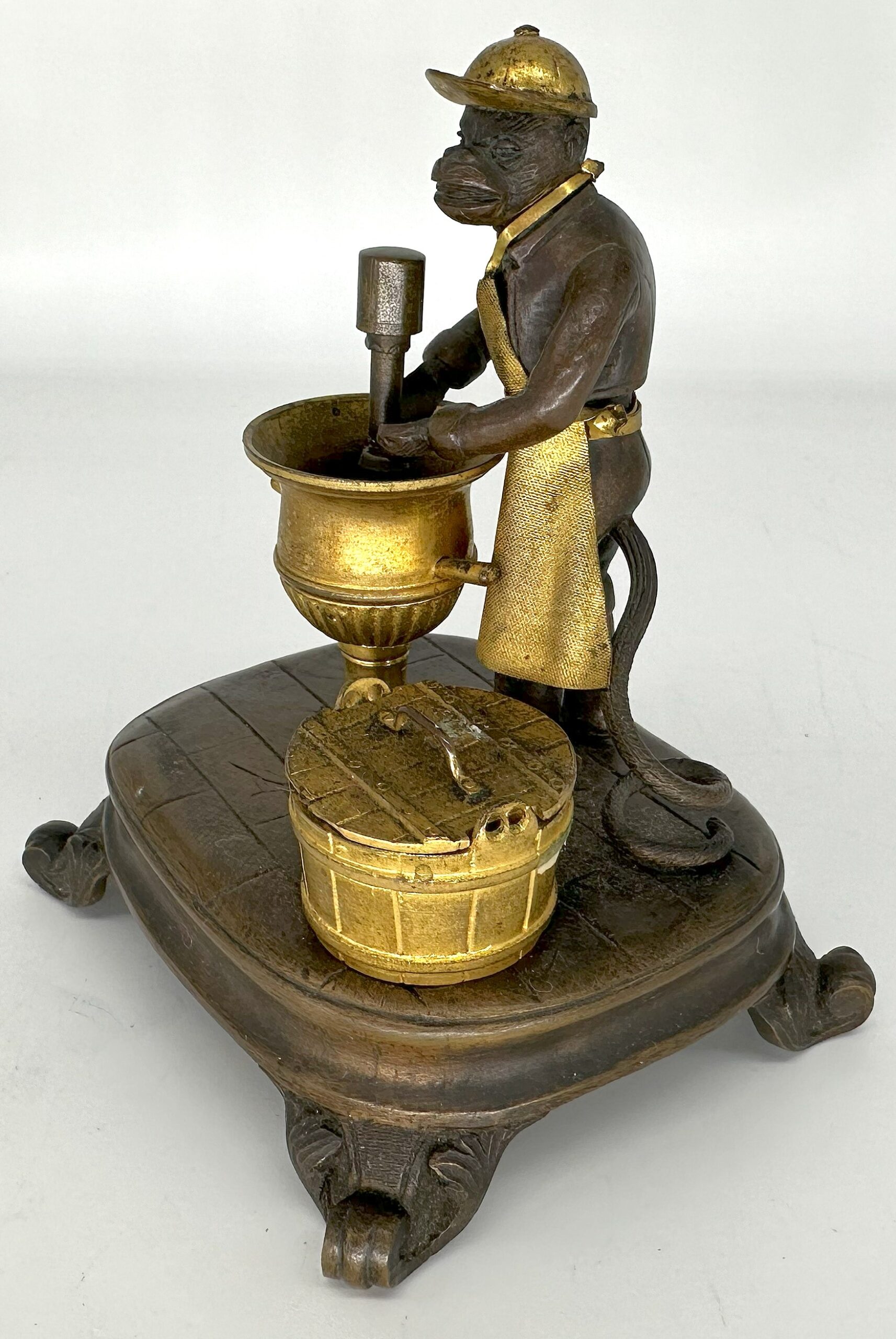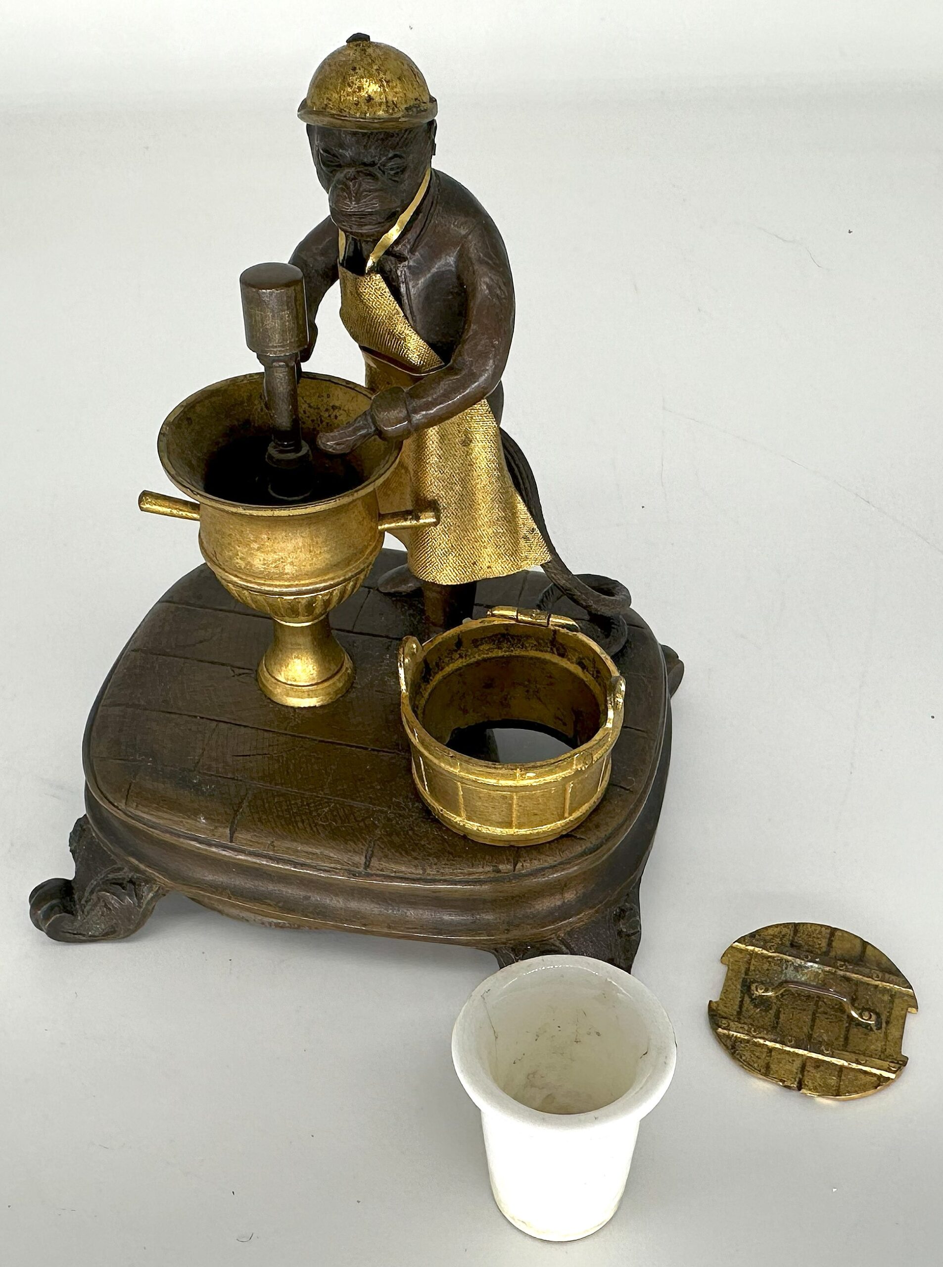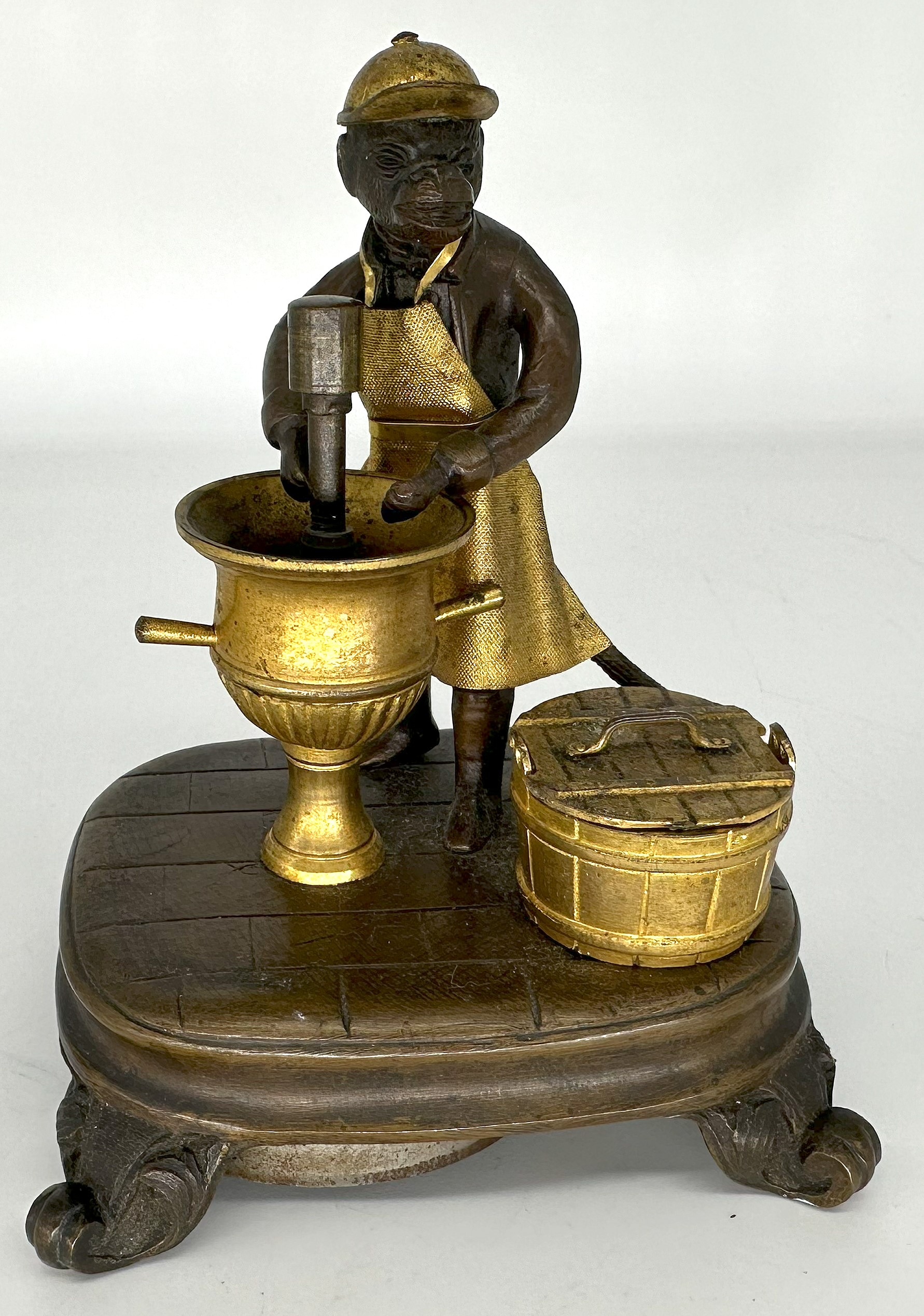 This inkstand features an anthropomorphic monkey dressed in an apron and hat, holding a pestle and appears to be grinding or crushing something inside an urn-like piece with fluted decoration which resembles a mortar. The “pestle” is the plunger to activate the bell incorporated to the underside of the inkstand. Unfortunately, the bell mechanism no longer works. The inkwell is found inside the bucket next to the monkey. The monkey’s coiled tail serves as a pen holder.