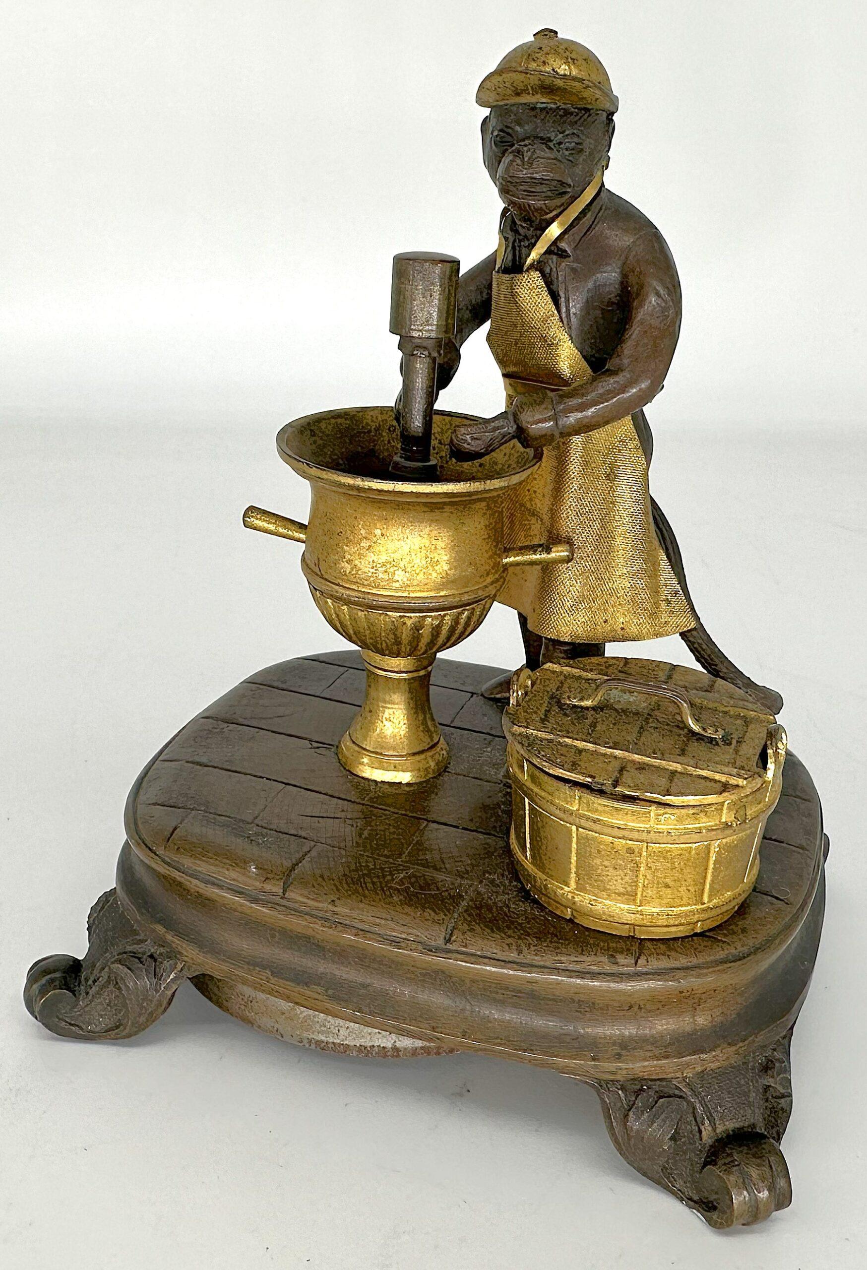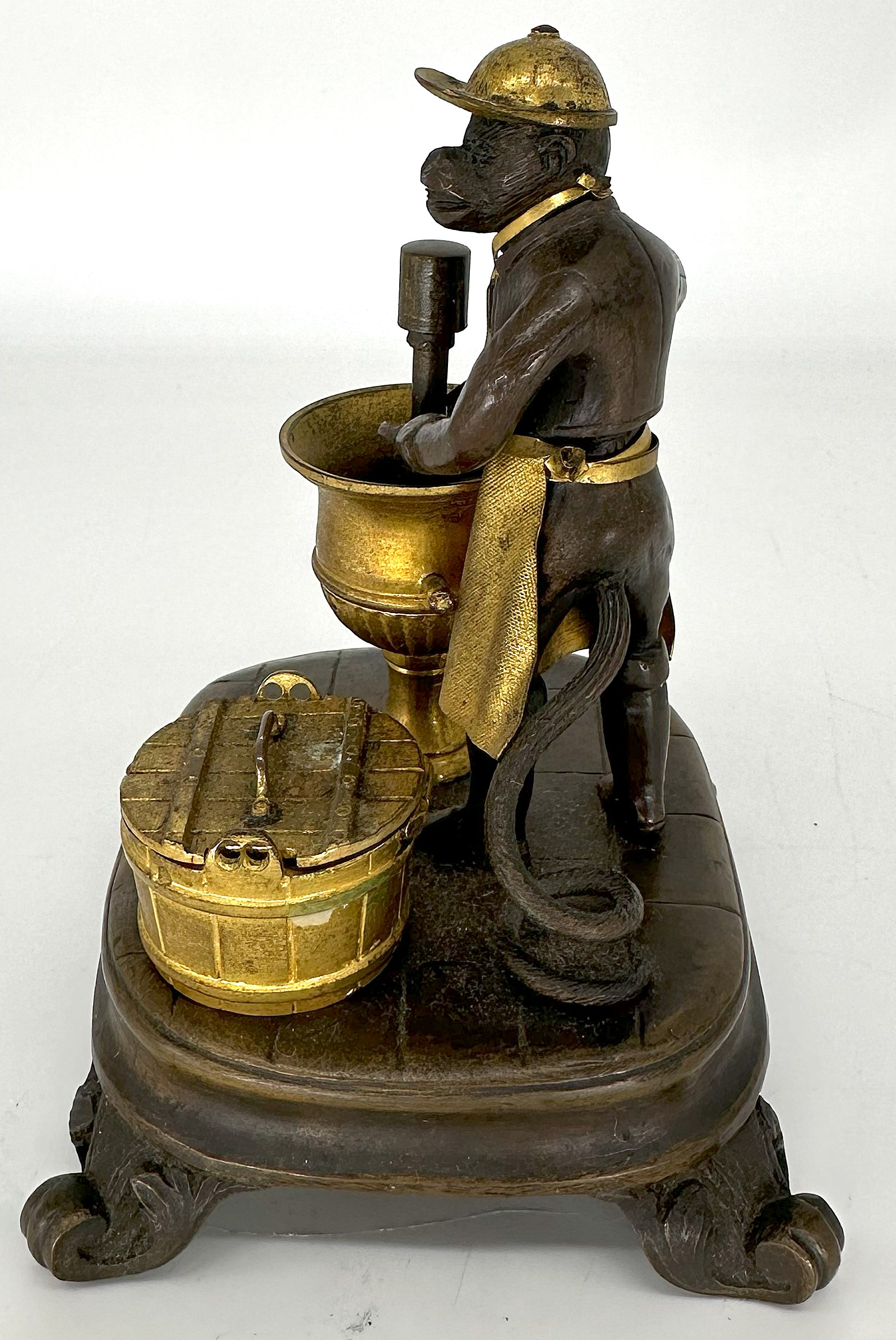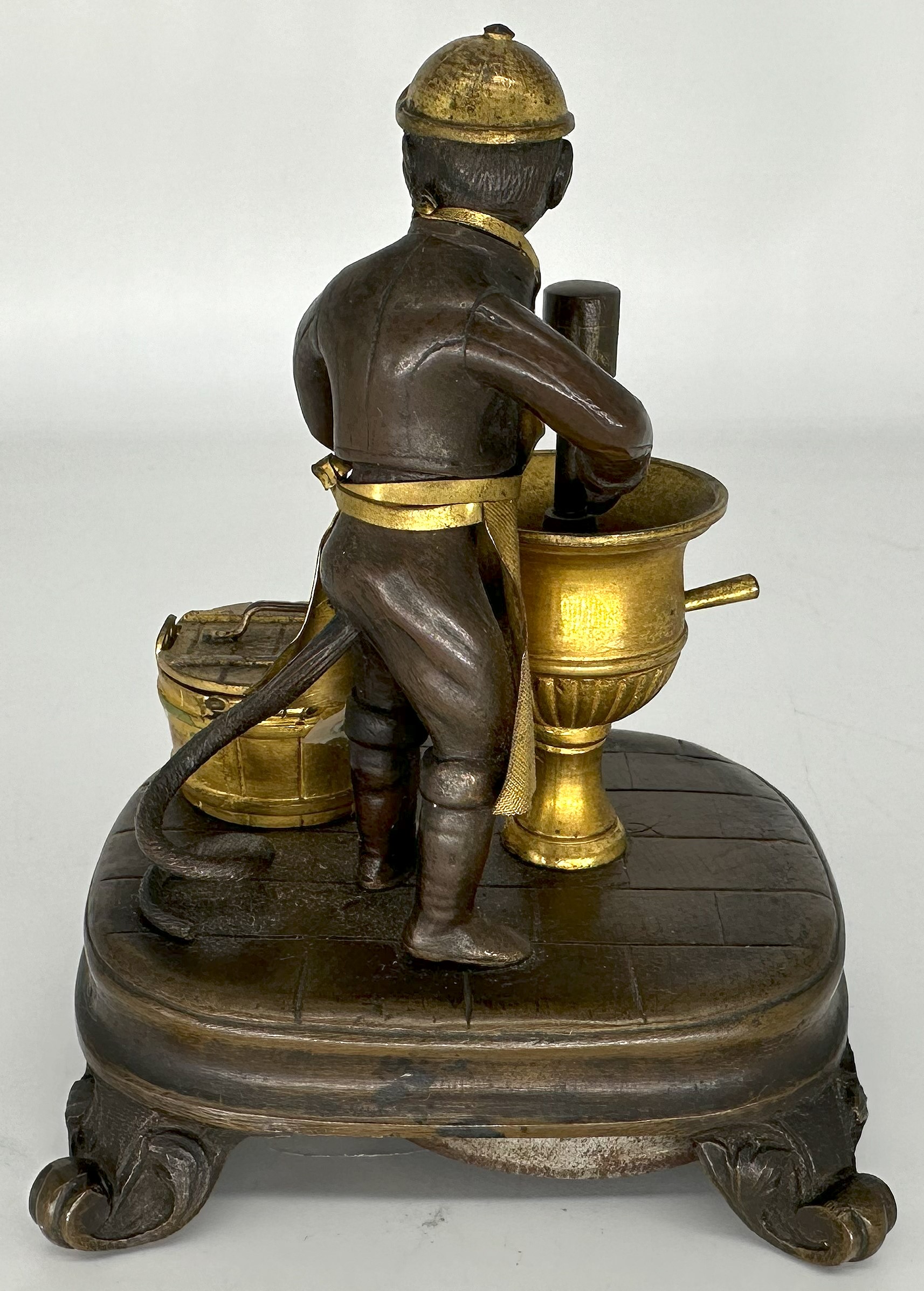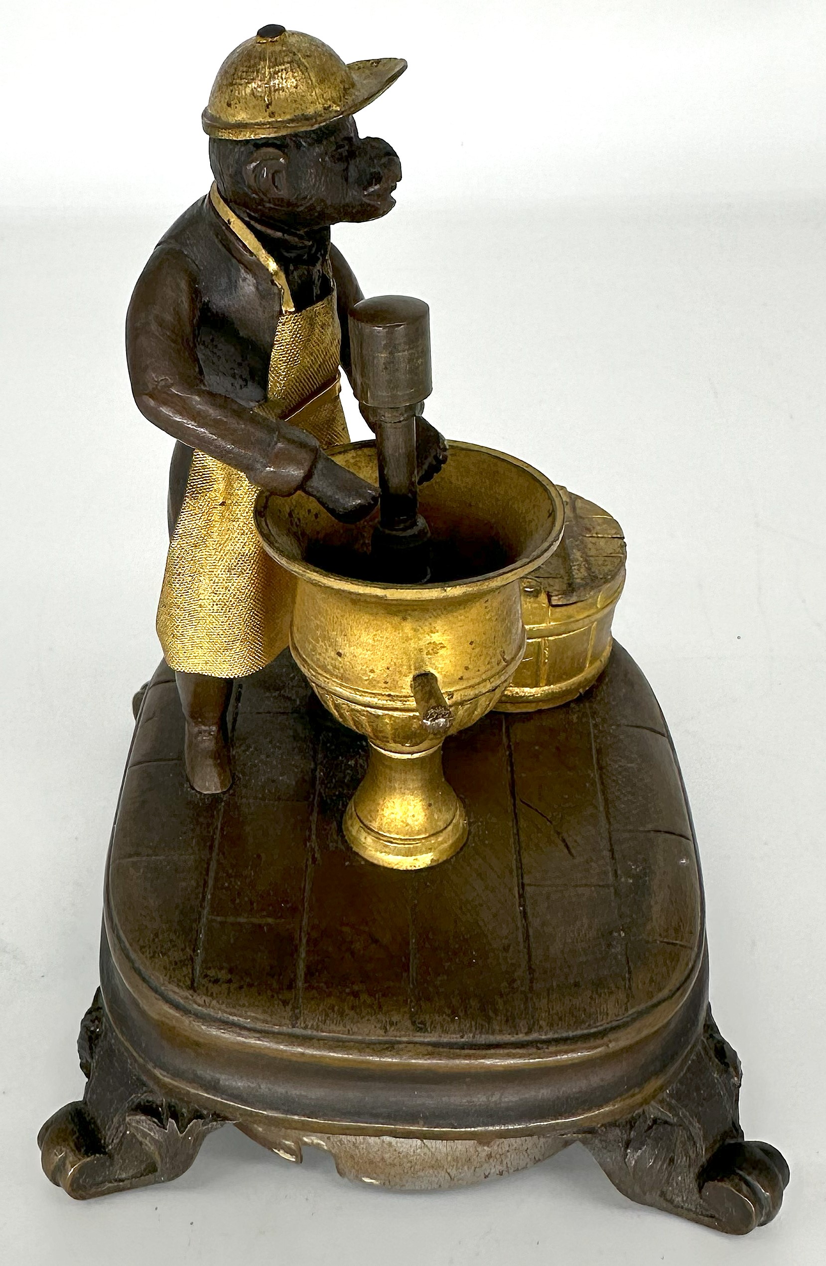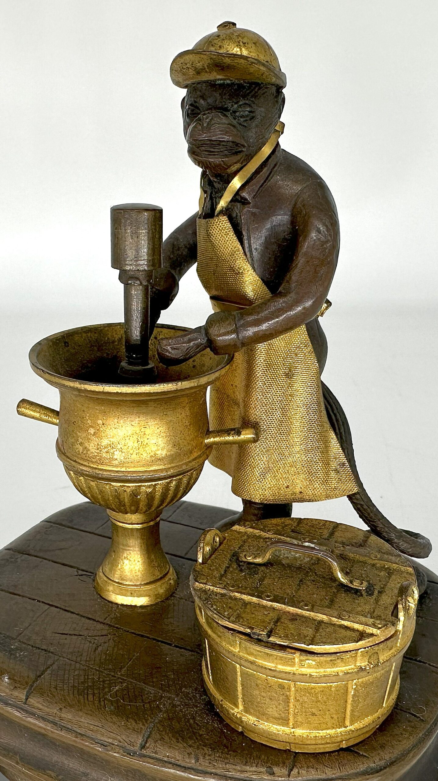 This inkstand features an anthropomorphic monkey dressed in an apron and hat, holding a pestle and appears to be grinding or crushing something inside an urn-like piece with fluted decoration which resembles a mortar. The “pestle” is the plunger to activate the bell incorporated to the underside of the inkstand. Unfortunately, the bell mechanism no longer works. The inkwell is found inside the bucket next to the monkey. The monkey’s coiled tail serves as a pen holder.