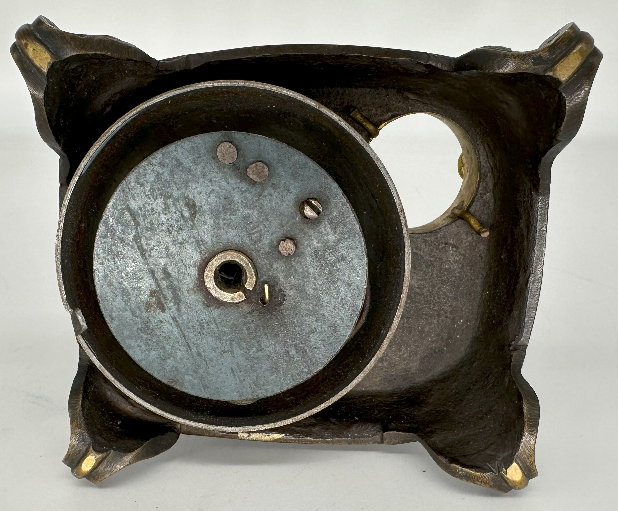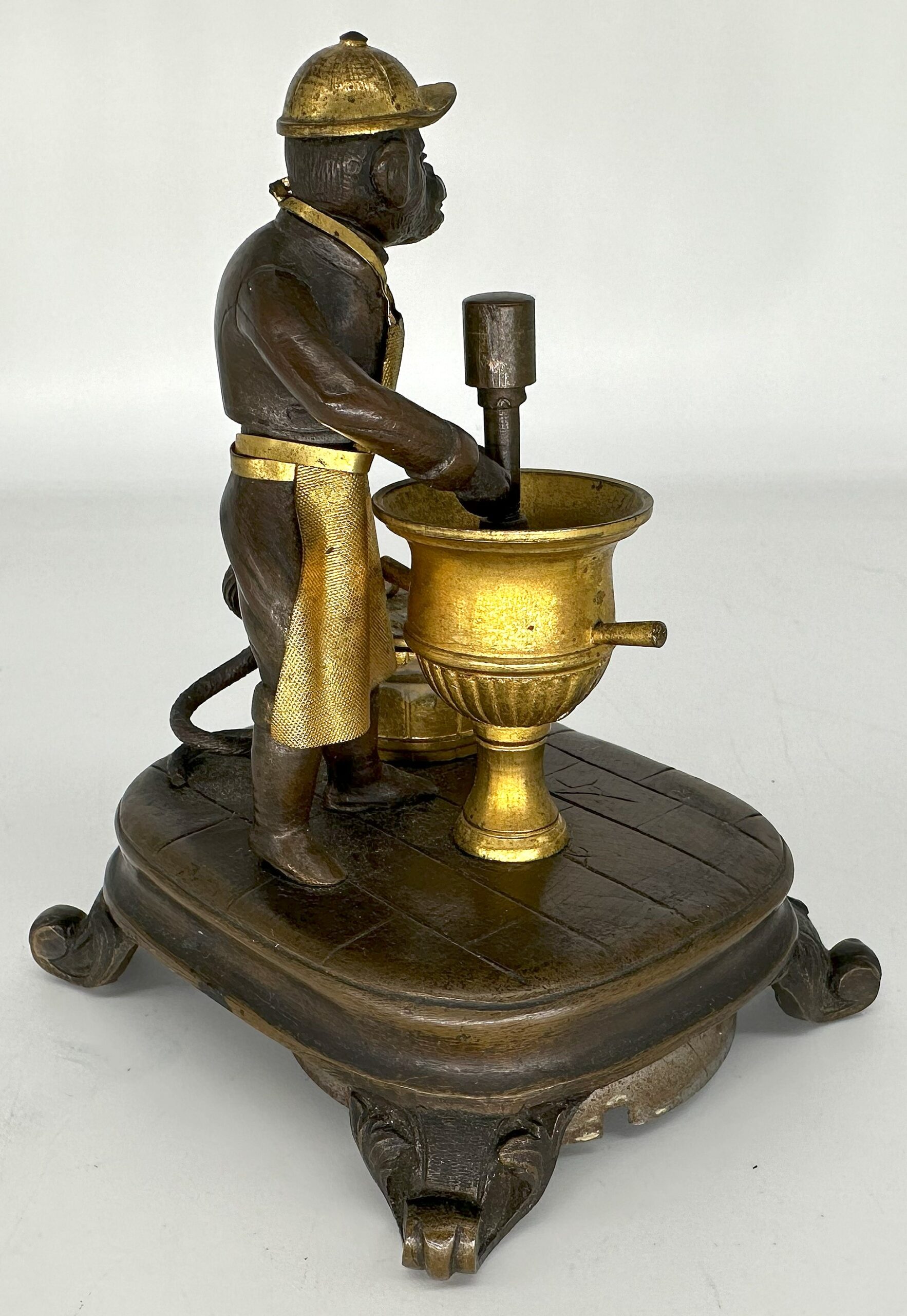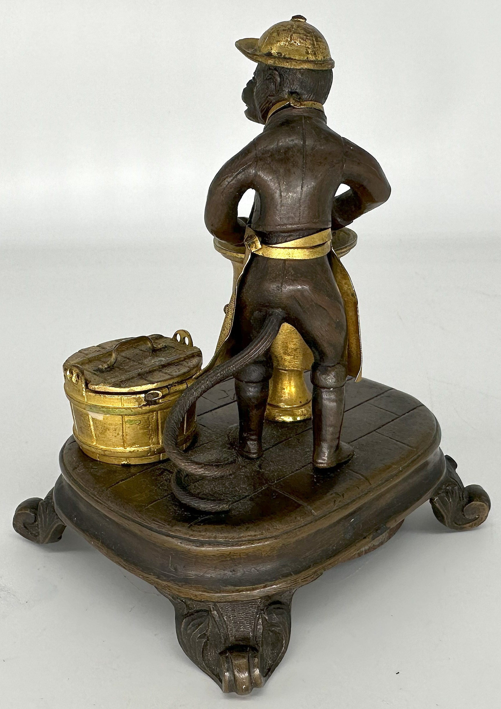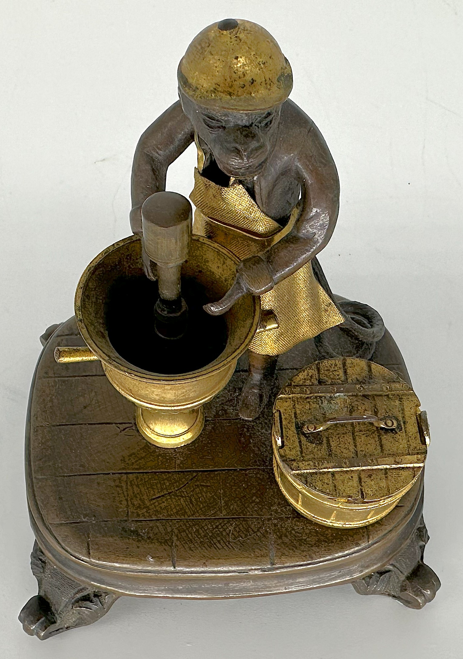 This inkstand features an anthropomorphic monkey dressed in an apron and hat, holding a pestle and appears to be grinding or crushing something inside an urn-like piece with fluted decoration which resembles a mortar. The “pestle” is the plunger to activate the bell incorporated to the underside of the inkstand. Unfortunately, the bell mechanism no longer works. The inkwell is found inside the bucket next to the monkey. The monkey’s coiled tail serves as a pen holder.
