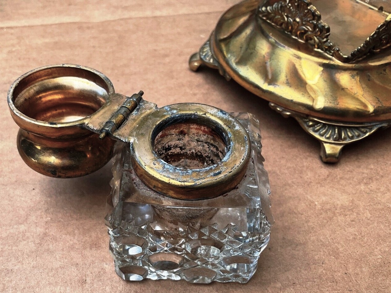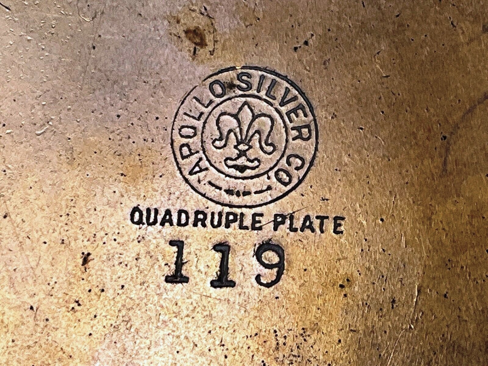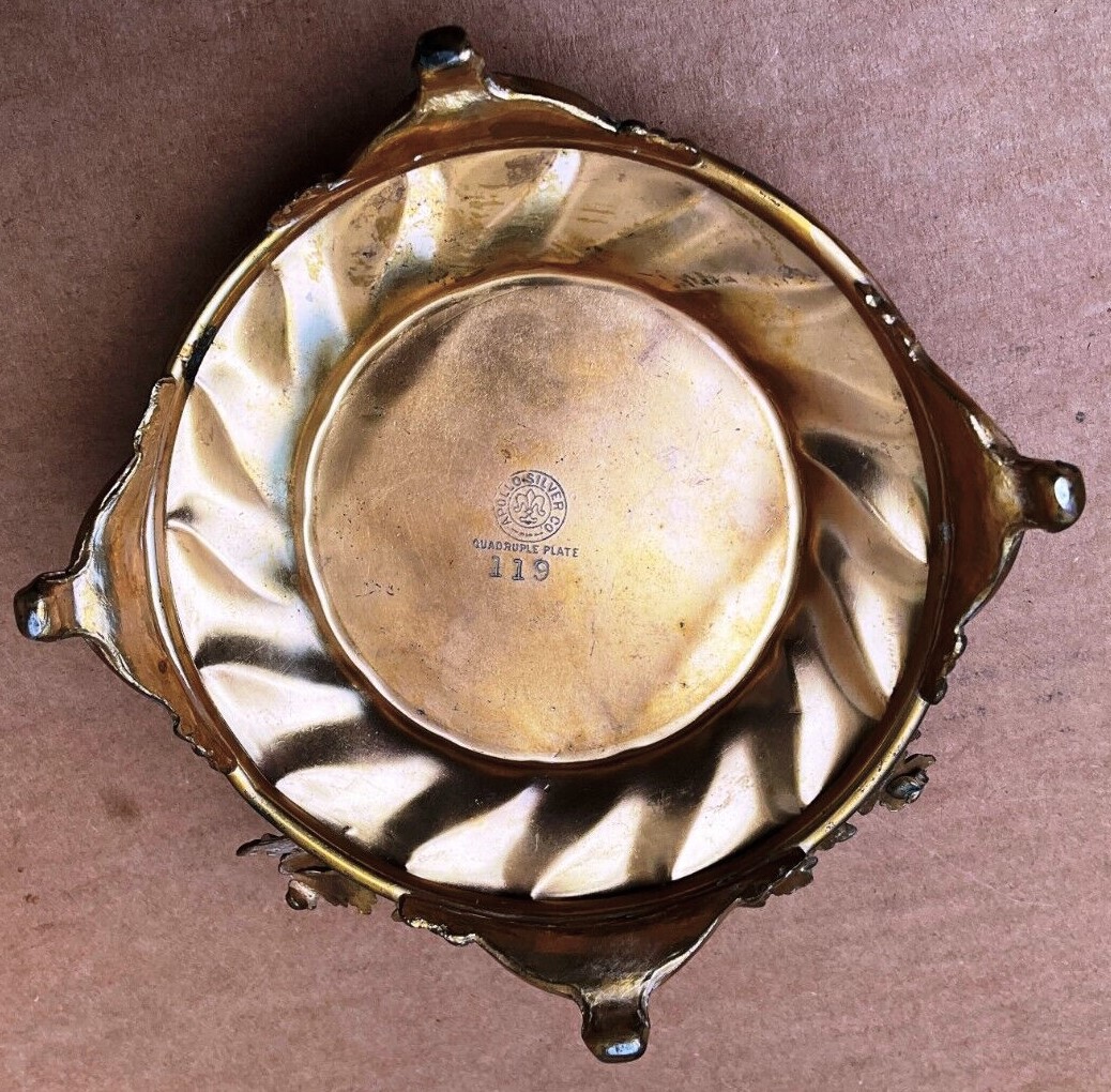 The underside of this inkstand is marked “Apollo Silver Co – Quadruple Plate – 119.” A glass inkwell with a hinged lid rests on a cast metal base. The pillow-type base with four legs has intricate leaf-like supports to hold the inkwell.