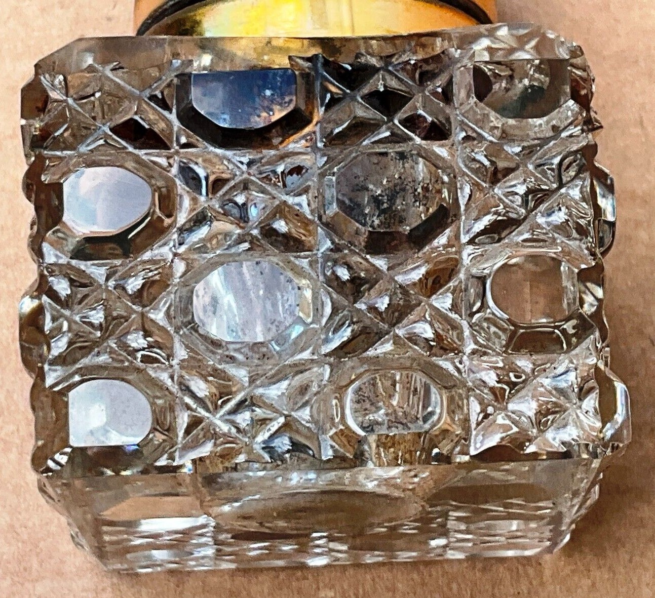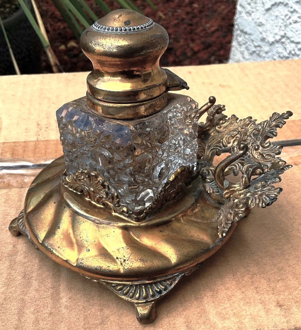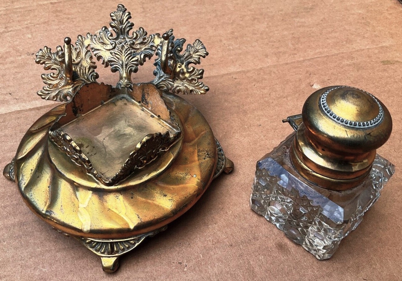 The underside of this inkstand is marked “Apollo Silver Co – Quadruple Plate – 119.” A glass inkwell with a hinged lid rests on a cast metal base. The pillow-type base with four legs has intricate leaf-like supports to hold the inkwell.