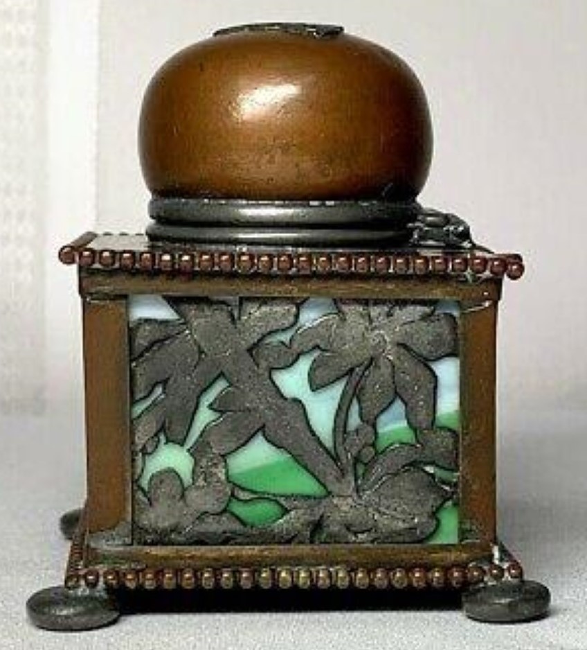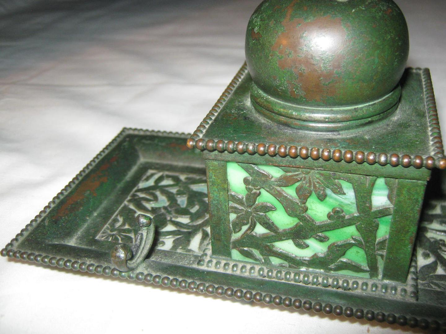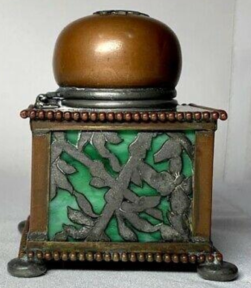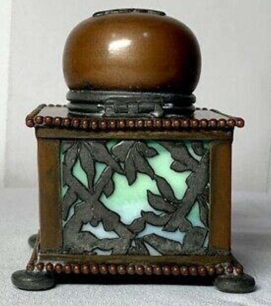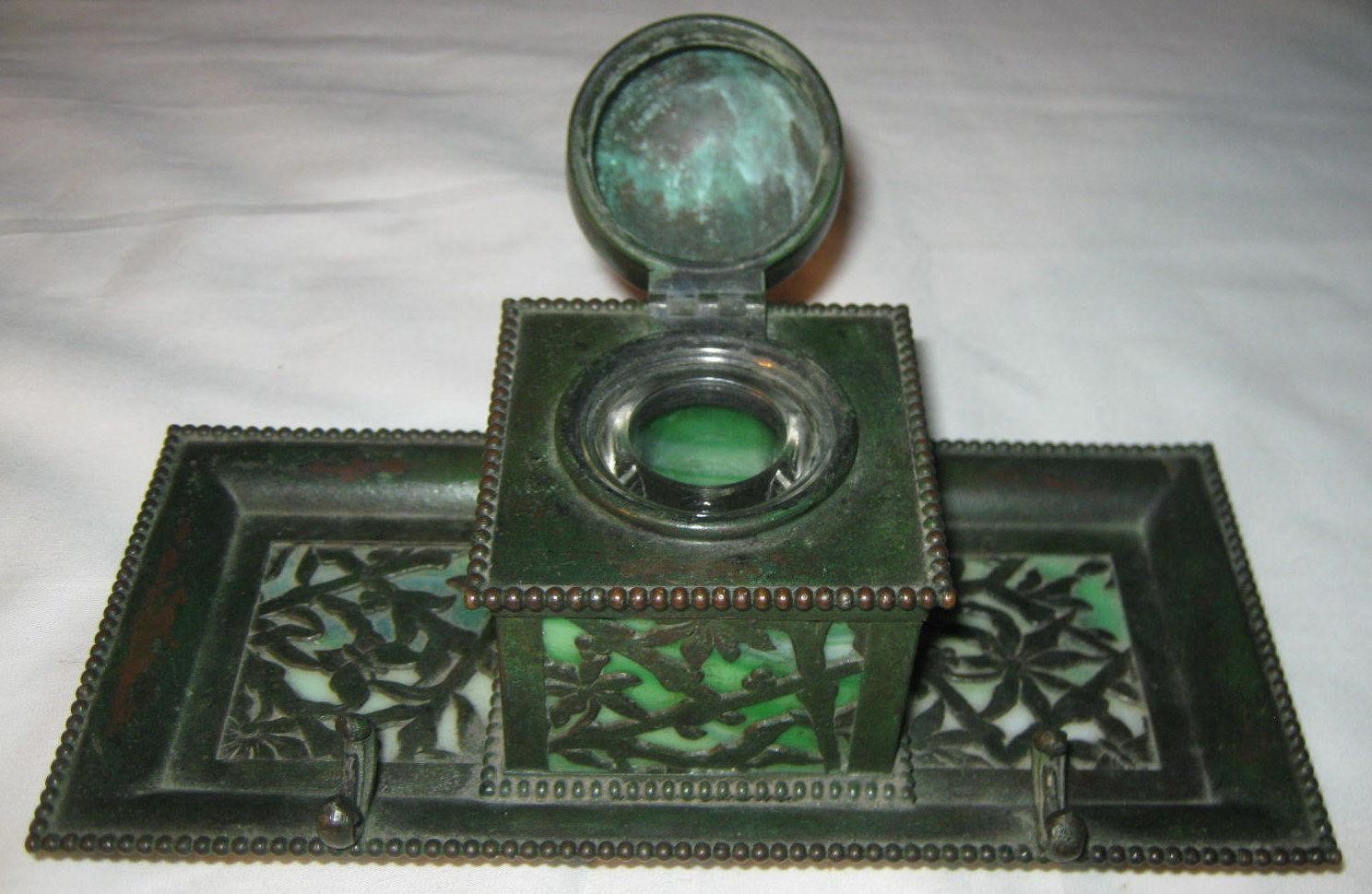 Modelled after Tiffany pieces, this inkwell features green opalescent Favrile glass against an overlaid pattern of clematis flowers against a trellis or lattice. It has a decorative beaded border edge, a domed lid, and flat bun style feet.