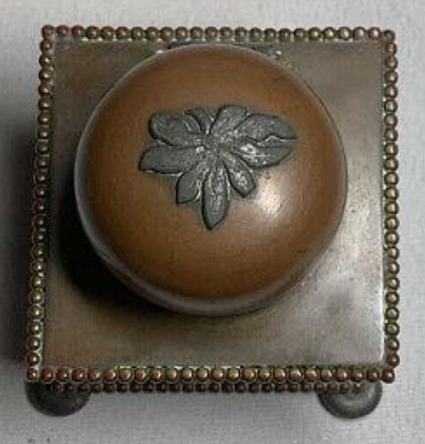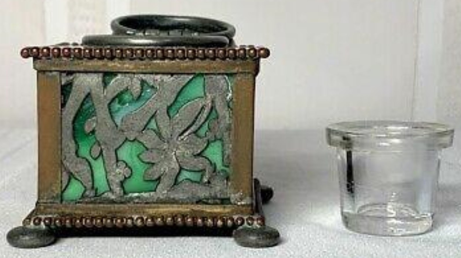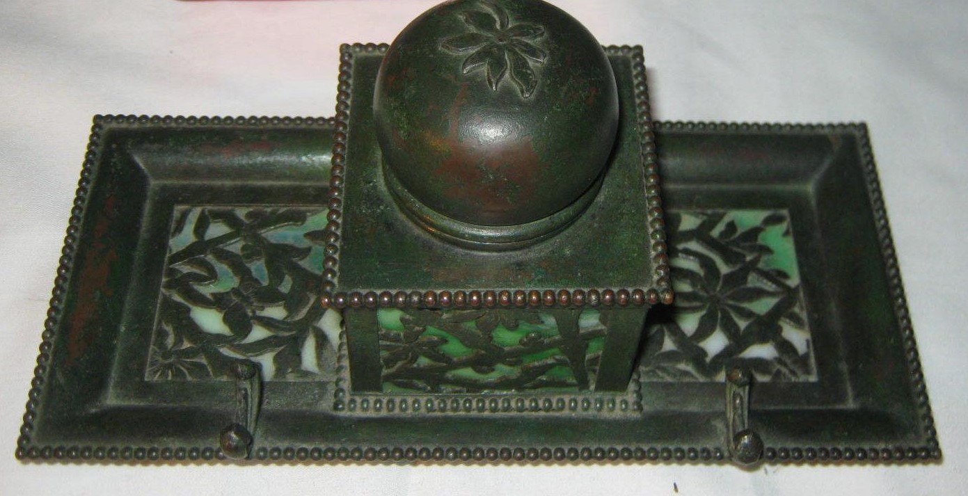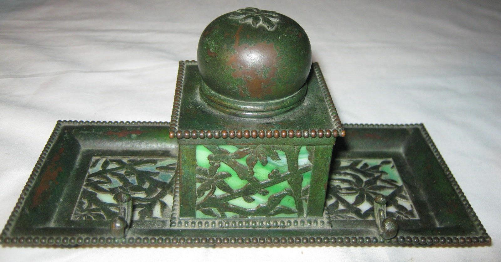 Modelled after Tiffany pieces, this inkwell features green opalescent Favrile glass against an overlaid pattern of clematis flowers against a trellis or lattice. It has a decorative beaded border edge, a domed lid, and flat bun style feet.