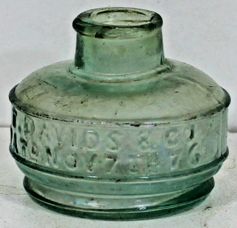 An aqua glass ink bottle with hand finished lip embossed on the front “T. DAVIDS & Co. PAT’d NOV 7th 76”.