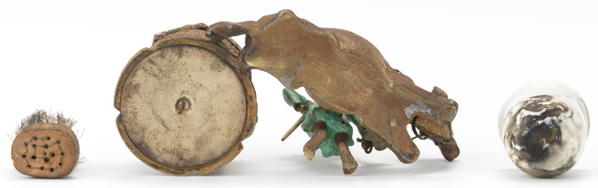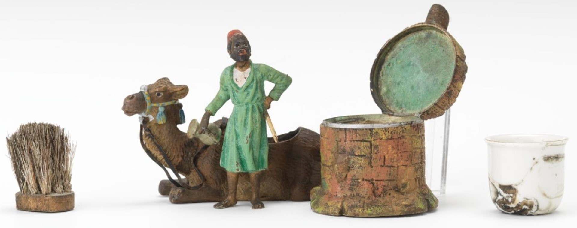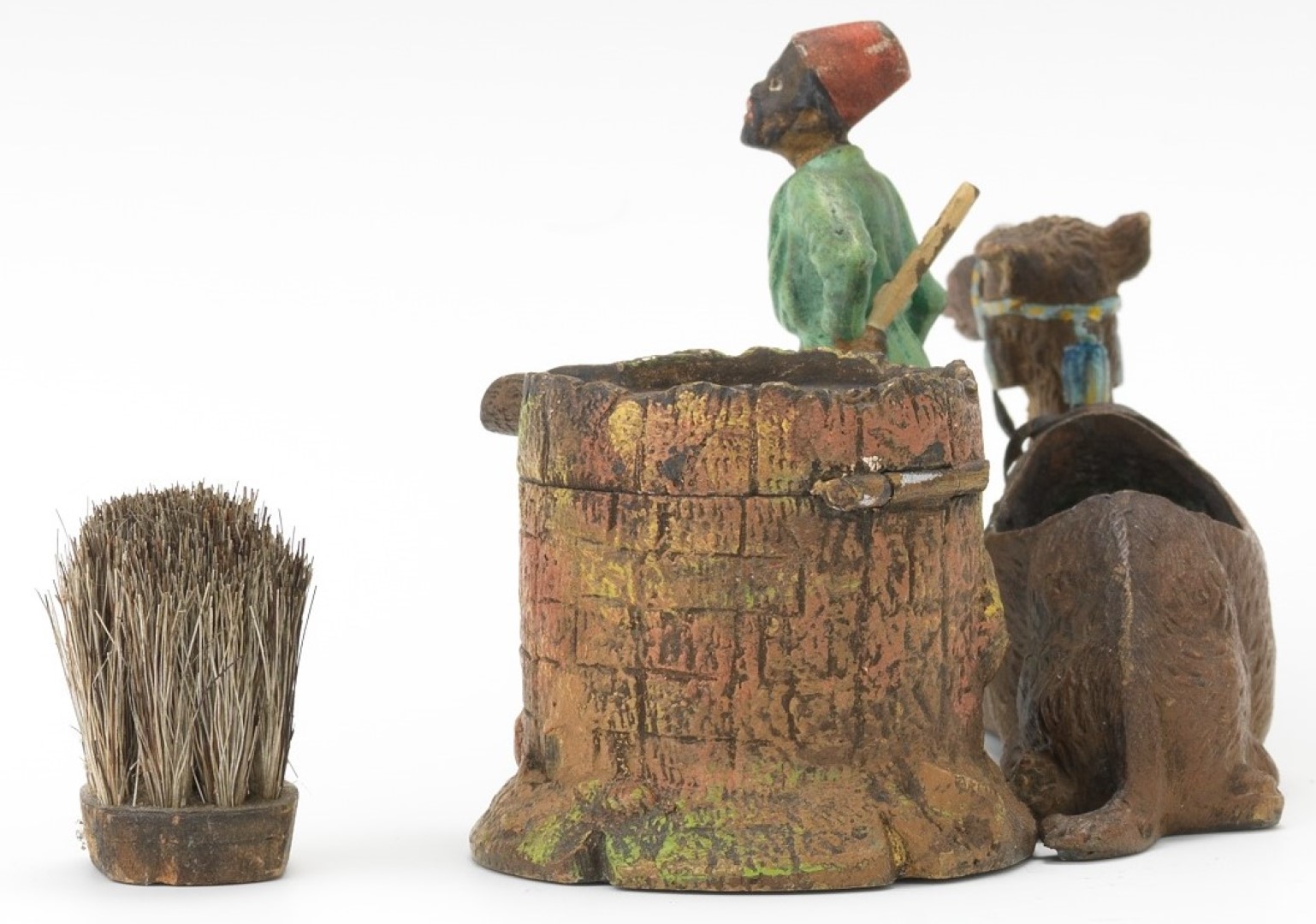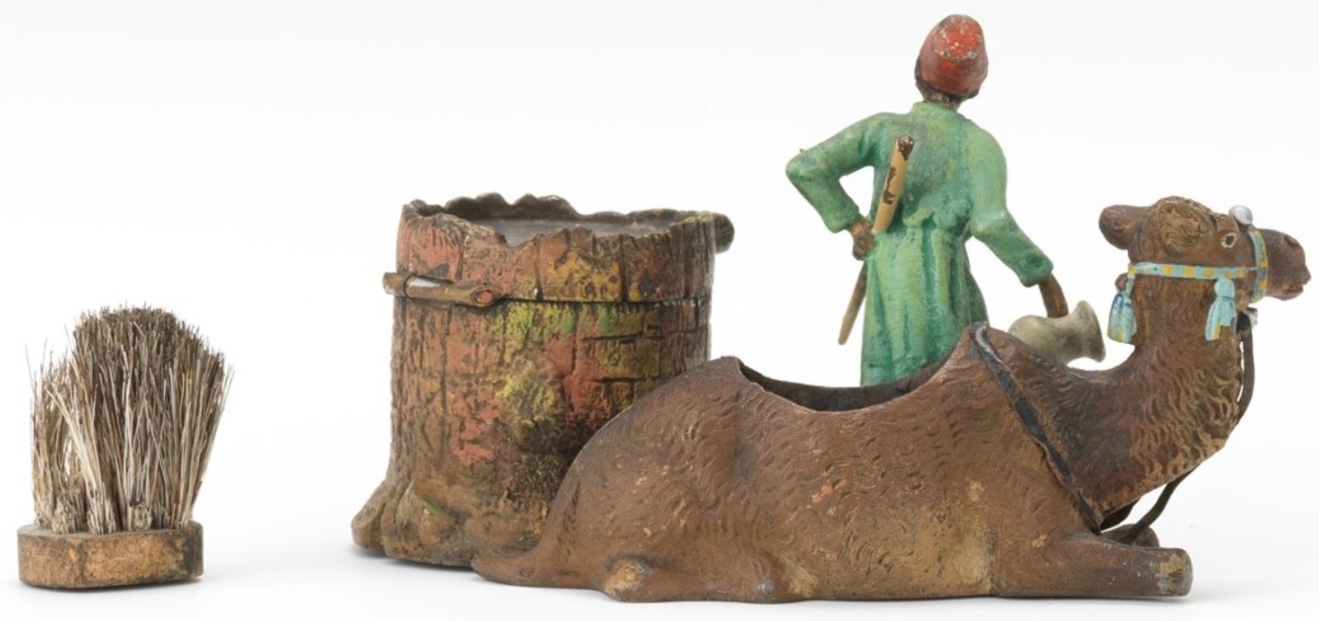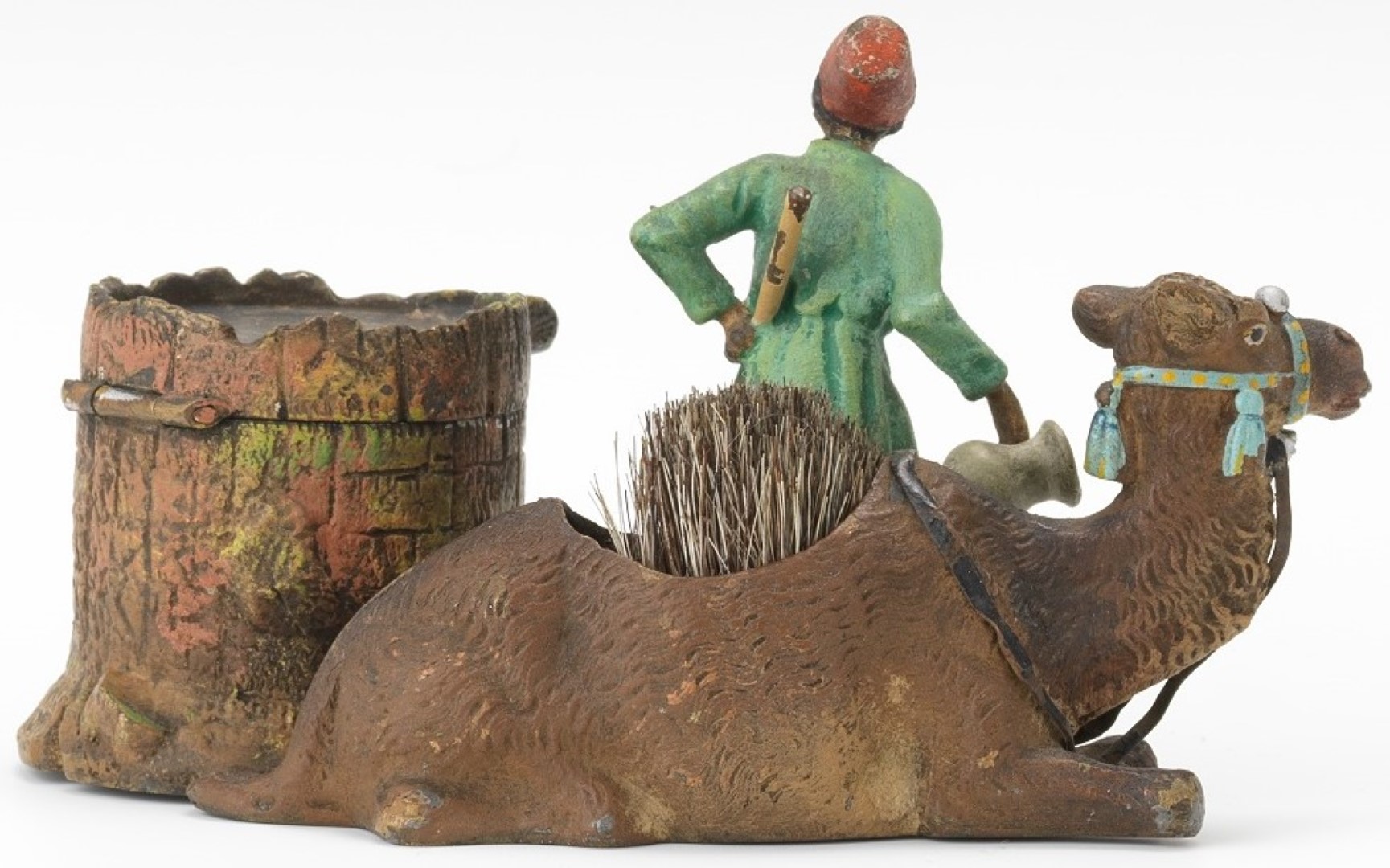 A cold painted metal figural inkwell in the form of an Arab standing next to a camel and a brick water well. The man carries a water jug and a stick. The camel’s hump is a pen wipe. The water well is an inkwell and has a porcelain insert.
