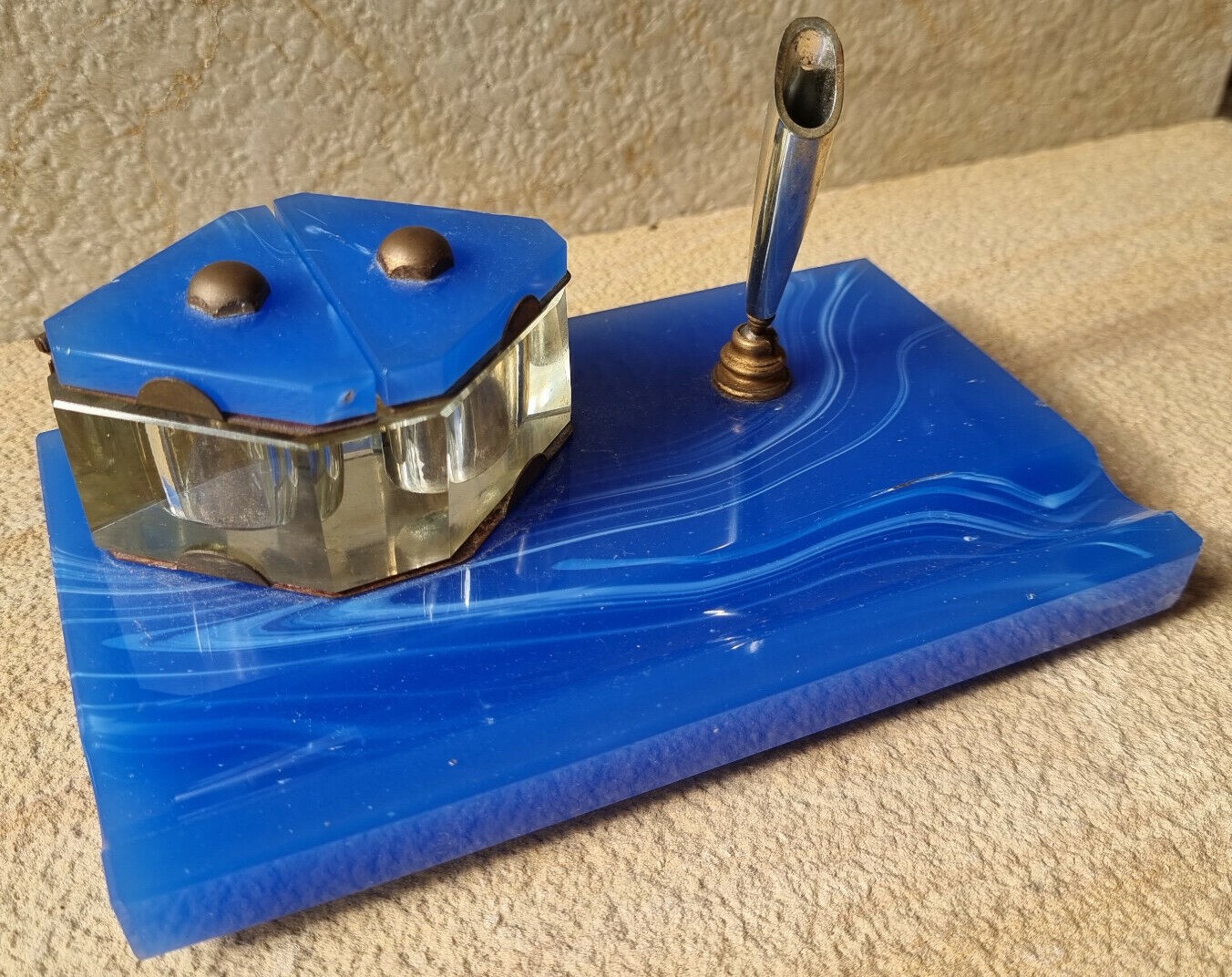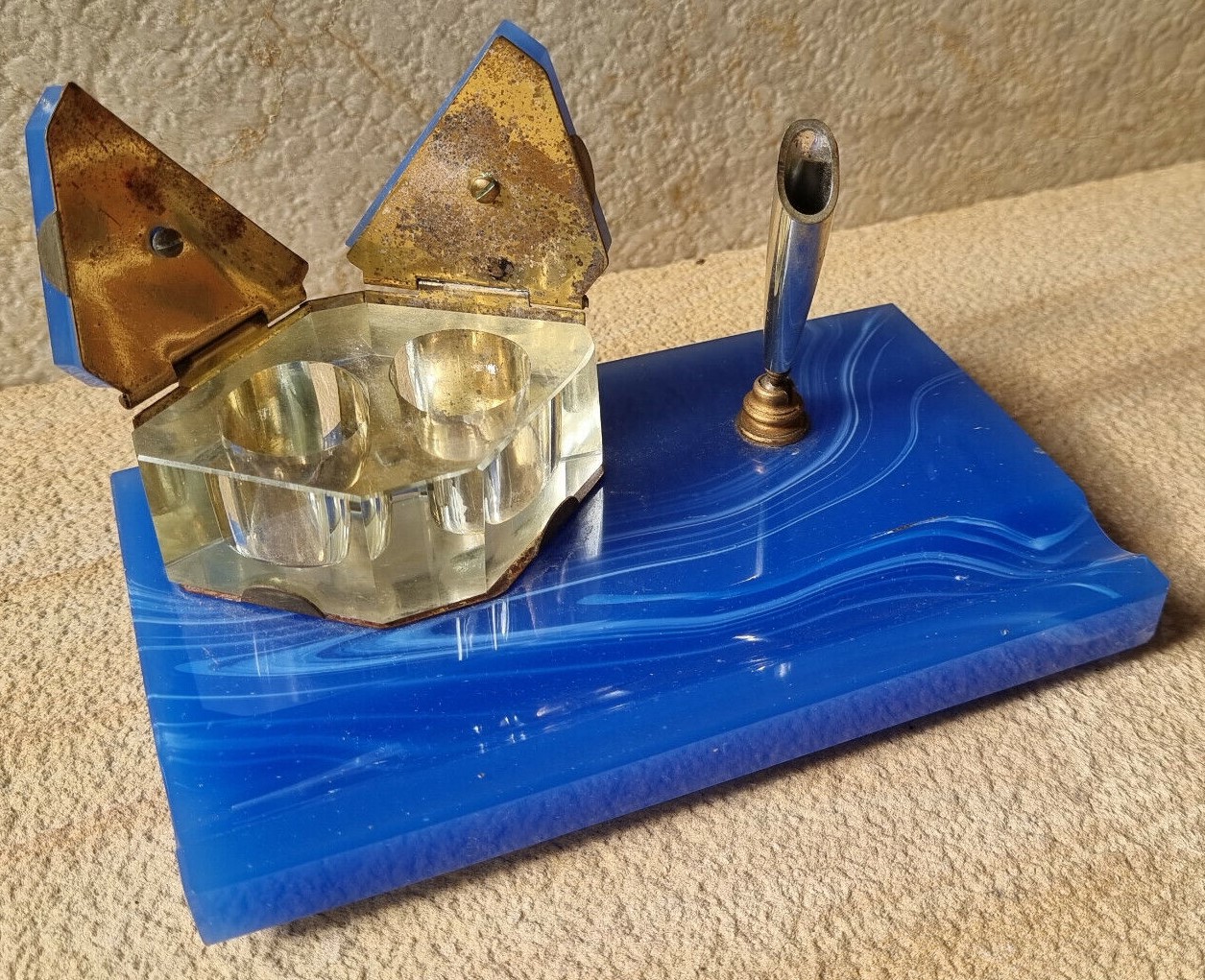 Art Deco blue glass desk piece with double inkwell and pen holder. The base and the inkwell lids are made of heavy blue glass with a wave pattern through it. The metal parts are made of brass. There is a swivel holder for a pen and a pen channel in the front.