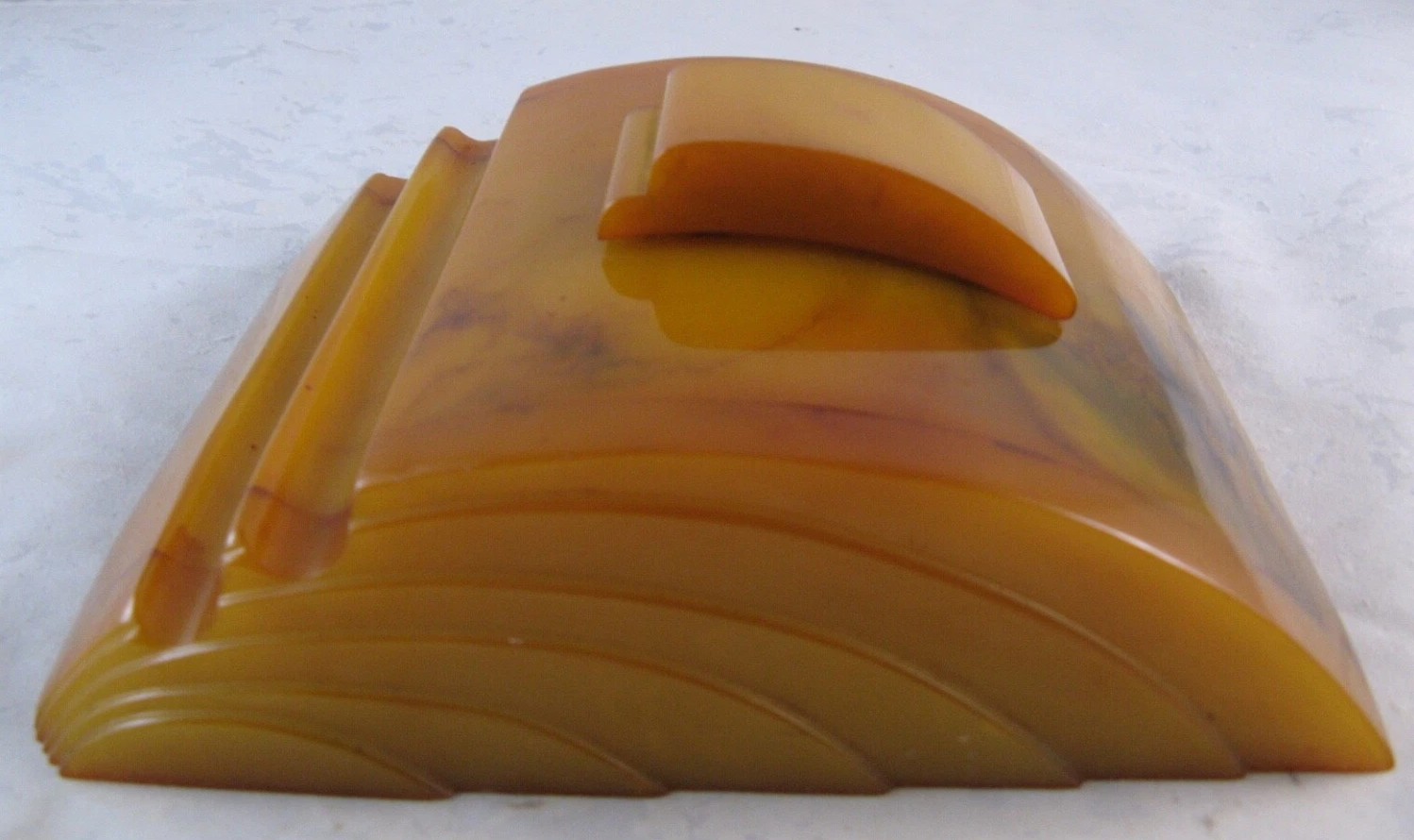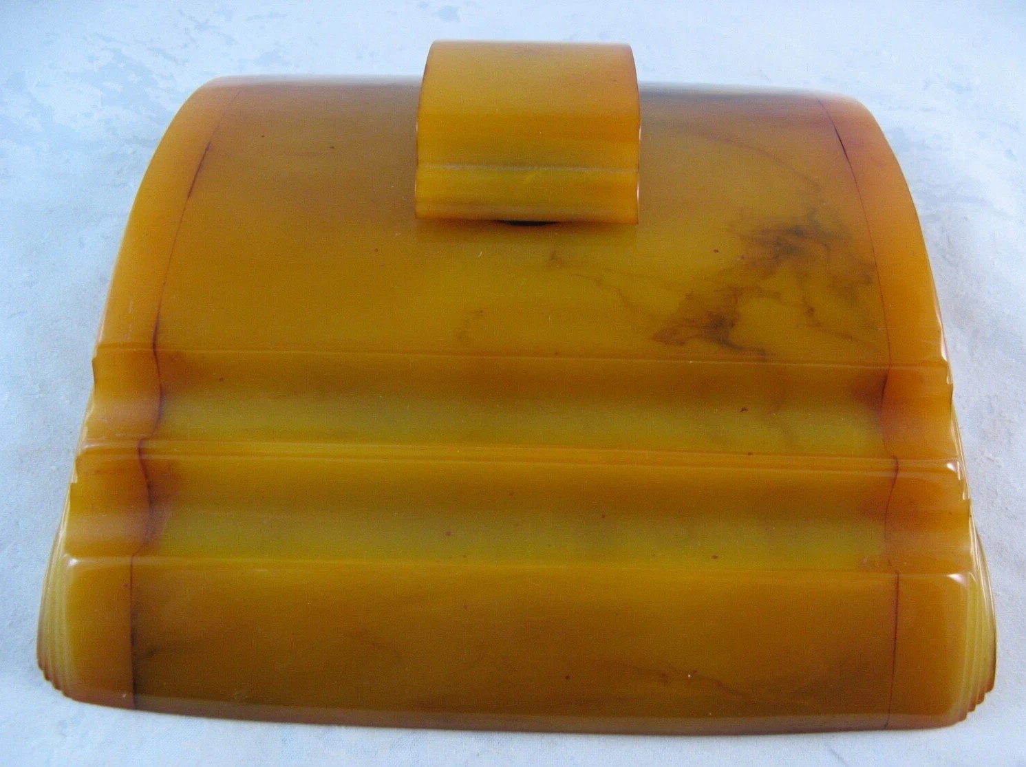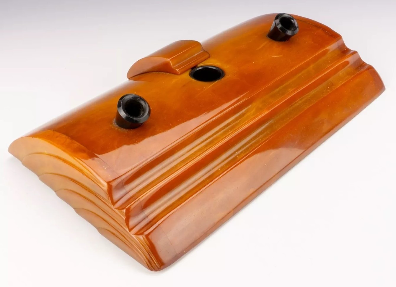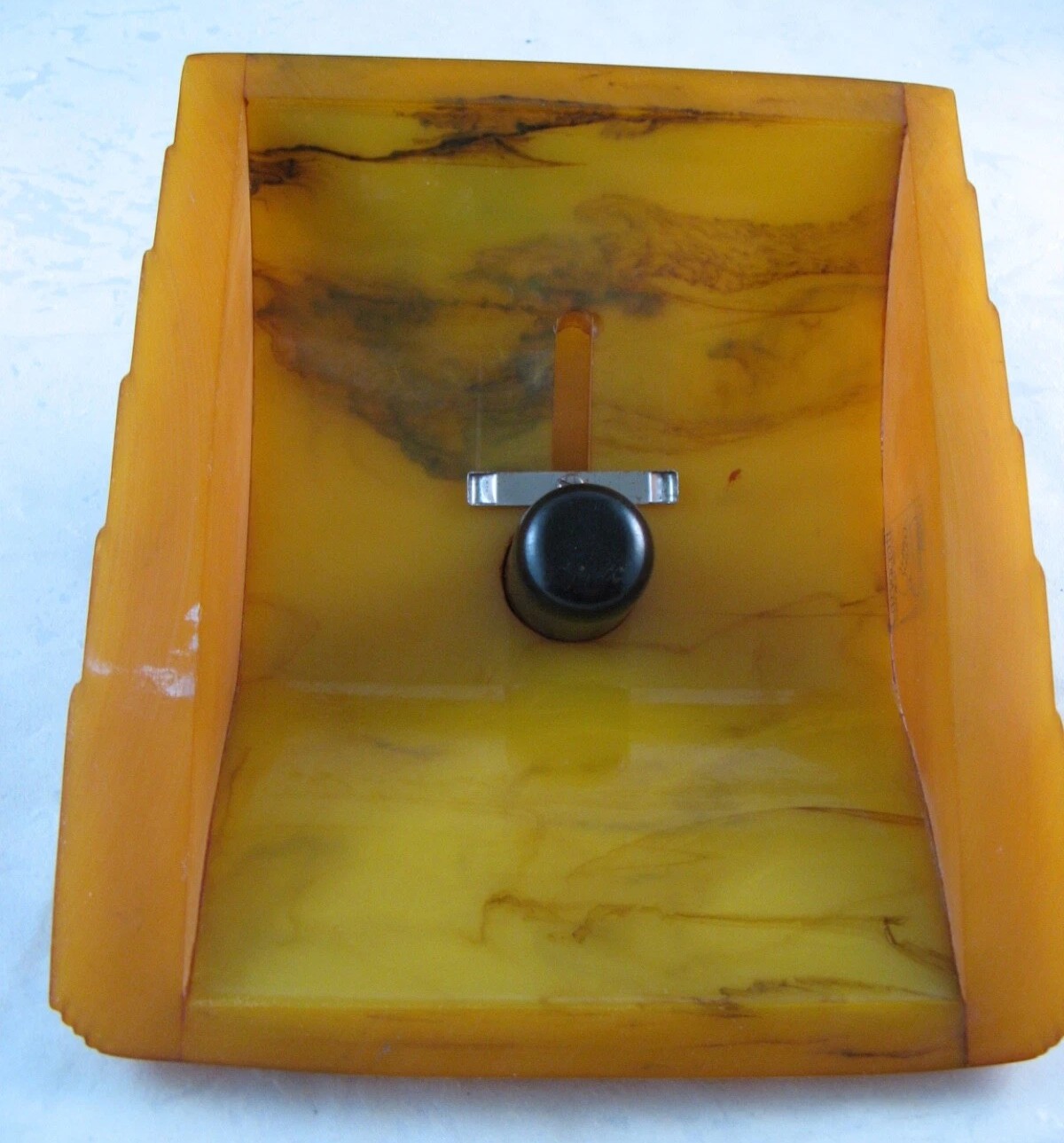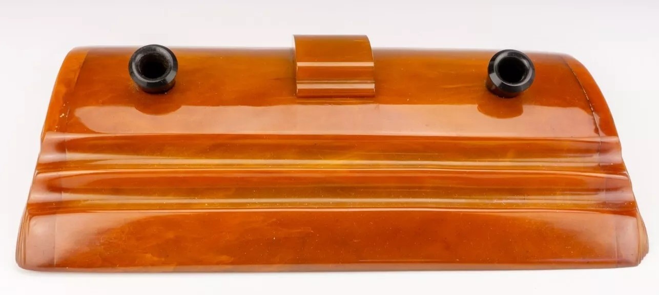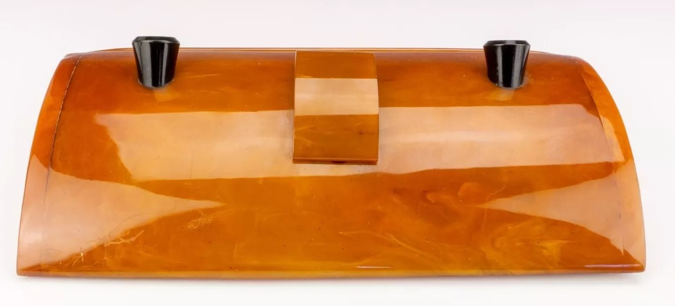Presented is an Art Deco “Carvacraft” butterscotch double inkwell made by John Dickinson & Co Ltd. Red and black inkwells with liners are revealed when sliders are pulled back. There are two slots for pens in the front. Great Art Deco design with the Carvacraft label visible on the underside.