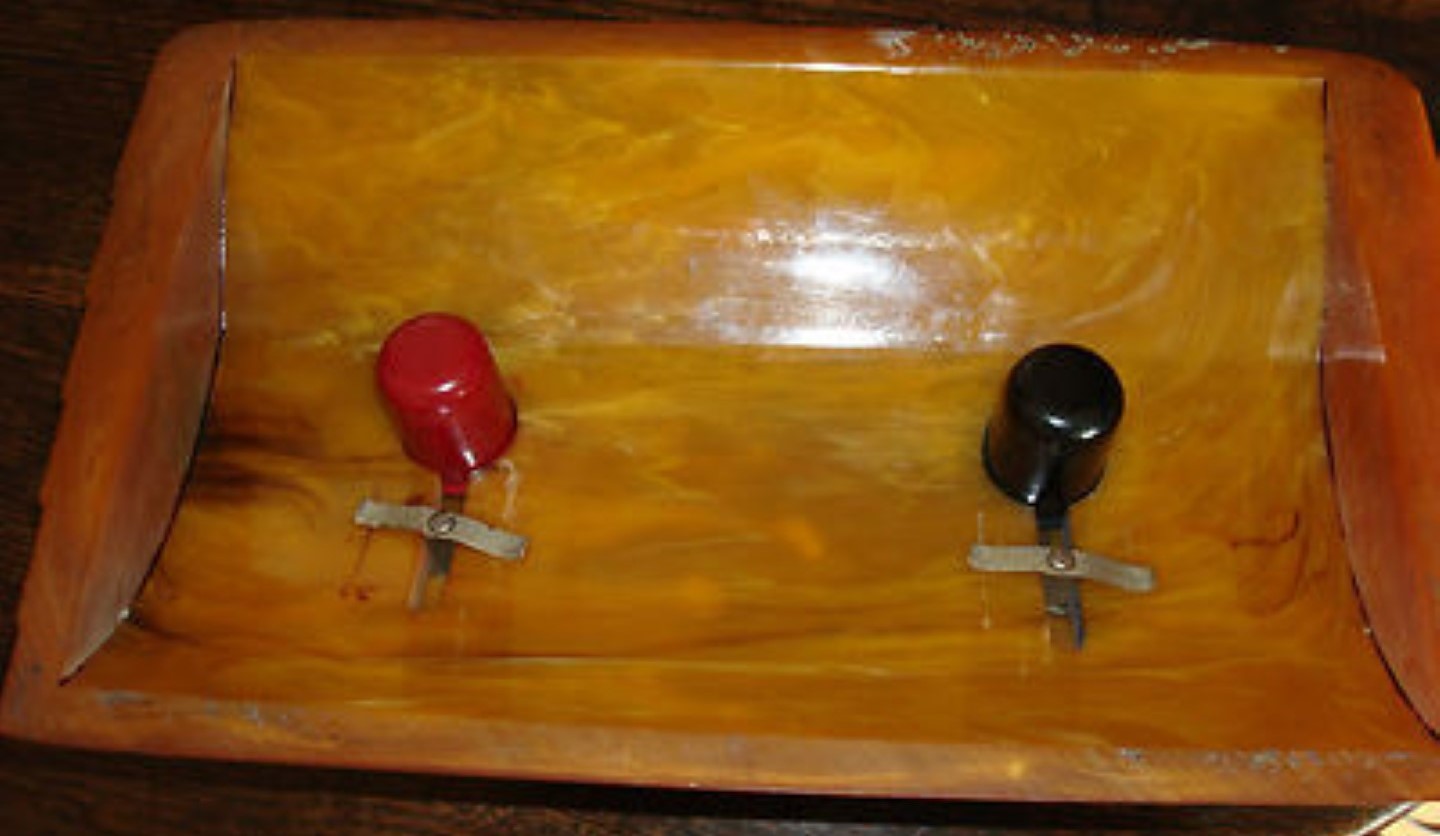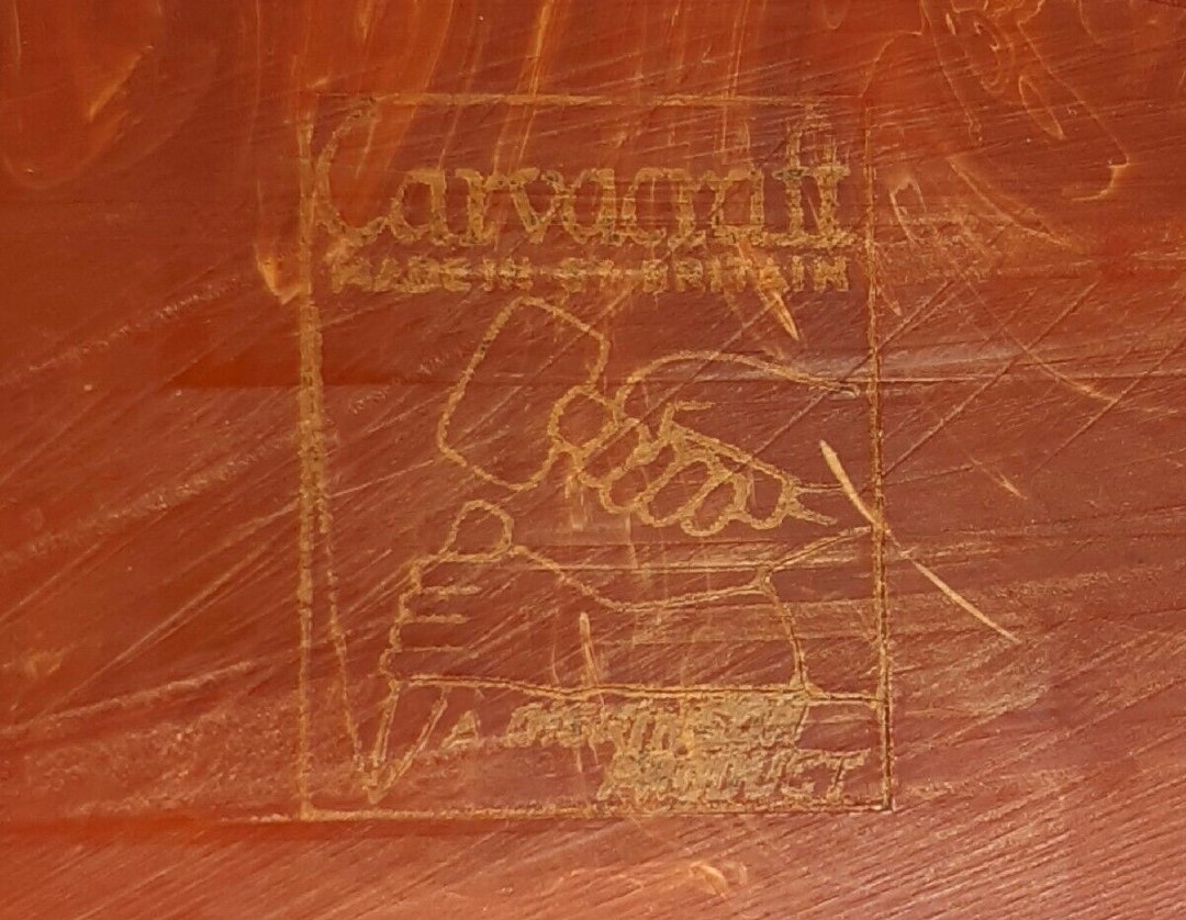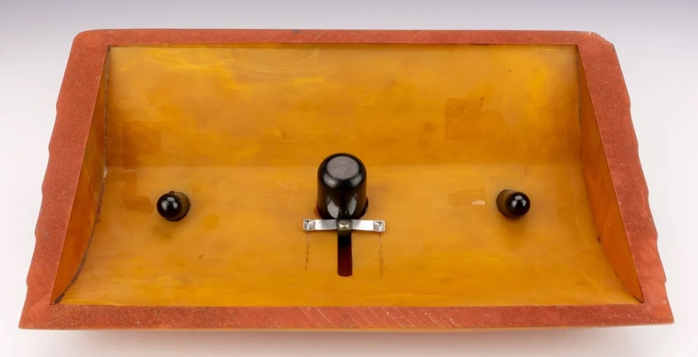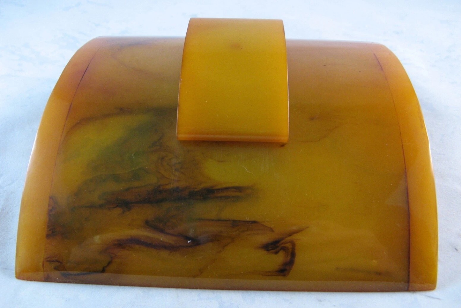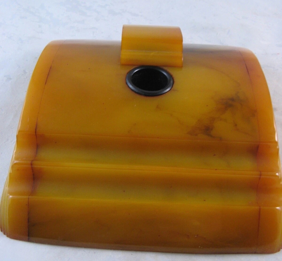 Presented is an Art Deco “Carvacraft” butterscotch double inkwell made by John Dickinson & Co Ltd. Red and black inkwells with liners are revealed when sliders are pulled back. There are two slots for pens in the front. Great Art Deco design with the Carvacraft label visible on the underside.