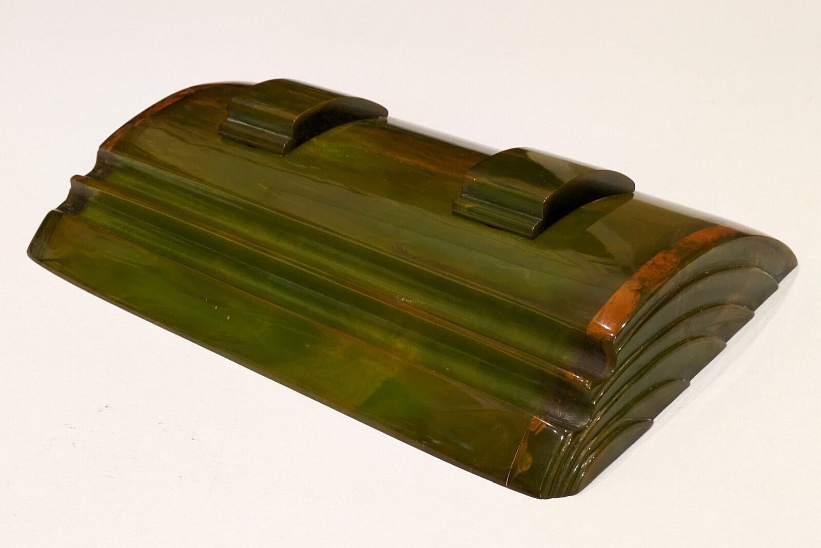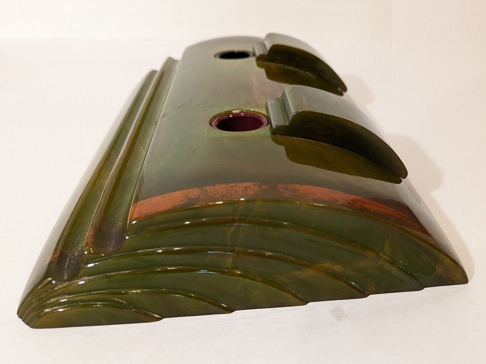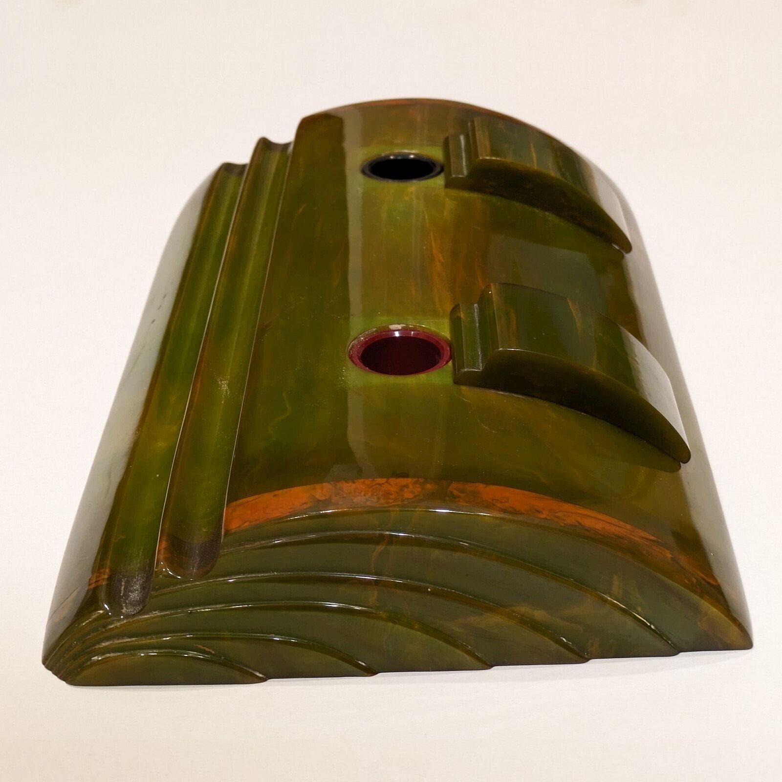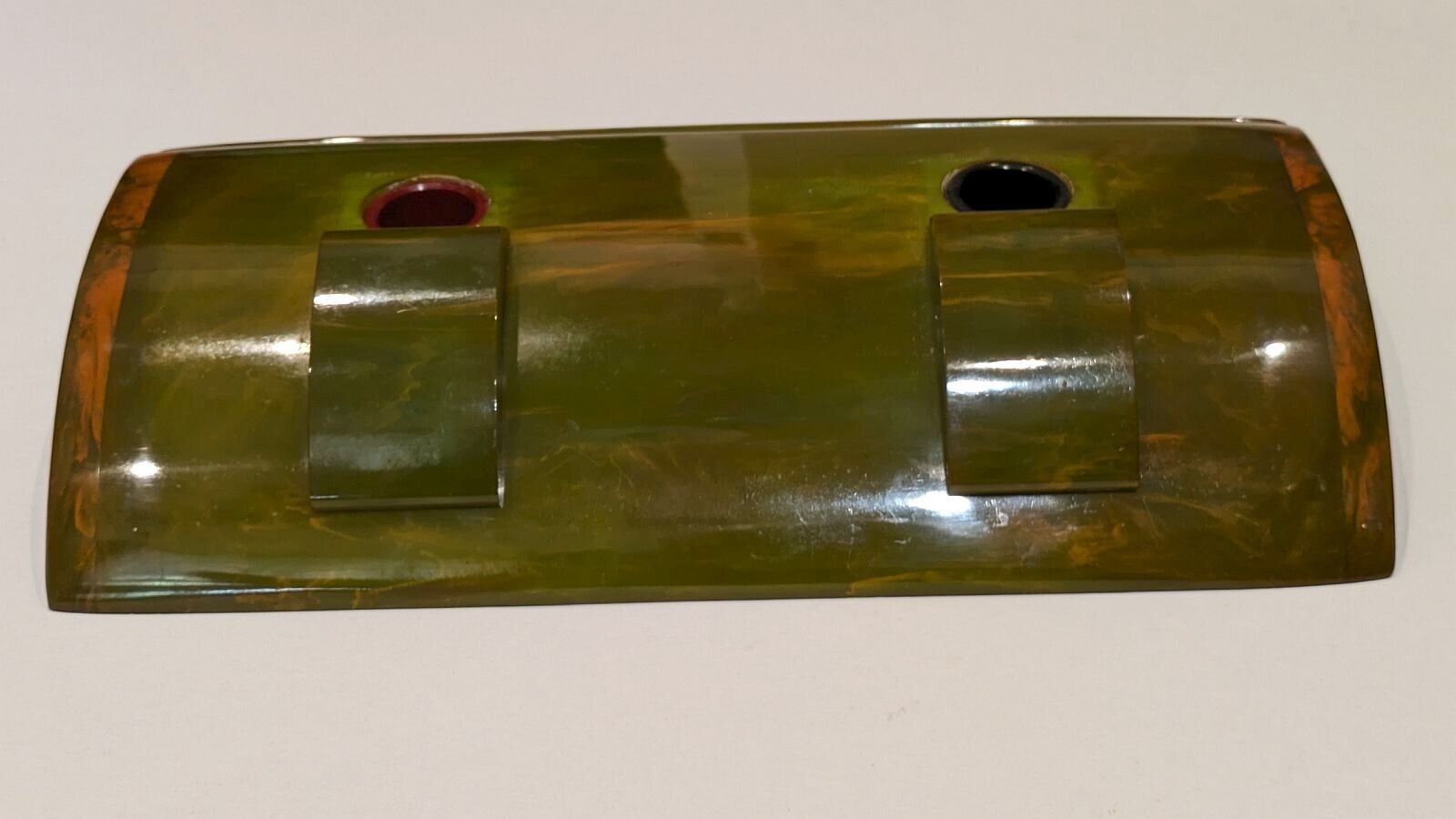 Example #2: Art Deco double inkwell in Phenolic Bakelite Catalin by Carvacraft – green with highlights in swirling orange.