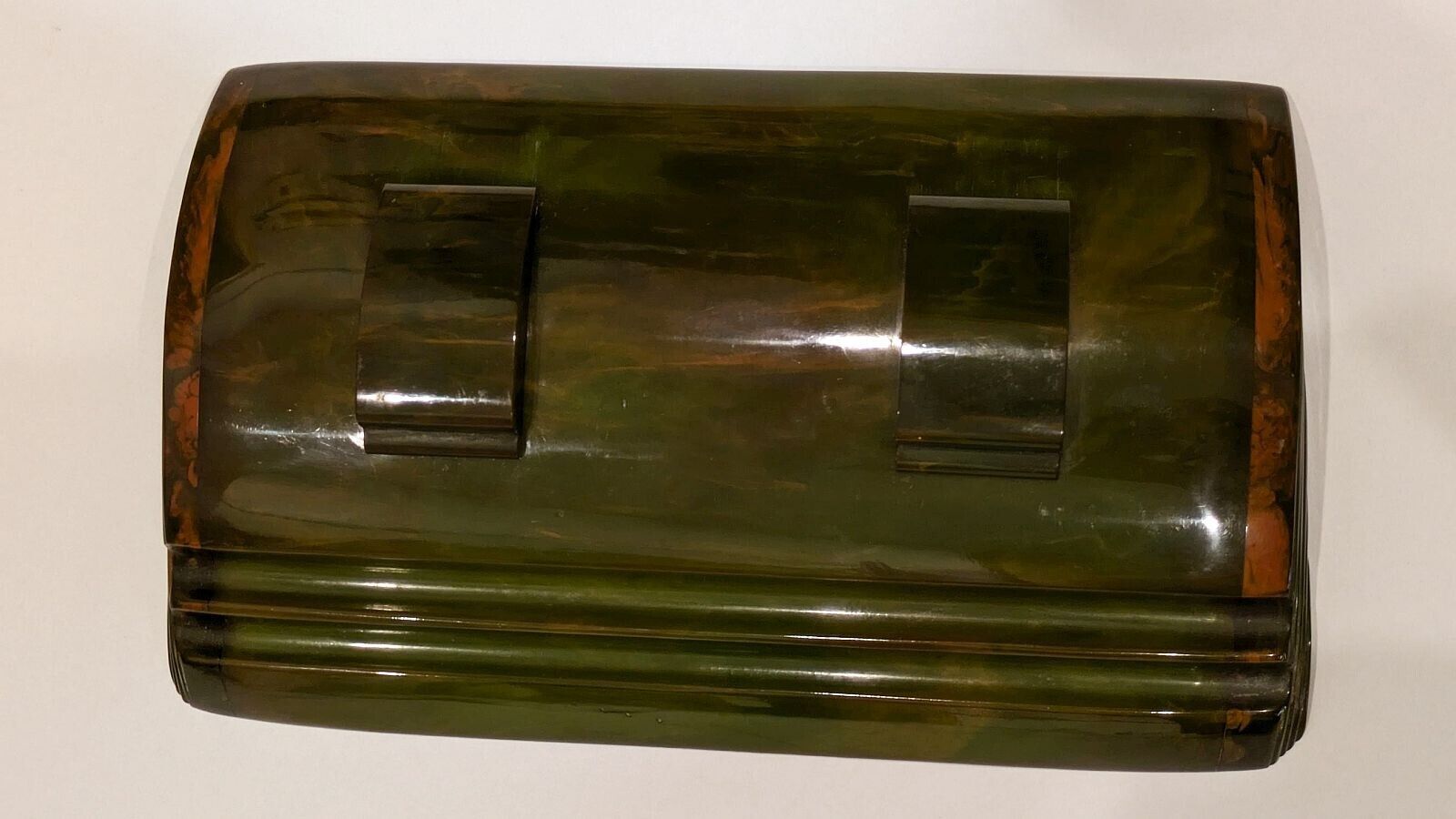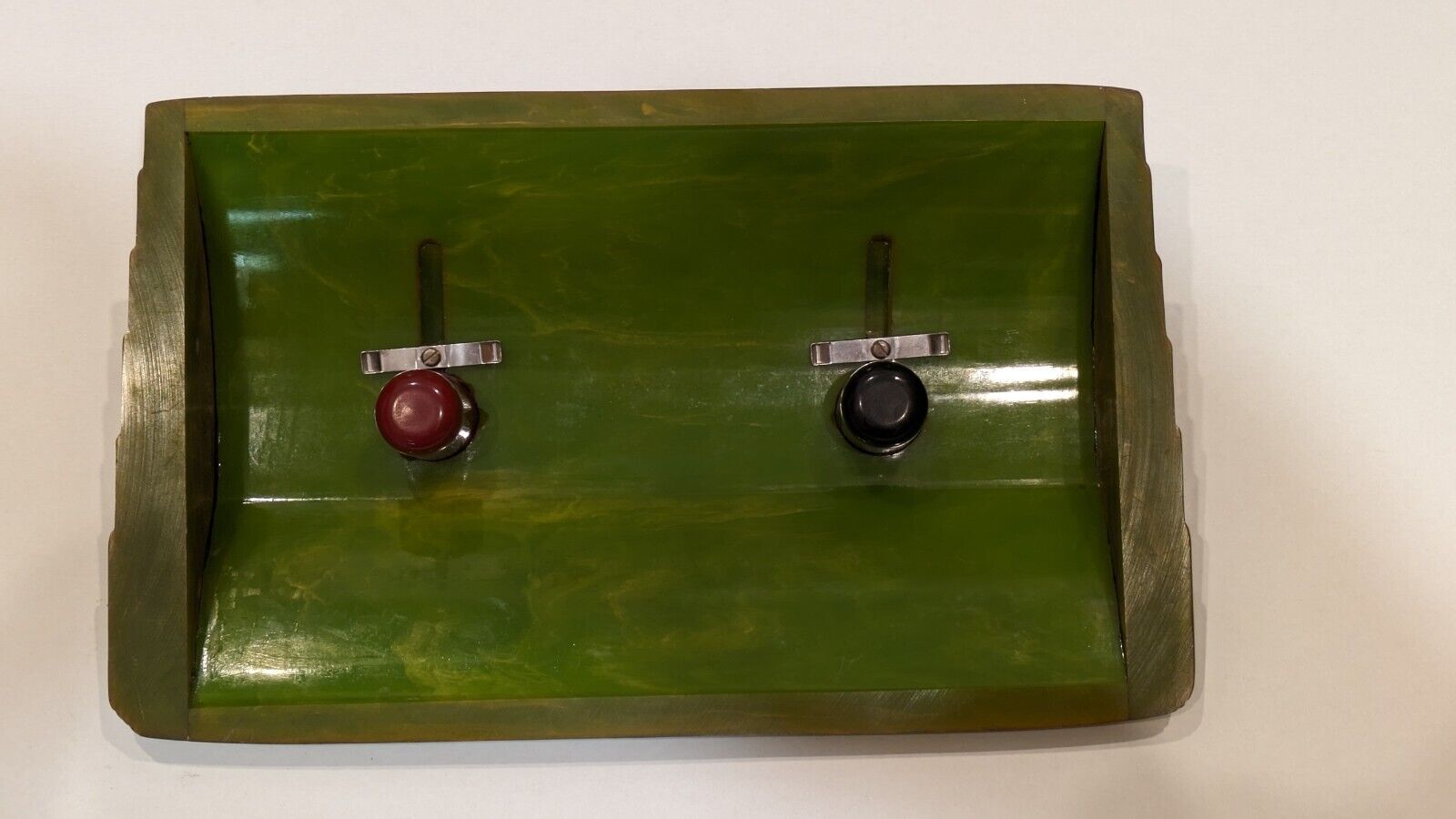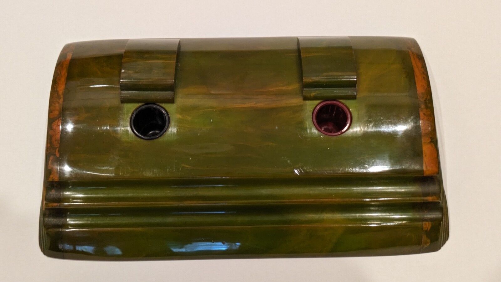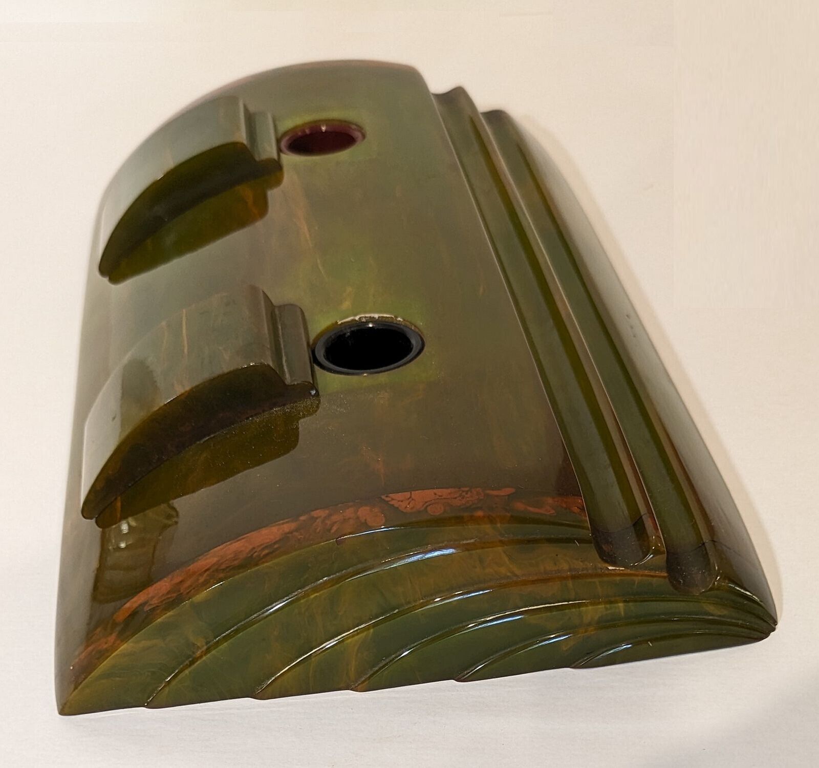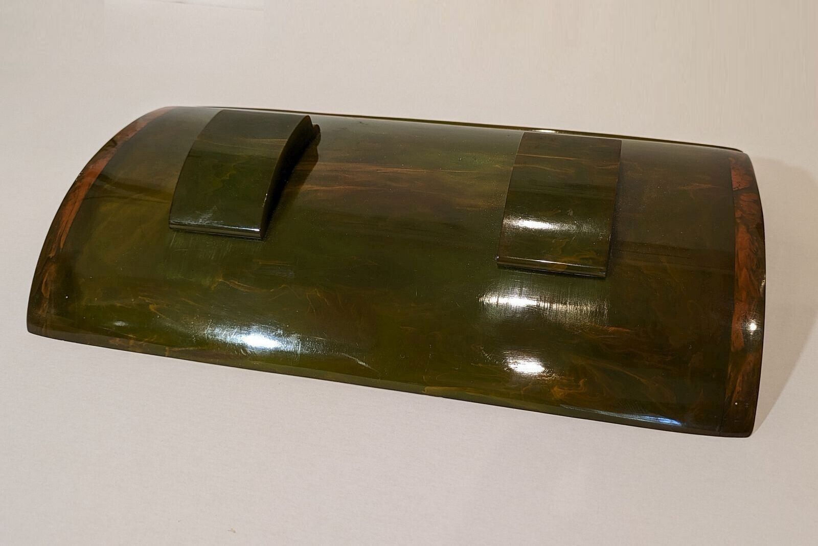 Example #2: Art Deco double inkwell in Phenolic Bakelite Catalin by Carvacraft – green with highlights in swirling orange.