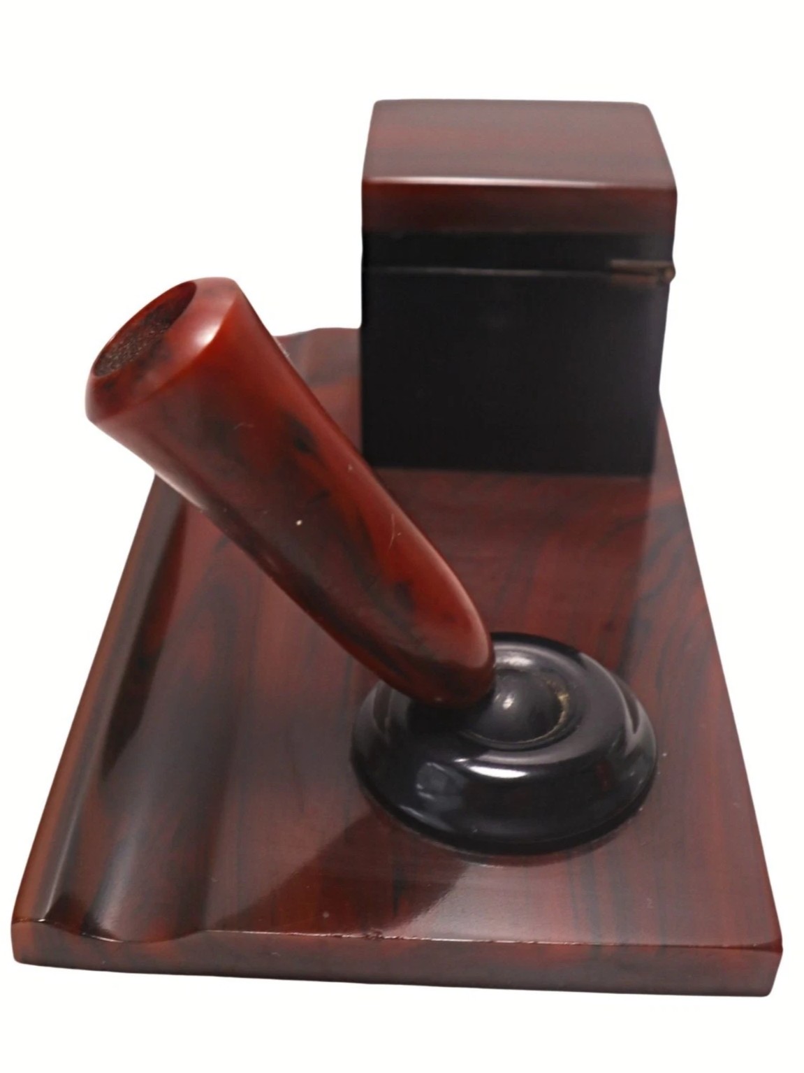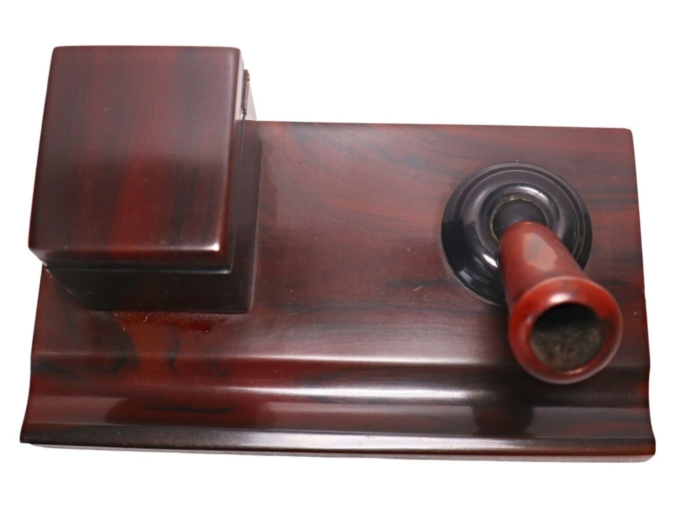 This Art Deco desk set is a quintessential example of early plastic design, crafted from Catalin in a rich “cherry juice” or “oxblood” marbled pattern.