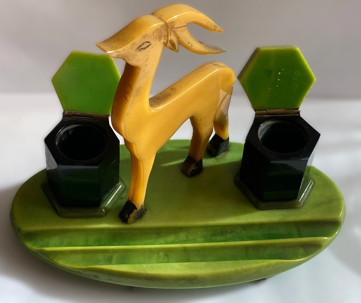 - The Inkwells: Flanking the gazelle are two hexagonal inkwells. They feature jet-black Bakelite bodies topped with hinged green Catalin lids that match the base. The contrast between the black, green, and yellow is a hallmark of Art Deco design.