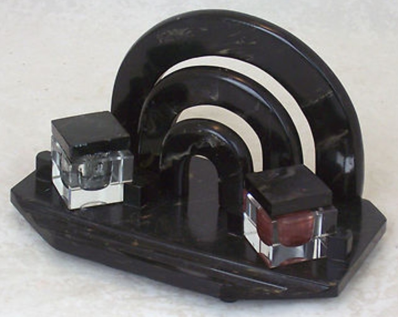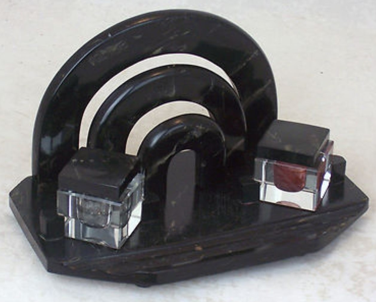 Black Bakelite with marbled veins in silver-gray double inkstand / letter holder combination.