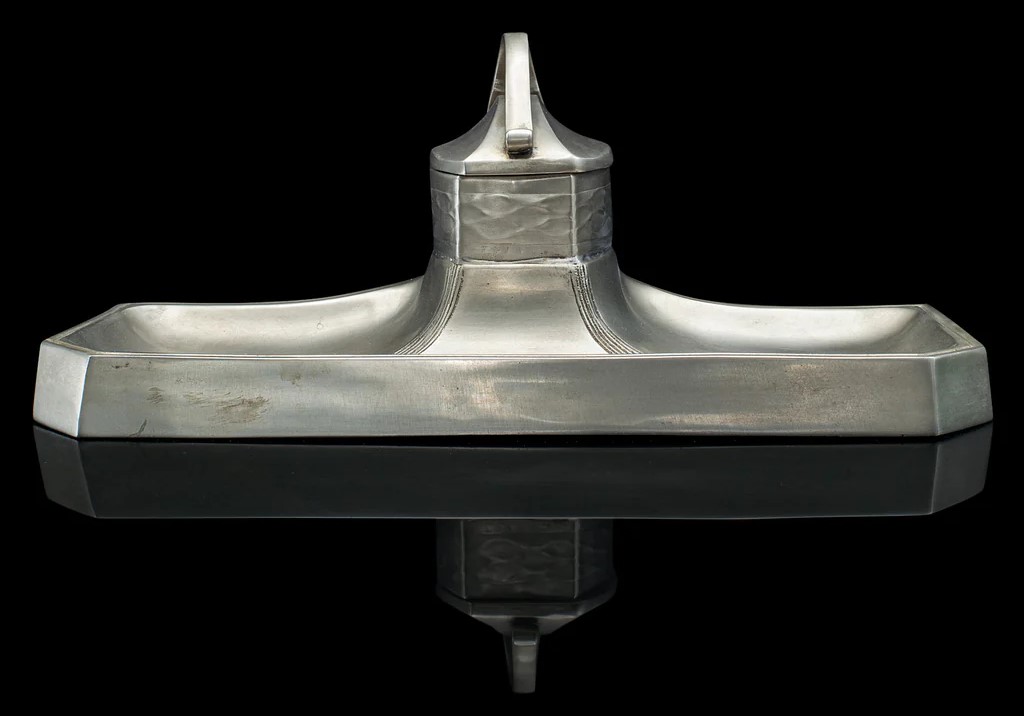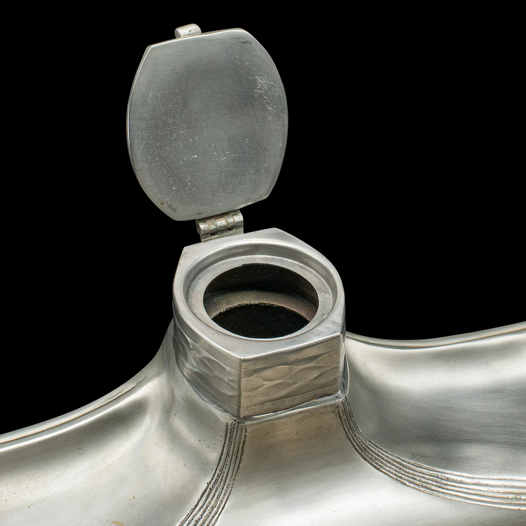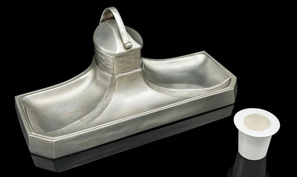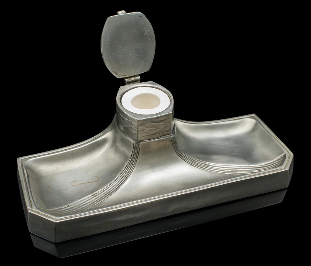 This cast white metal inkstand with its sleek, geometric design is typical of the Art Deco style. It features an integrated pen tray and a central inkwell with a hinged lid. The polished metal surface gives it a reflective quality.