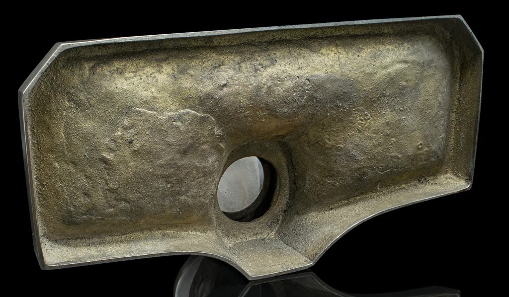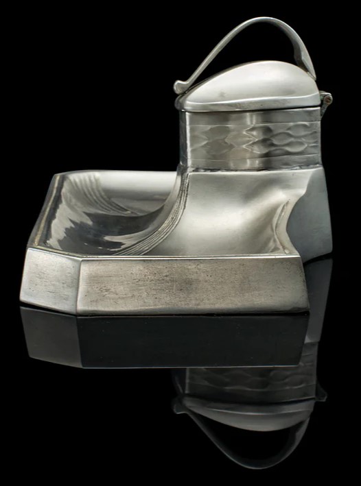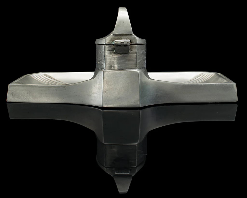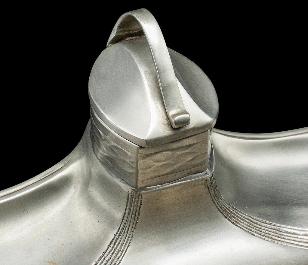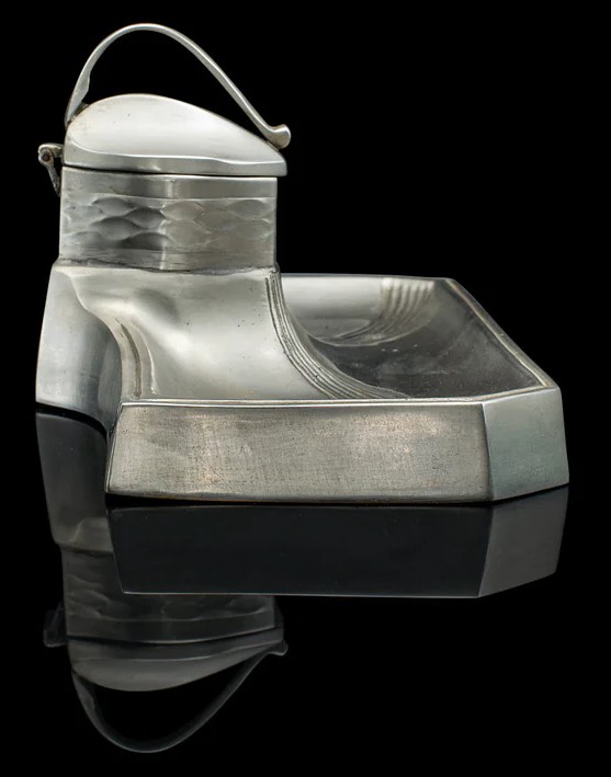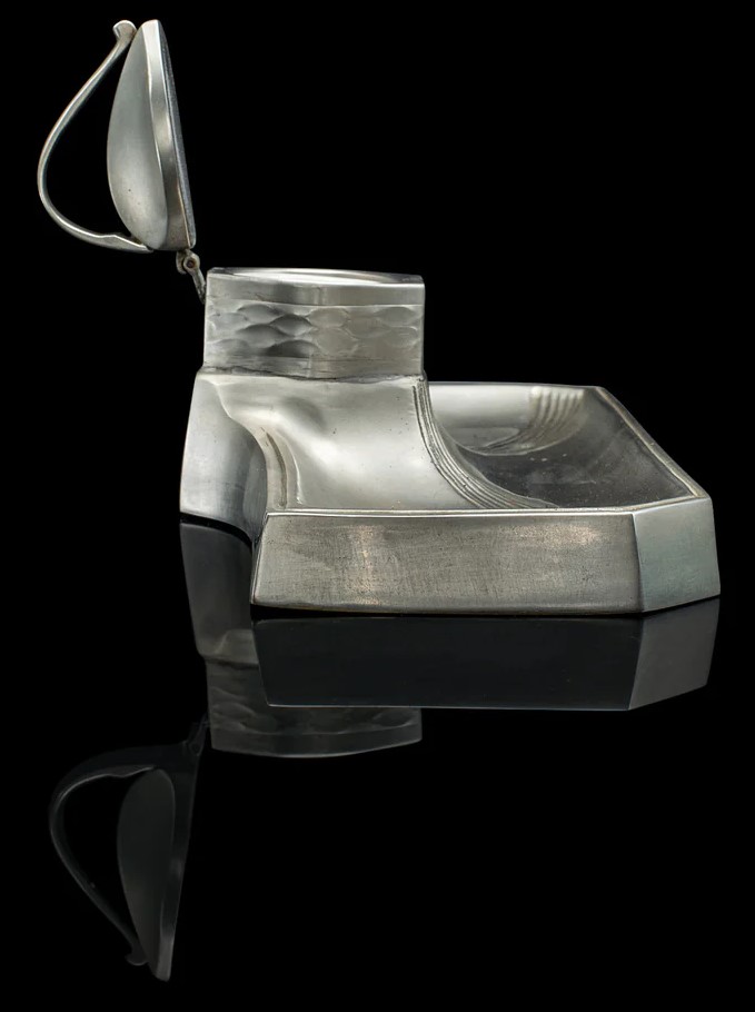 This cast white metal inkstand with its sleek, geometric design is typical of the Art Deco style. It features an integrated pen tray and a central inkwell with a hinged lid. The polished metal surface gives it a reflective quality.