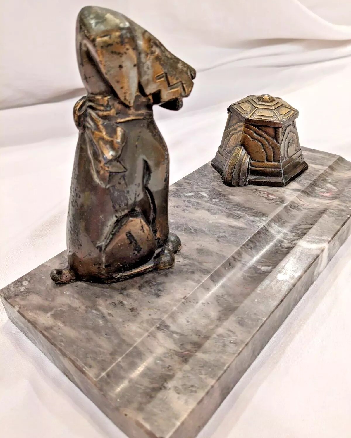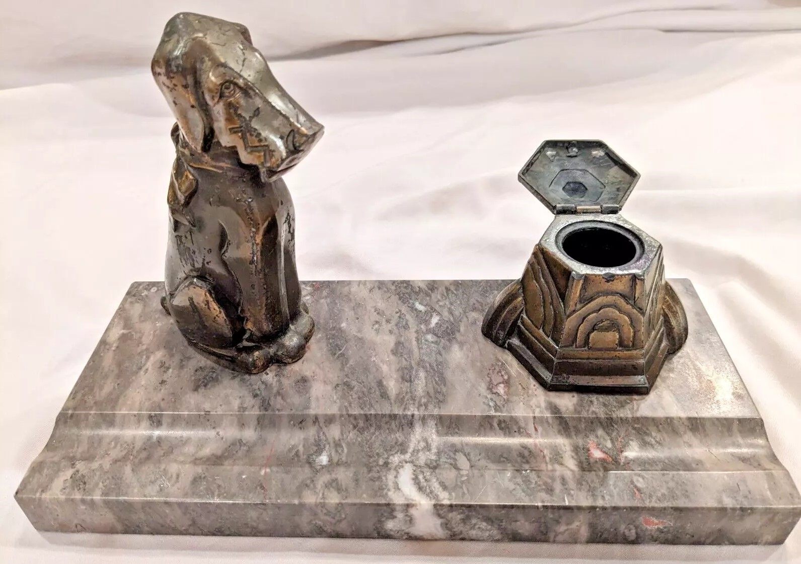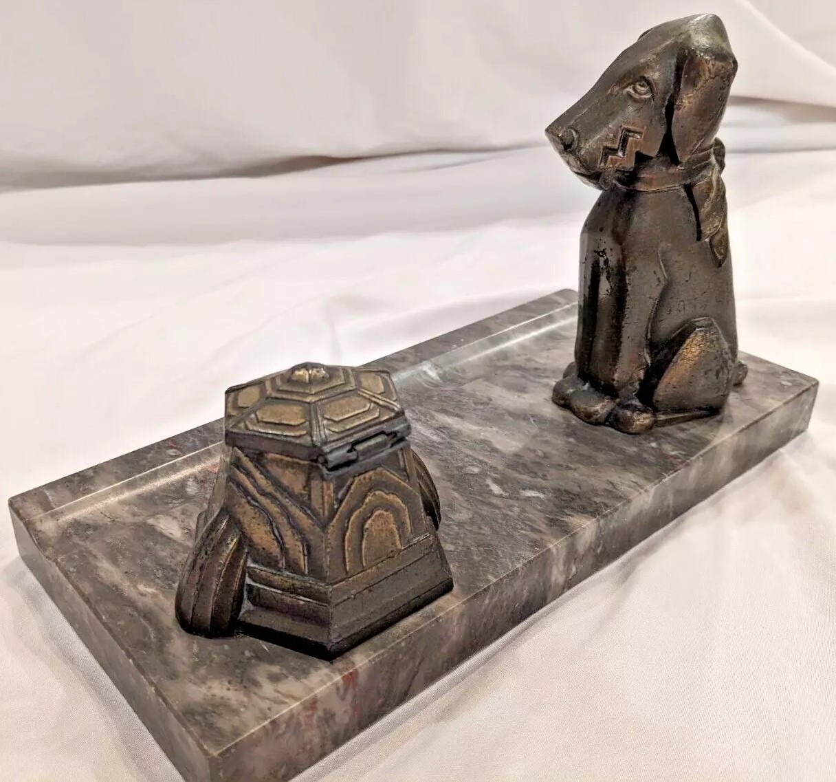 This inkstand exemplifies Art Deco design, characterized by its sleek, geometric lines and modern aesthetic. The base is made of marble, featuring natural grey veining and has a pen channel. On one end of the base, there’s a cubist dog figure with geometric facets, giving it a stylized and abstract appearance typical of the Art Deco movement. The dog is seated and appears to be crafted from a dark, possibly patinated metal, adding to its striking look. On the opposite end from the dog, there’s an inkwell with a hinged lid. The inkwell mirrors the geometric design elements of the cubist dog, maintaining the cohesive Art Deco theme.