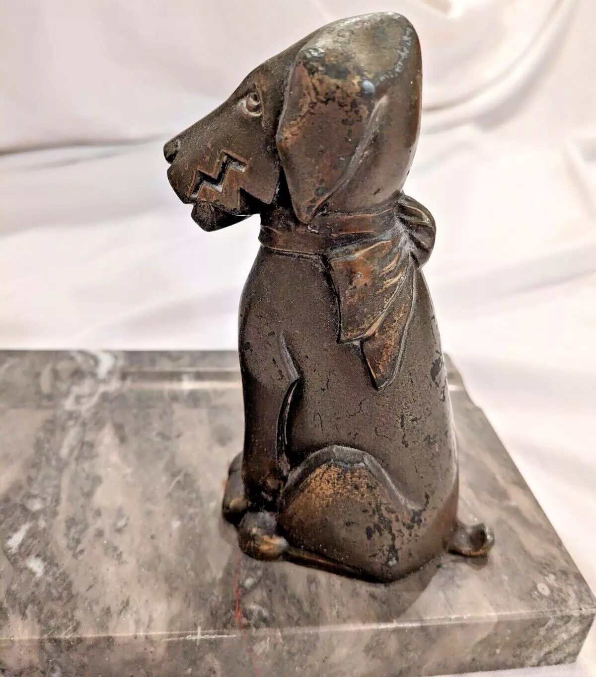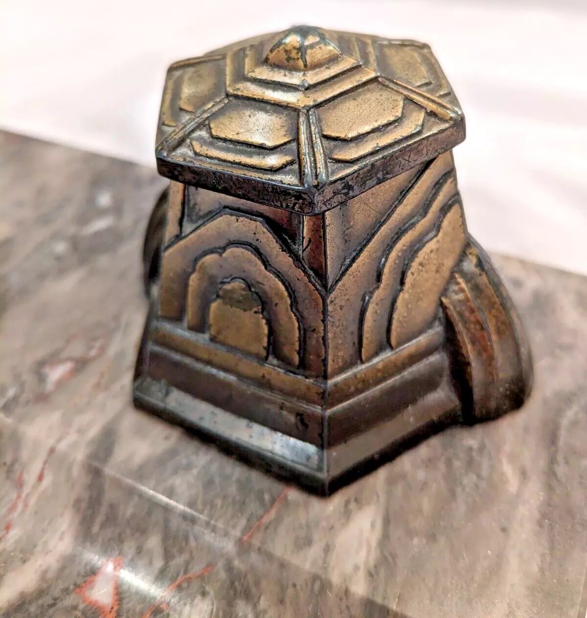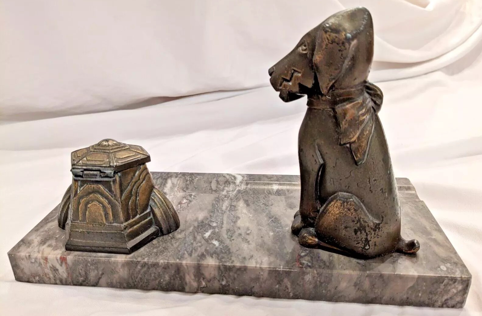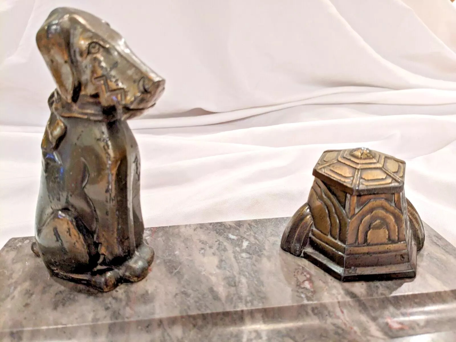 This inkstand exemplifies Art Deco design, characterized by its sleek, geometric lines and modern aesthetic. The base is made of marble, featuring natural grey veining and has a pen channel. On one end of the base, there’s a cubist dog figure with geometric facets, giving it a stylized and abstract appearance typical of the Art Deco movement. The dog is seated and appears to be crafted from a dark, possibly patinated metal, adding to its striking look. On the opposite end from the dog, there’s an inkwell with a hinged lid. The inkwell mirrors the geometric design elements of the cubist dog, maintaining the cohesive Art Deco theme.