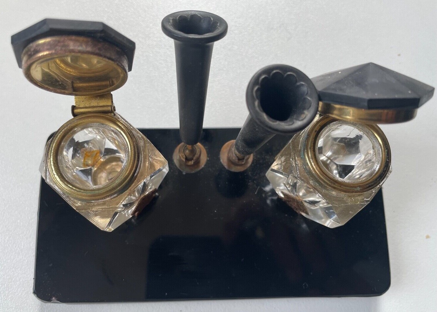 Art Deco Inkstand with two hinged inkwells and two swivel pen holders.