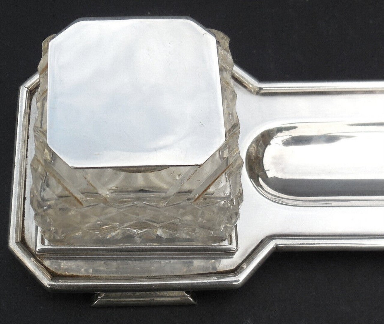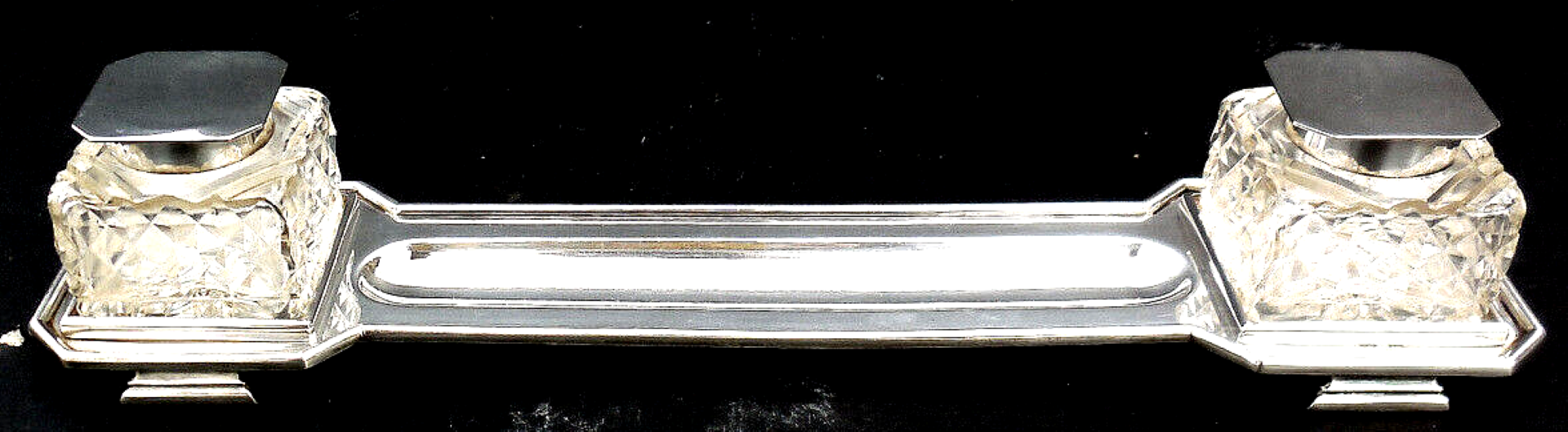 English double inkstand with a streamlined Art Deco look, hallmarked for Sheffield, 1936, by Atkin Brothers.