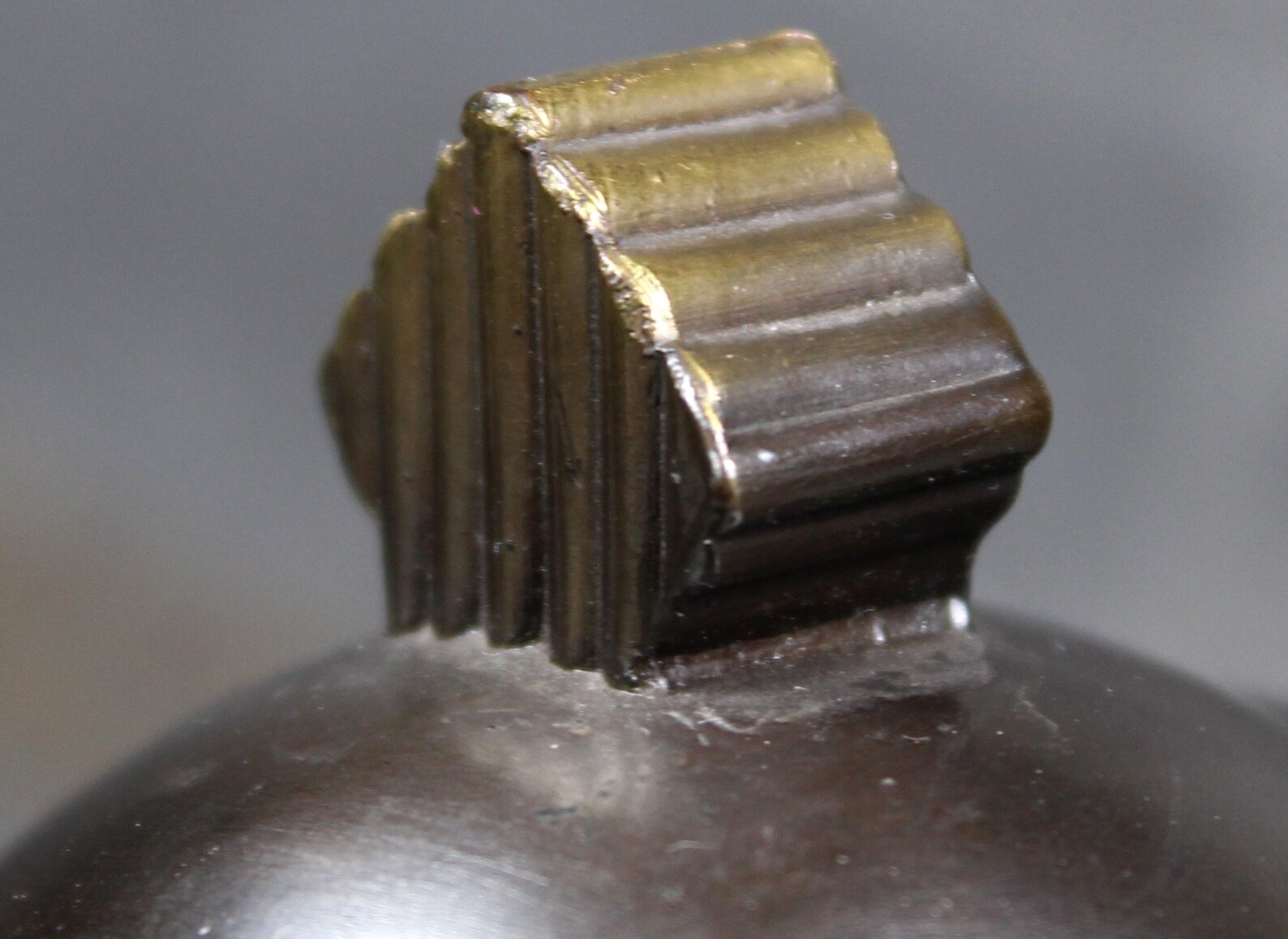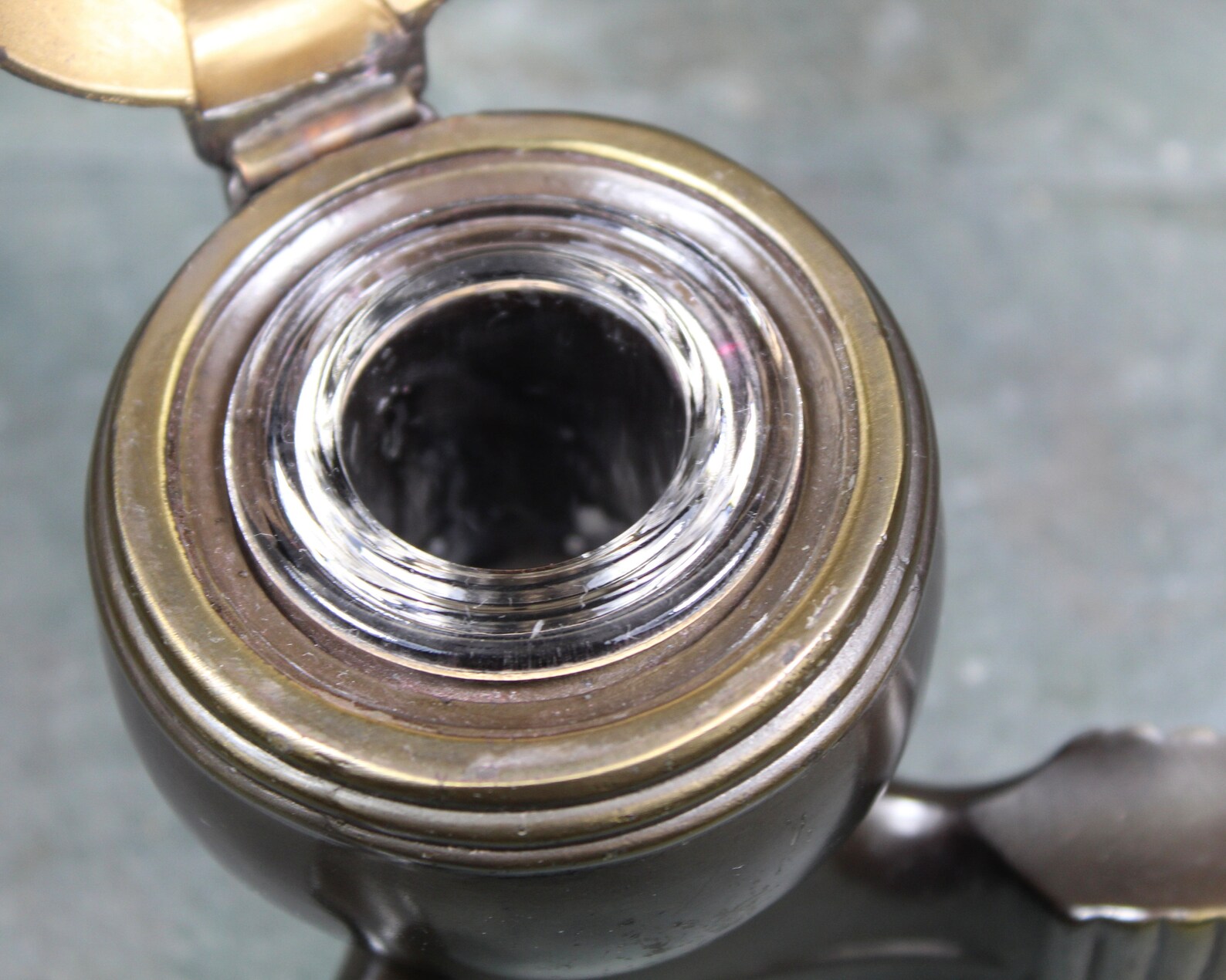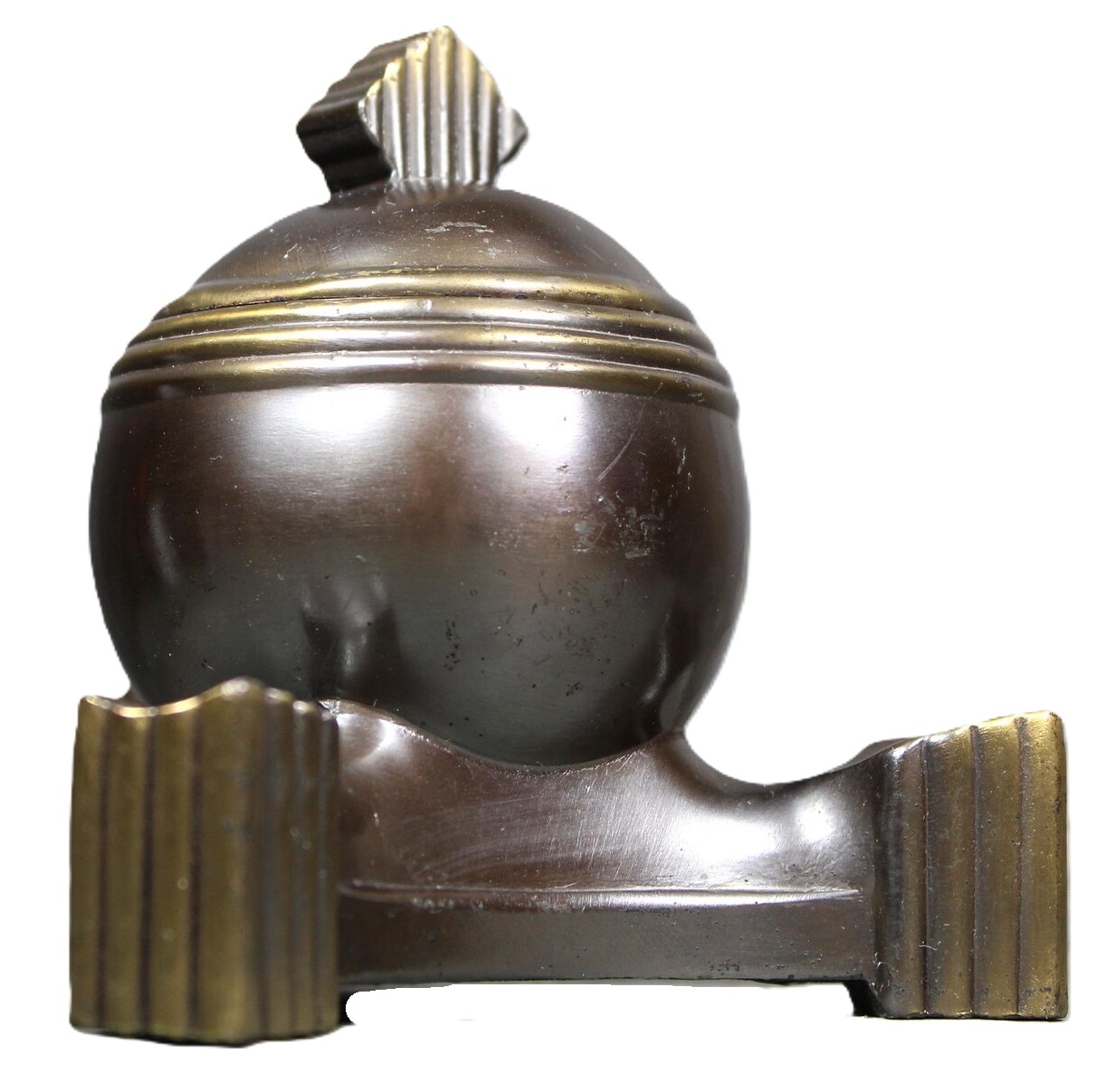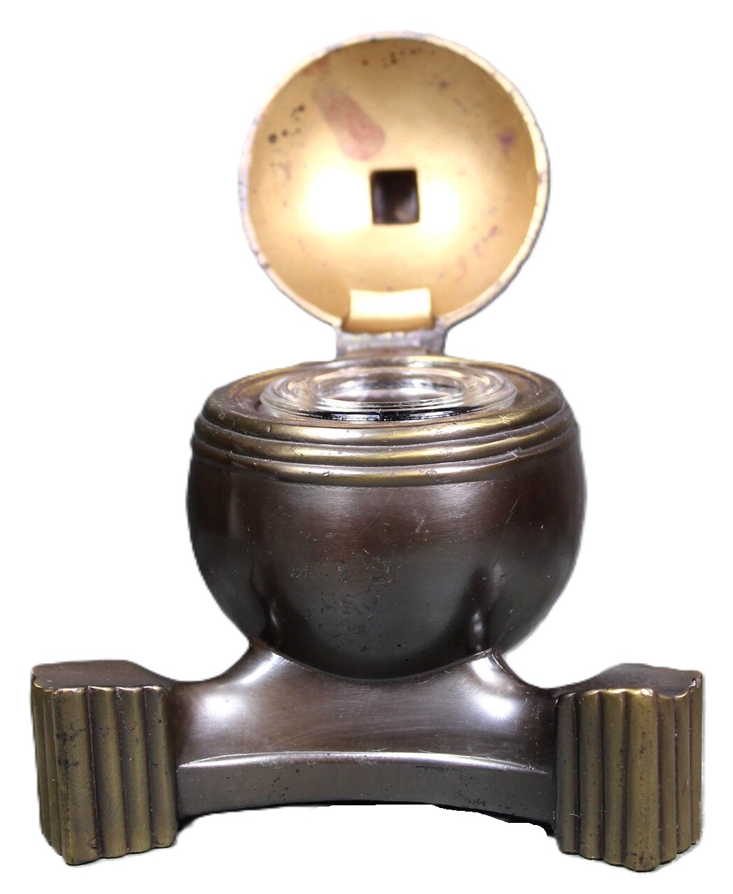 This Art Deco style inkwell features a spherical body with a horizontal ribbed pattern around its center. The top of the inkwell has a smaller, ridged dome finial. The base is broad and flat with two flared sides, each adorned with vertical ribbing that complements the central sphere’s design. The front legs form a pen rest.
