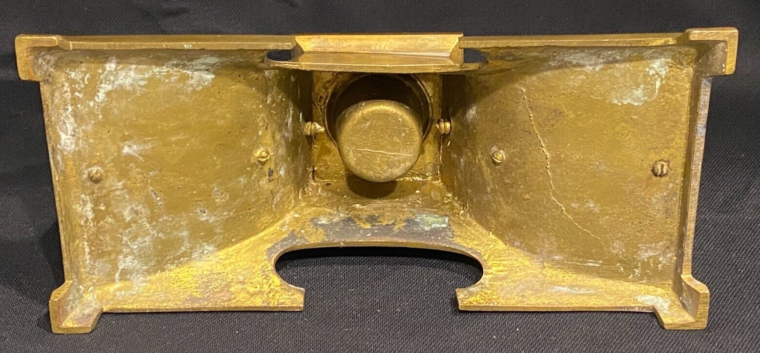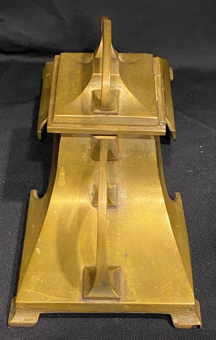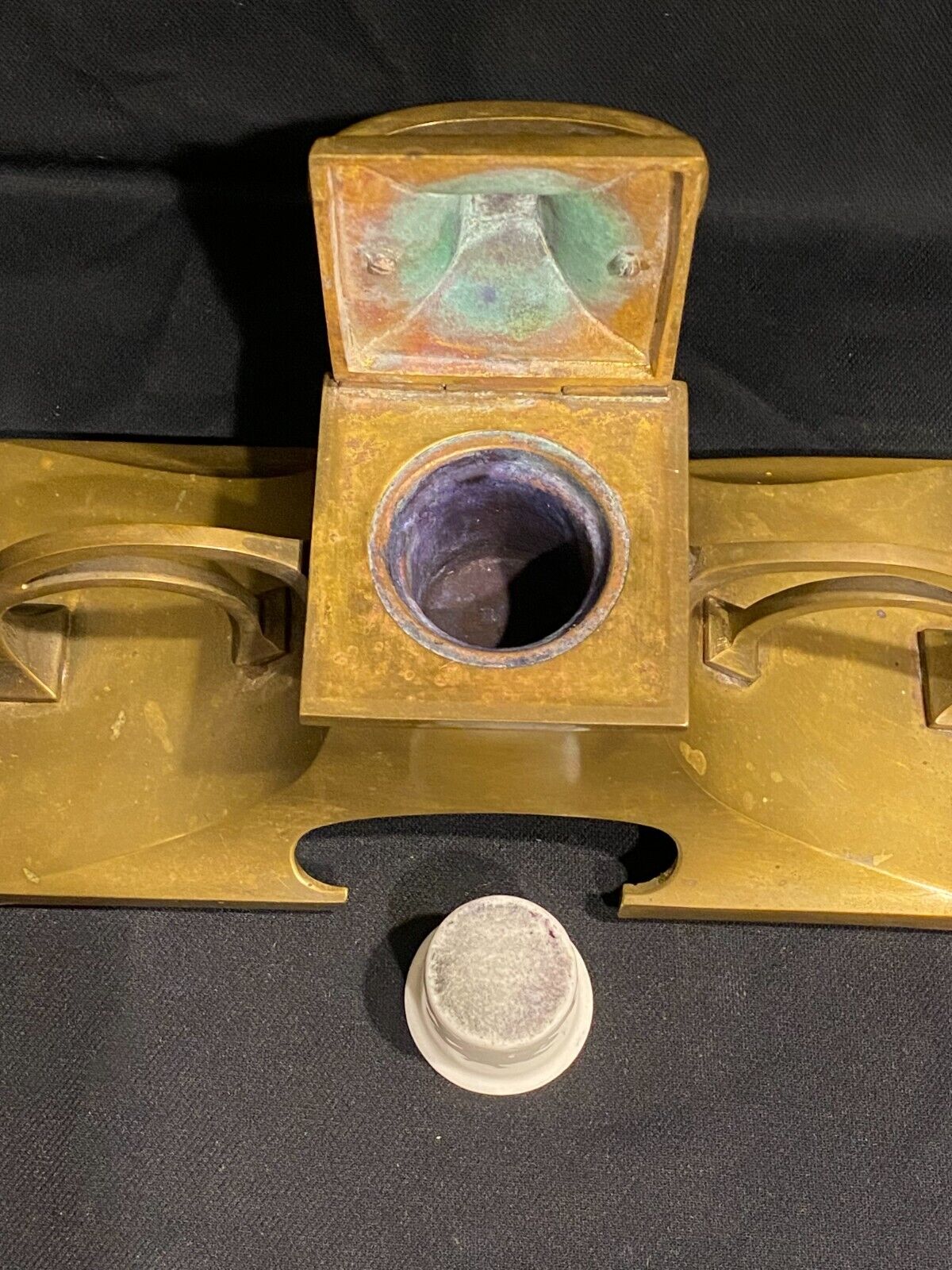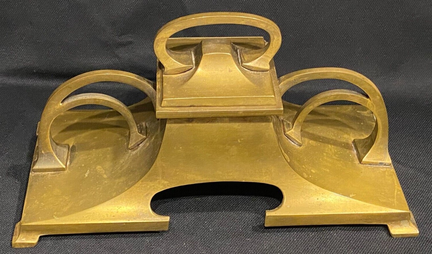 This double inkstand, minimalist and symmetrical in design, features rounded holders on either side. The inkwell’s hinged lid continues the loop theme.