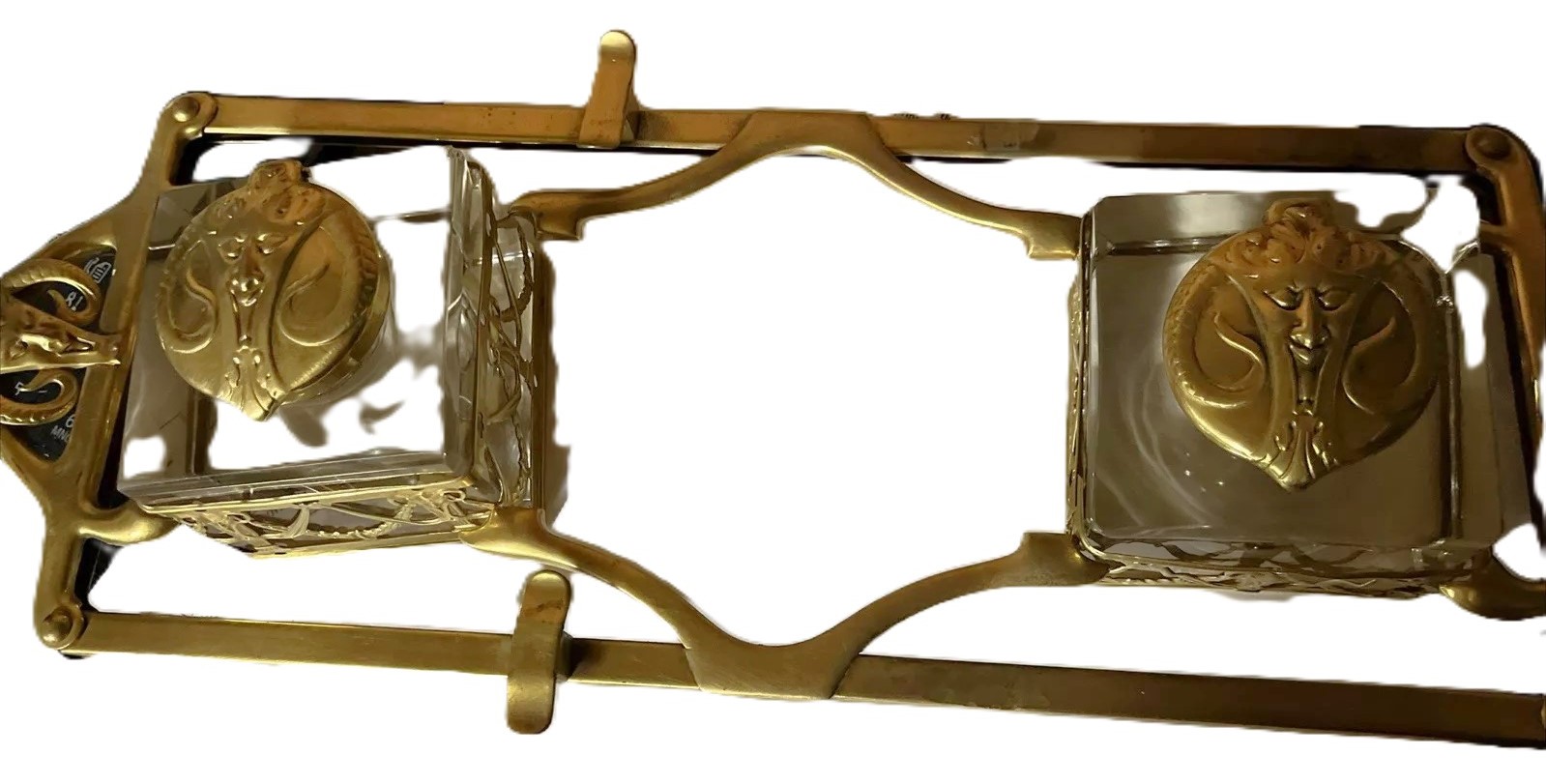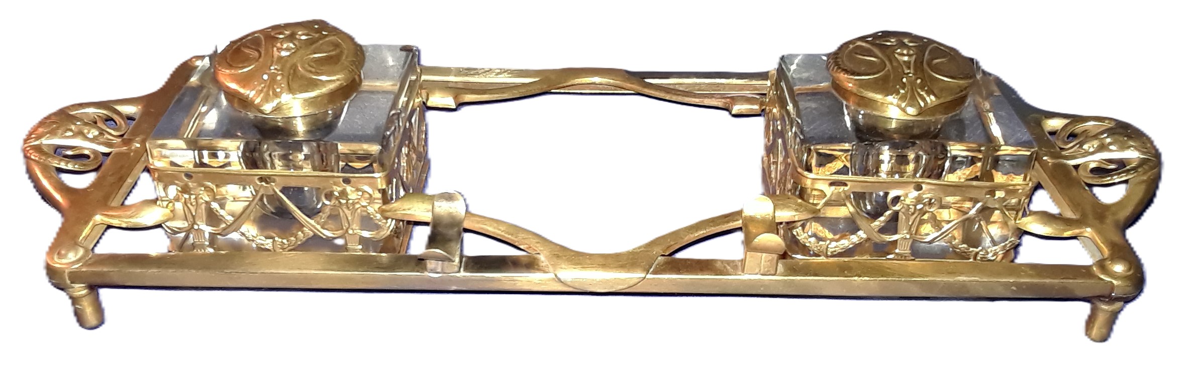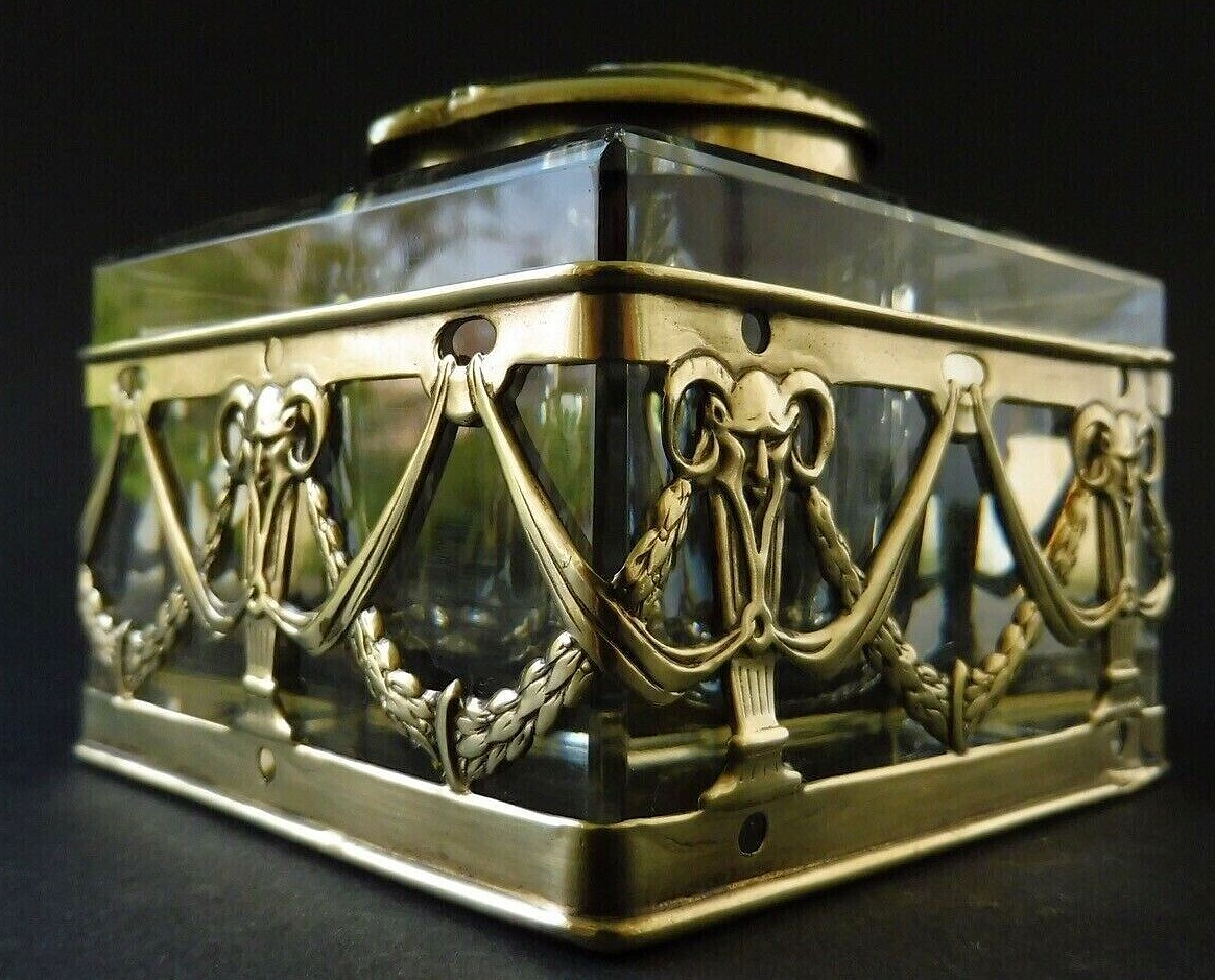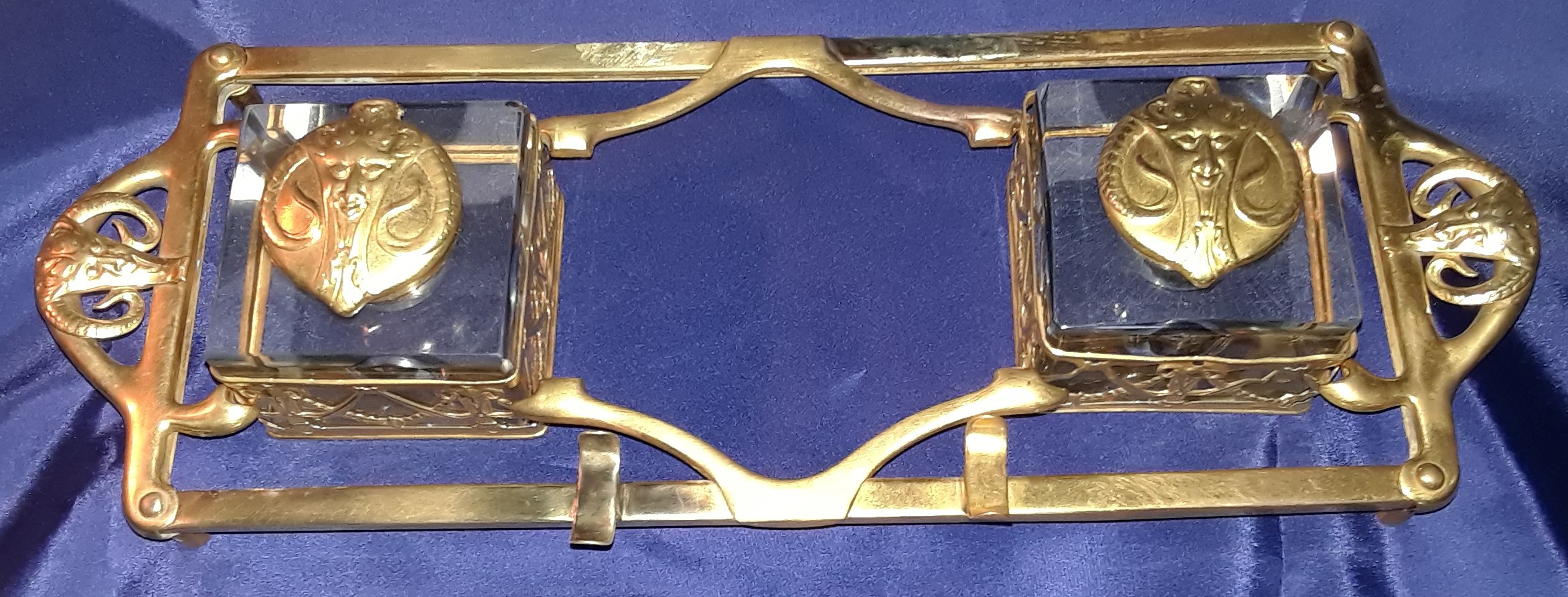 This Art Nouveau inkstand features two glass inkwells connected by a brass frame with handles on each side. The brass filigree around each of the inkwells features swags, garlands, and satyrs. The lids are impressed with the face of a satyr. The handles on each side are also feature faces of satyrs. The mark “GES. GESCH.” stands for “Gesetzlich Geschützt,” indicating that the design was registered or patented in German-speaking countries.