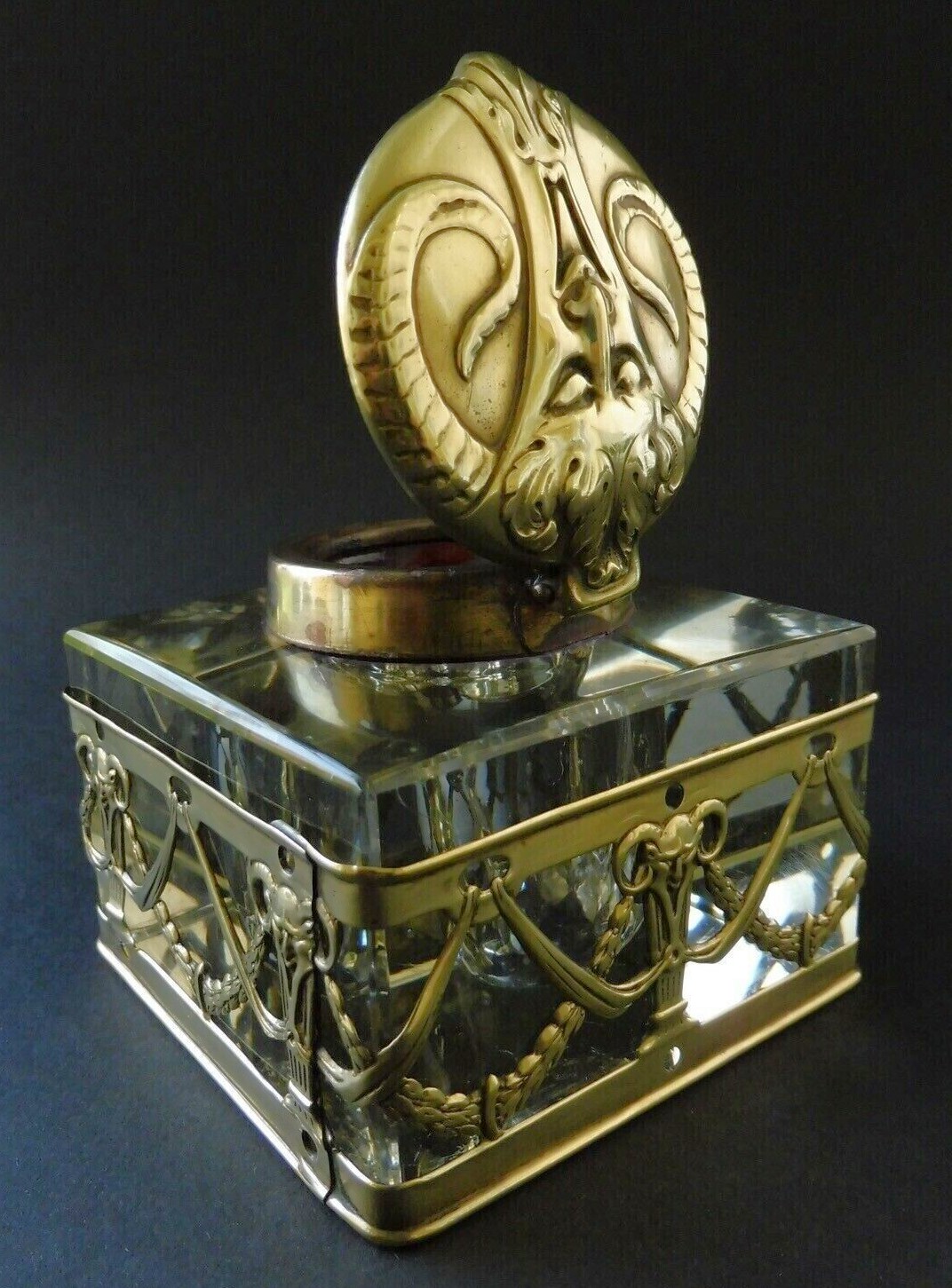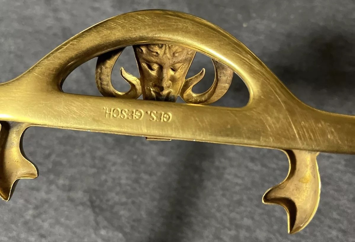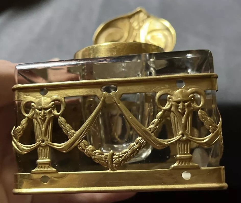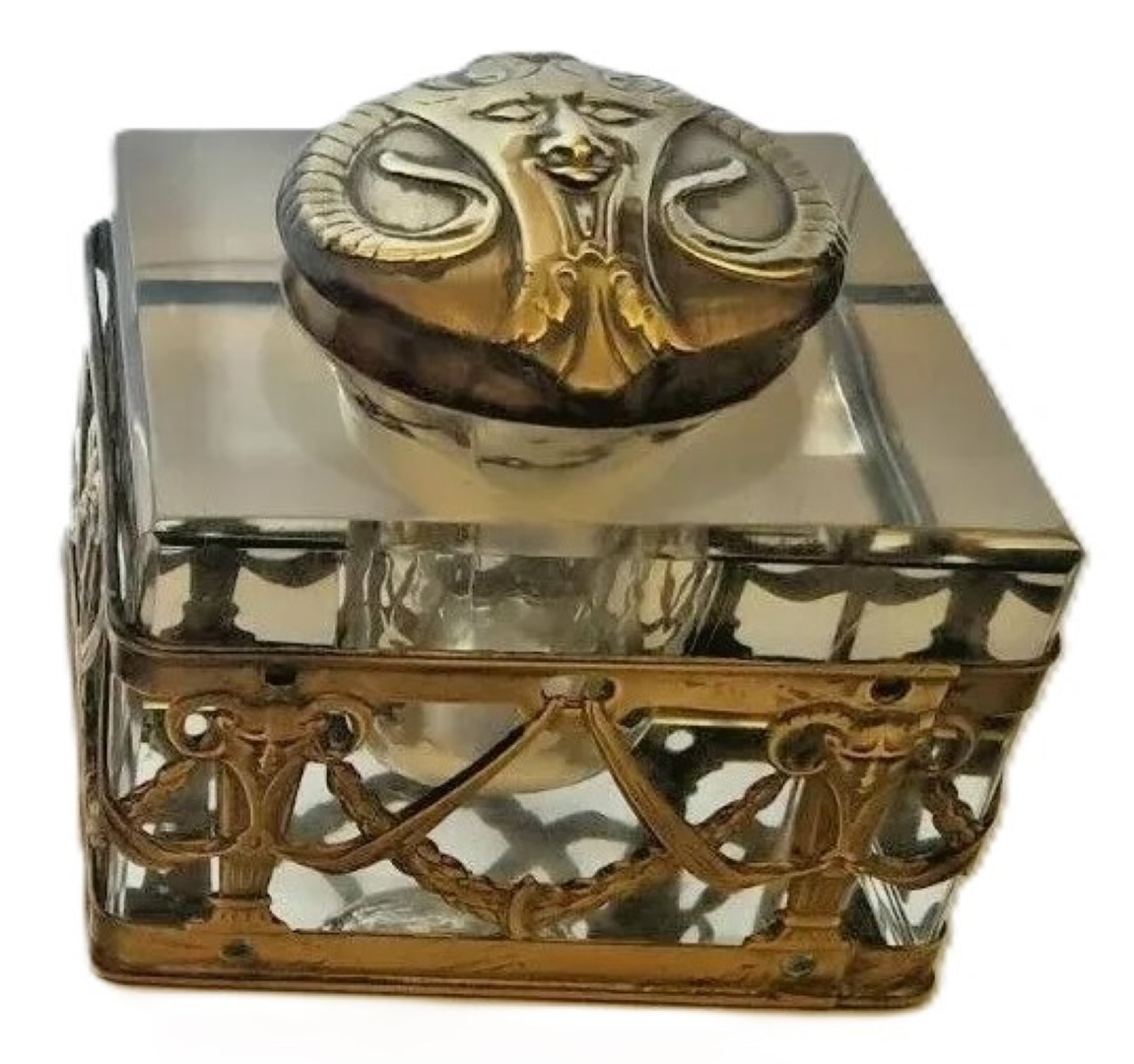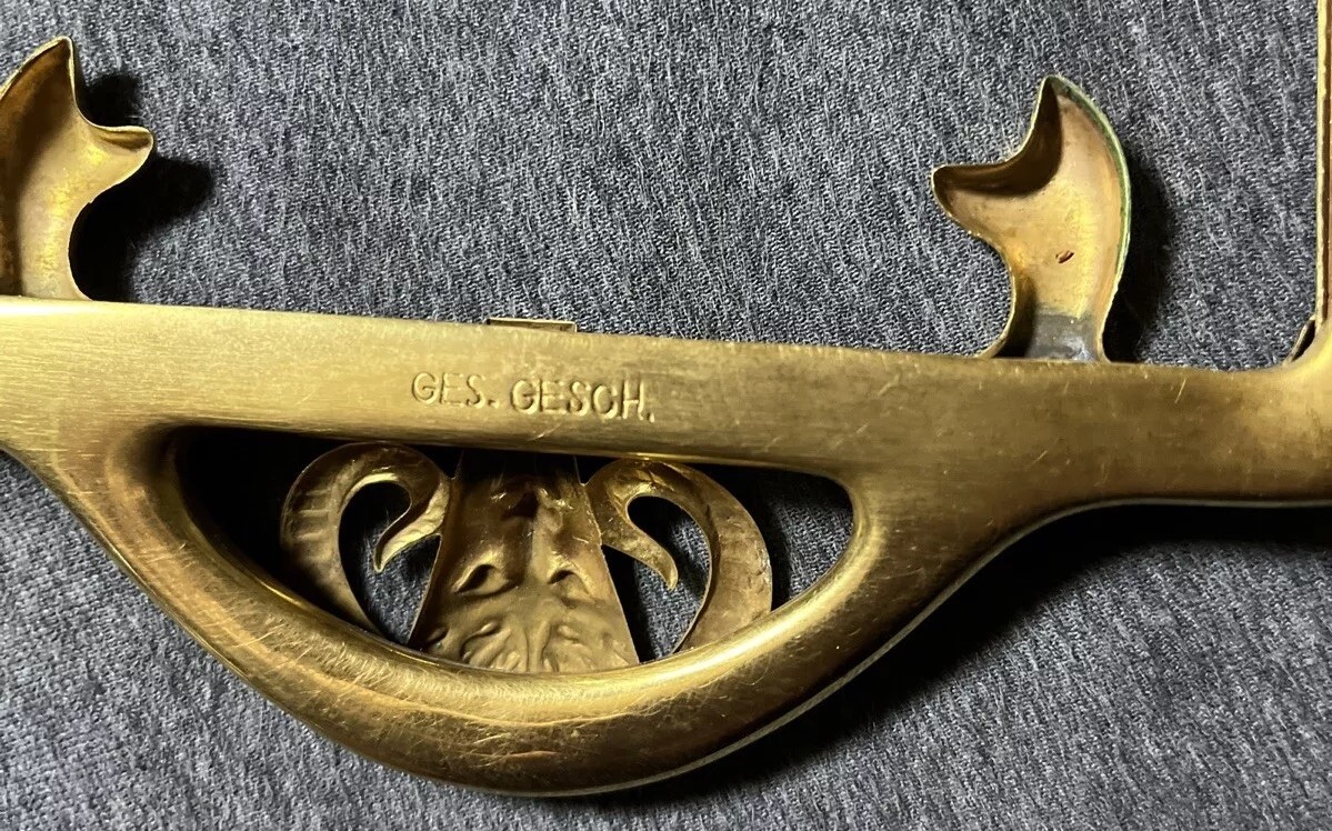This Art Nouveau inkstand features two glass inkwells connected by a brass frame with handles on each side. The brass filigree around each of the inkwells features swags, garlands, and satyrs. The lids are impressed with the face of a satyr. The handles on each side are also feature faces of satyrs. The mark “GES. GESCH.” stands for “Gesetzlich Geschützt,” indicating that the design was registered or patented in German-speaking countries.