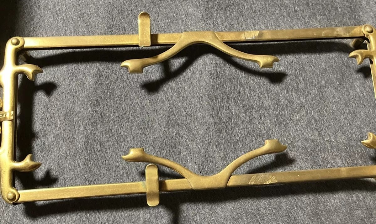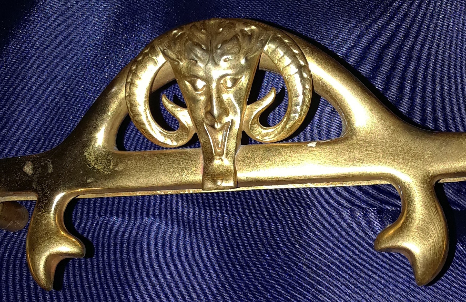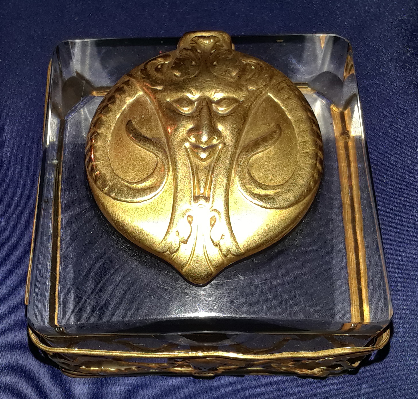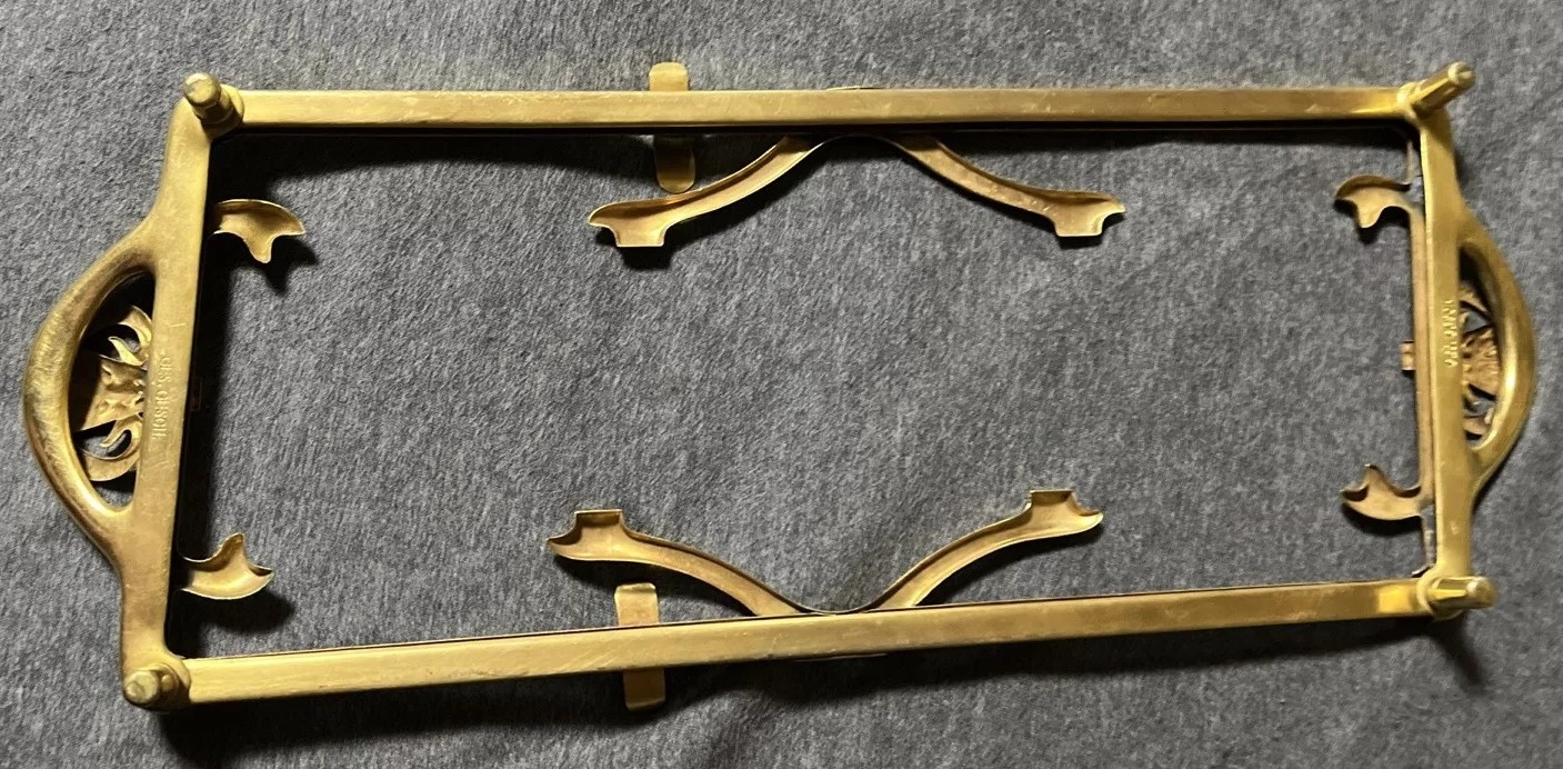 This Art Nouveau inkstand features two glass inkwells connected by a brass frame with handles on each side. The brass filigree around each of the inkwells features swags, garlands, and satyrs. The lids are impressed with the face of a satyr. The handles on each side are also feature faces of satyrs. The mark “GES. GESCH.” stands for “Gesetzlich Geschützt,” indicating that the design was registered or patented in German-speaking countries.