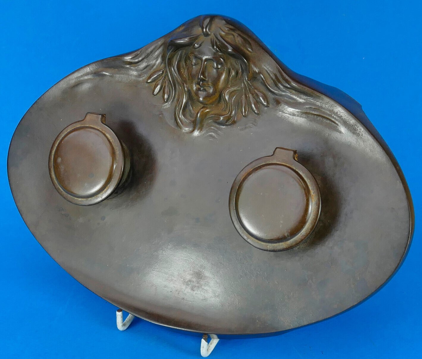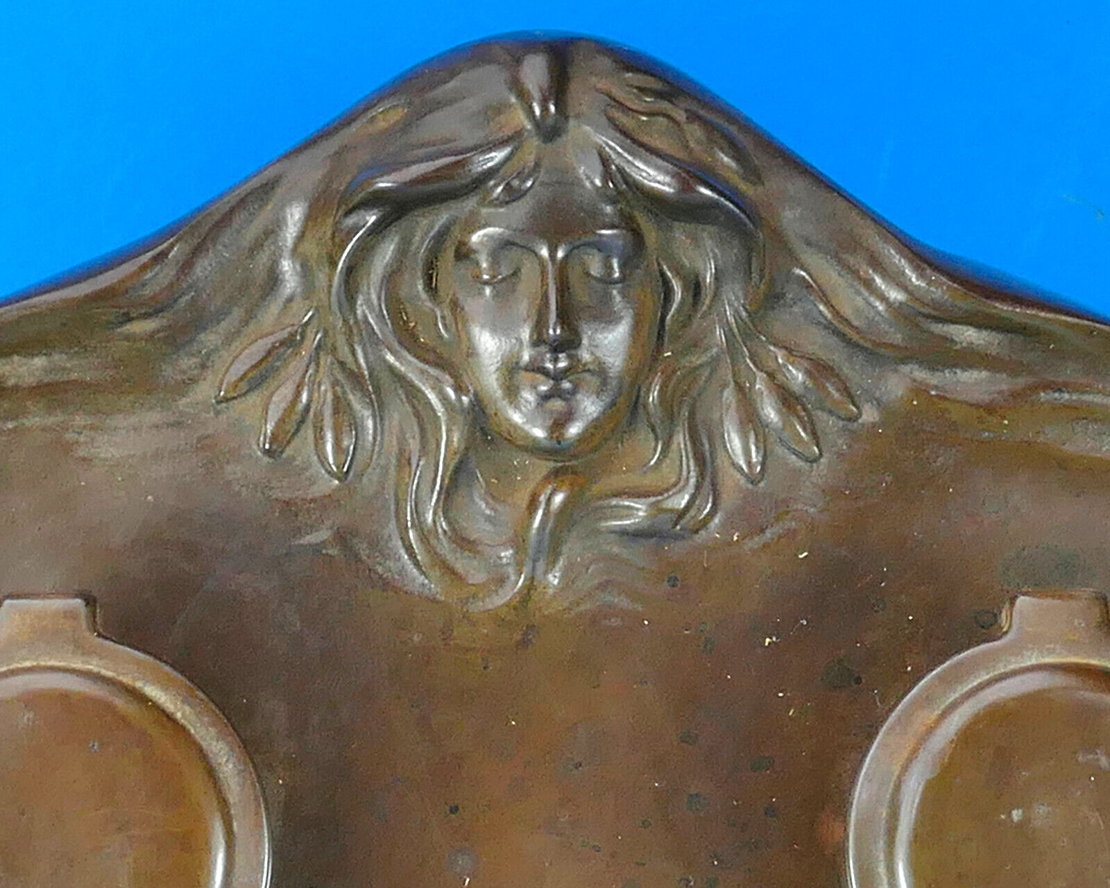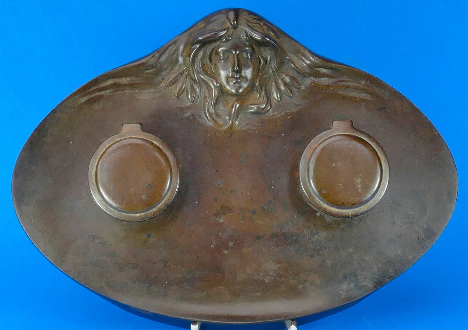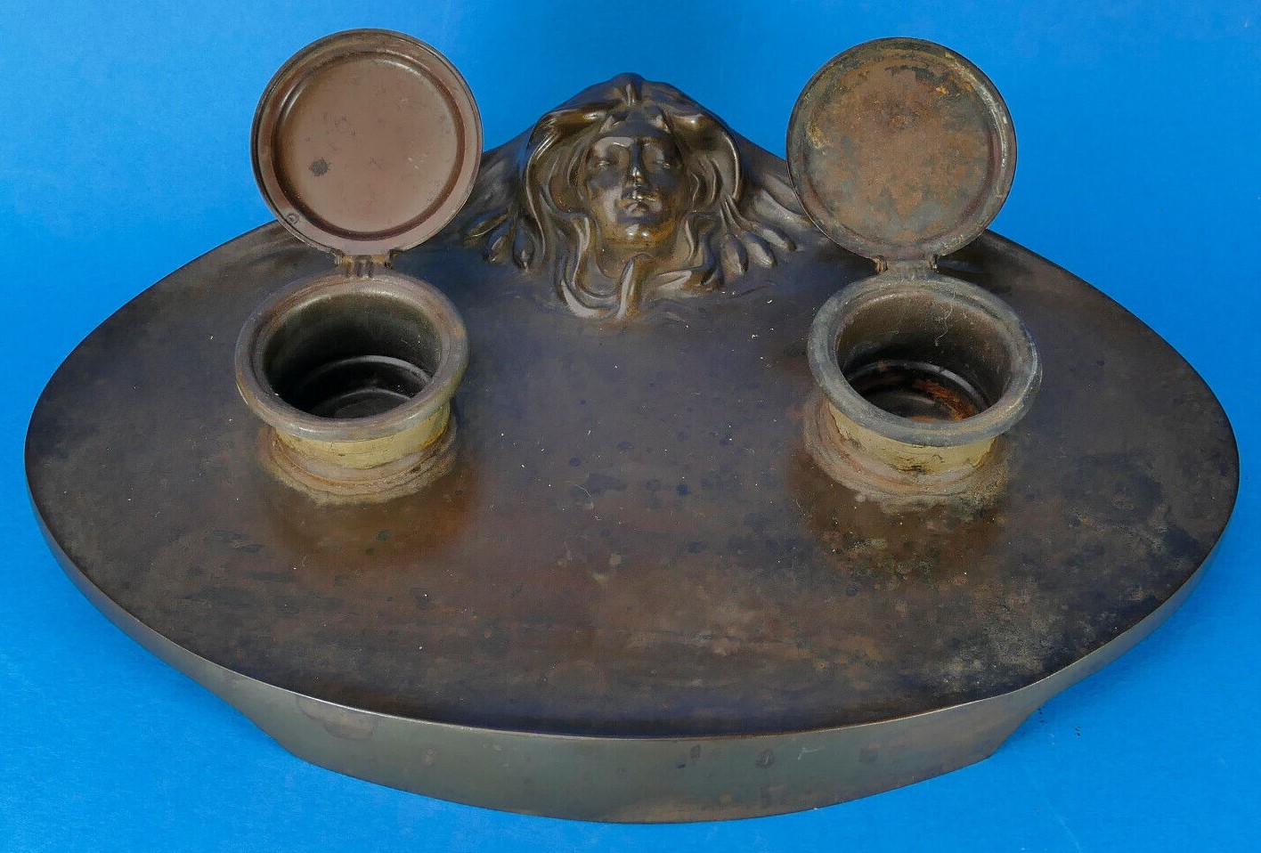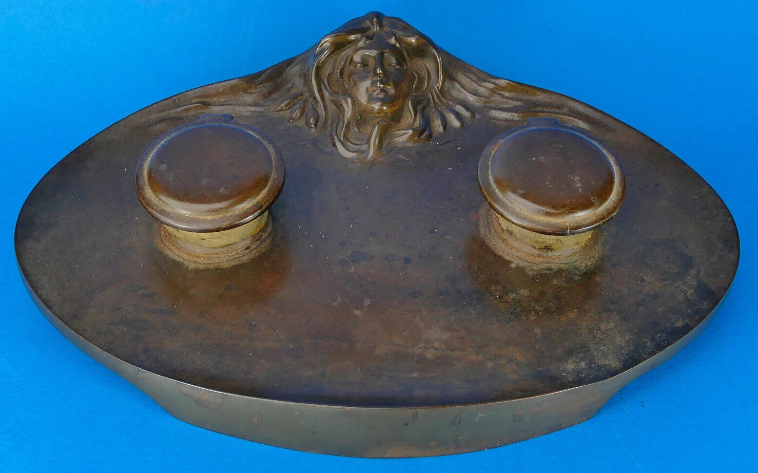Art Nouveau design double inkwell with a built-in pen tray, and decorated with an attractive design of a maiden with flowing hair.