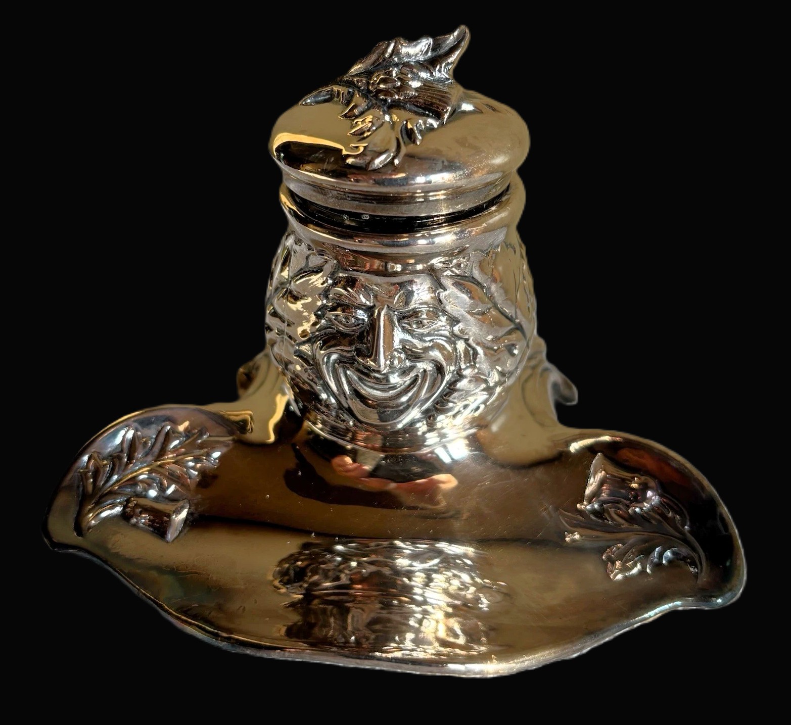 This inkwell is a classic example of Jennings Brothers art metalware, featuring an Art Nouveau design sometimes referred to in the collector community as the “Green Man” or “Forest Face” inkwell.