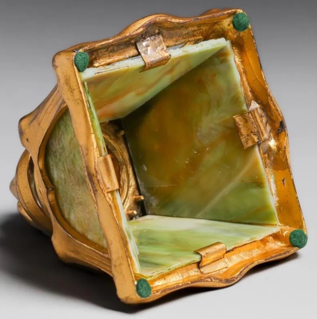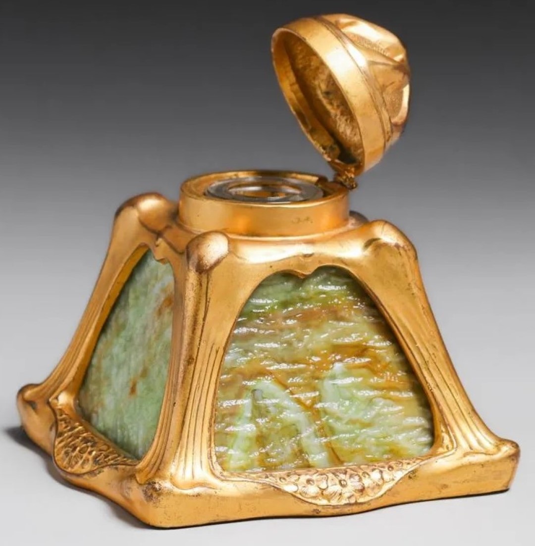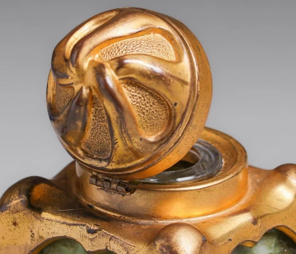 Art Nouveau gilt bronze inkwell with glass insets on all four sides.