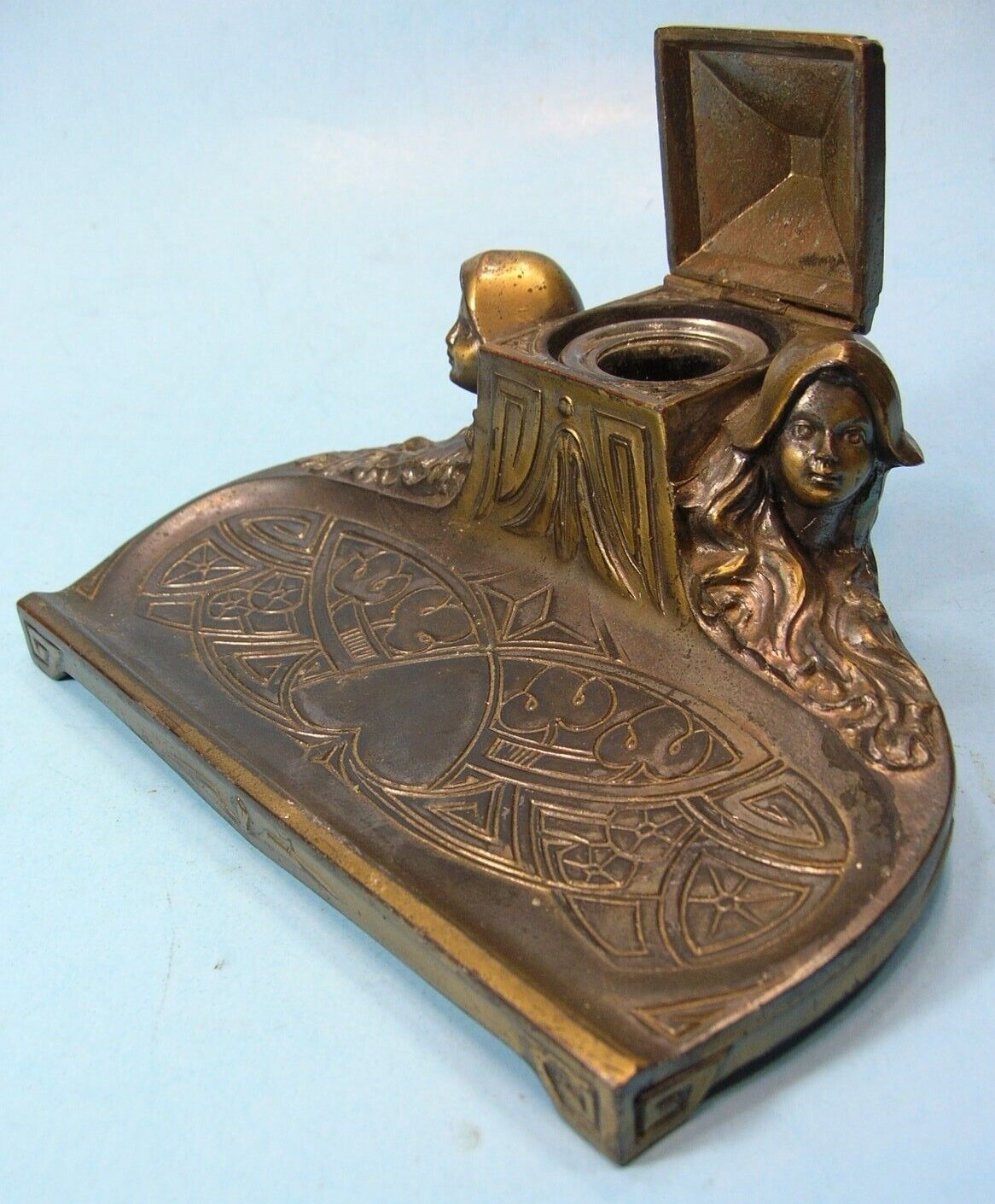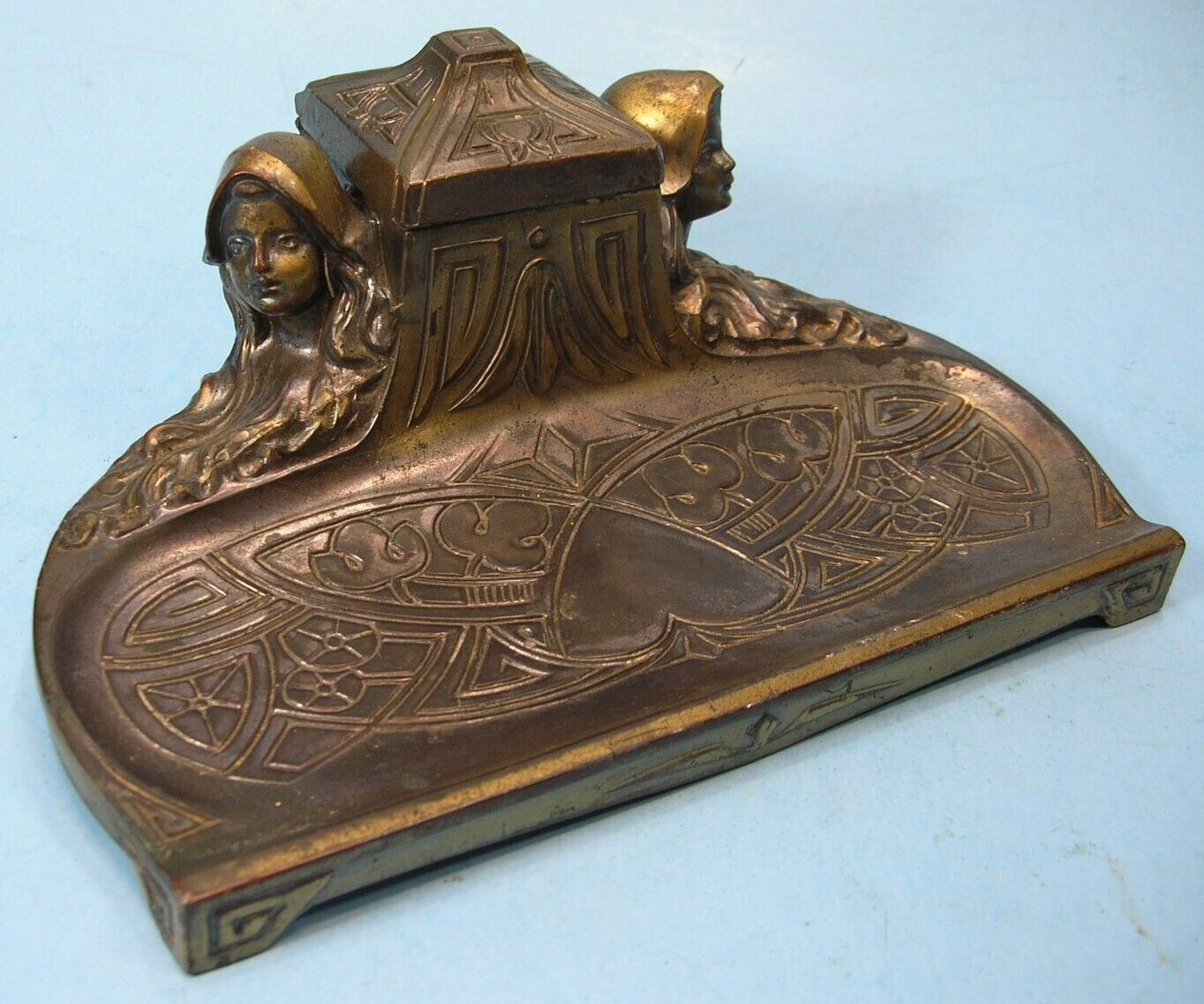 This inkstand is pure Art Nouveau with its sinuous curves, lines, and leaves. Flanking the inkwell with a hinged lid are the heads of two maidens with long, flowing hair.