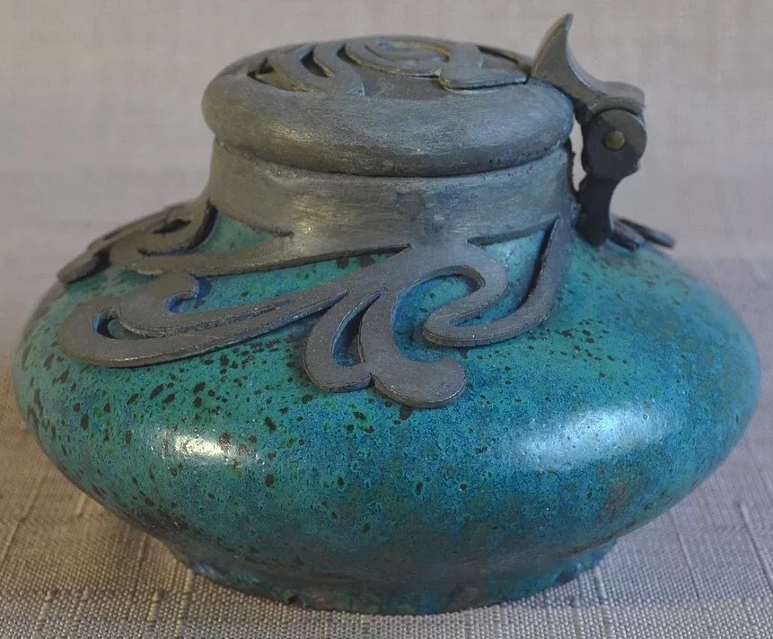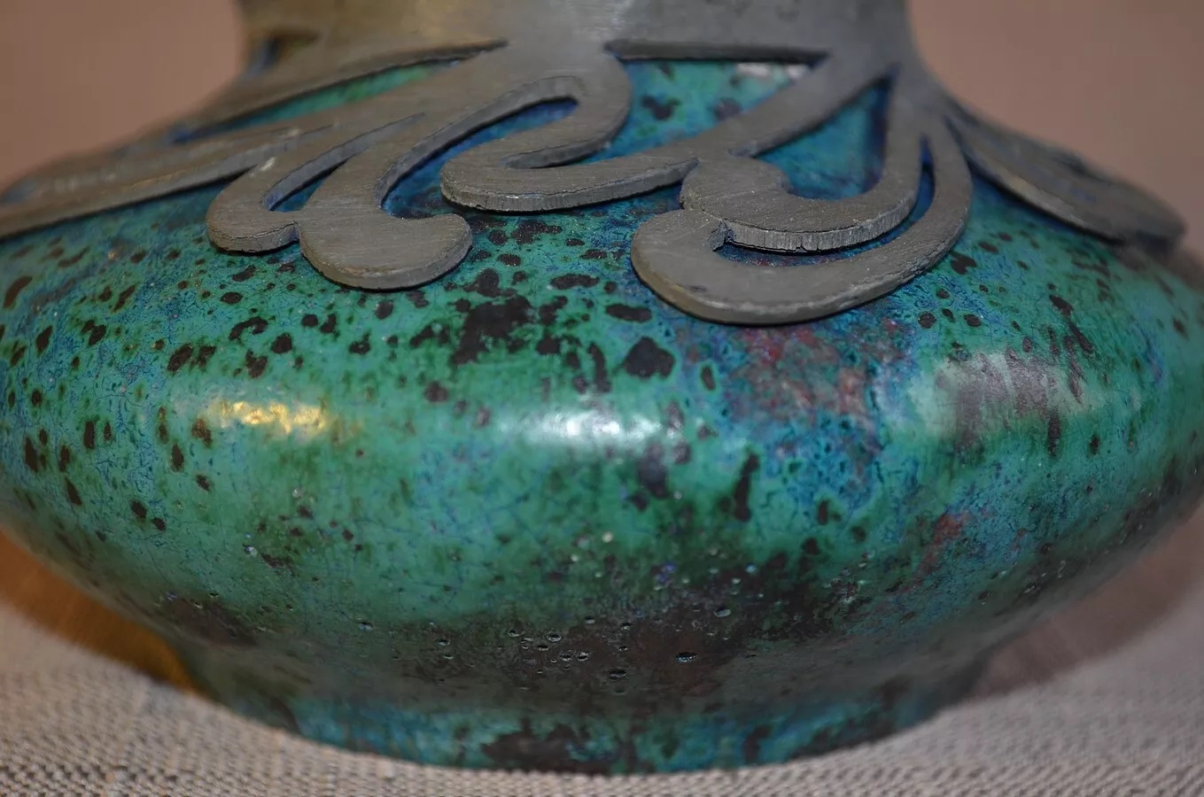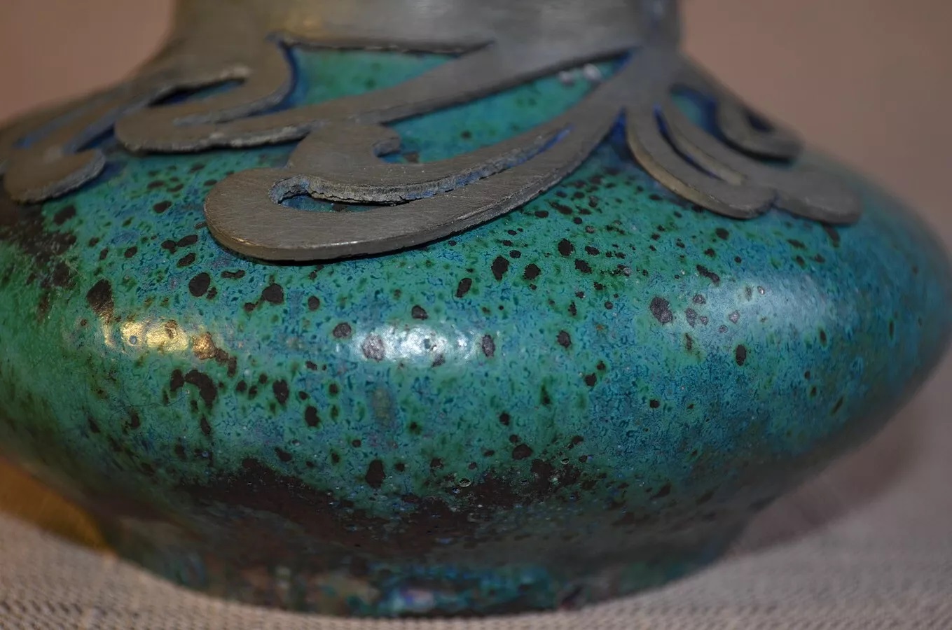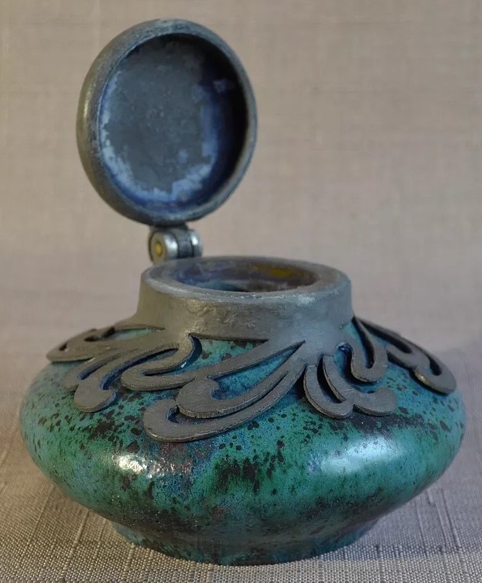 This inkwell with its pierced pewter collar is an example of French Art Nouveau style, signed by Pierre-Adrien Dalpayrat. It is made of ceramic and features Dalpayrat’s distinctive glazing technique. The glaze appears to be a type of high-fire glaze.