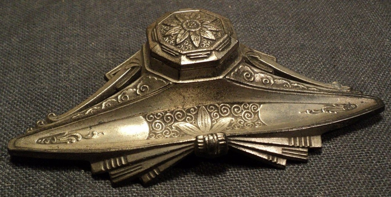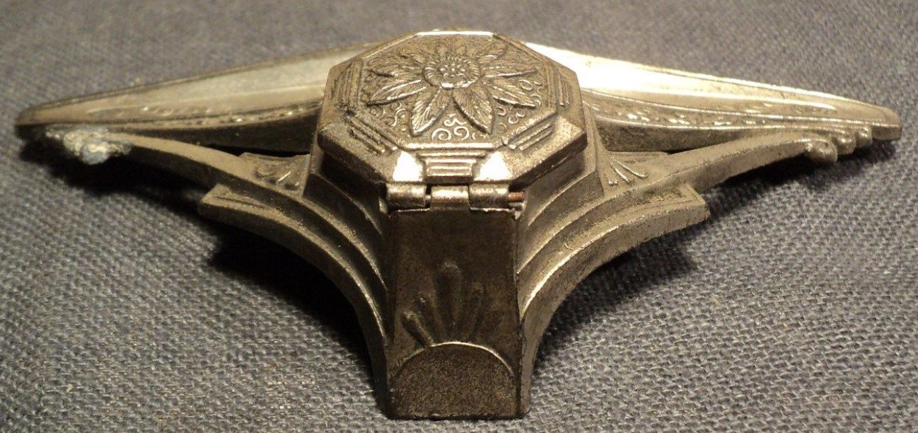 This brass inkwell is marked on the underside “Made in France” and numbered 2155. Its ornate detailing features floral patterns and a decorative ribbon / bow. The hinged lid has a flower design. The front channel serves as a pen tray.