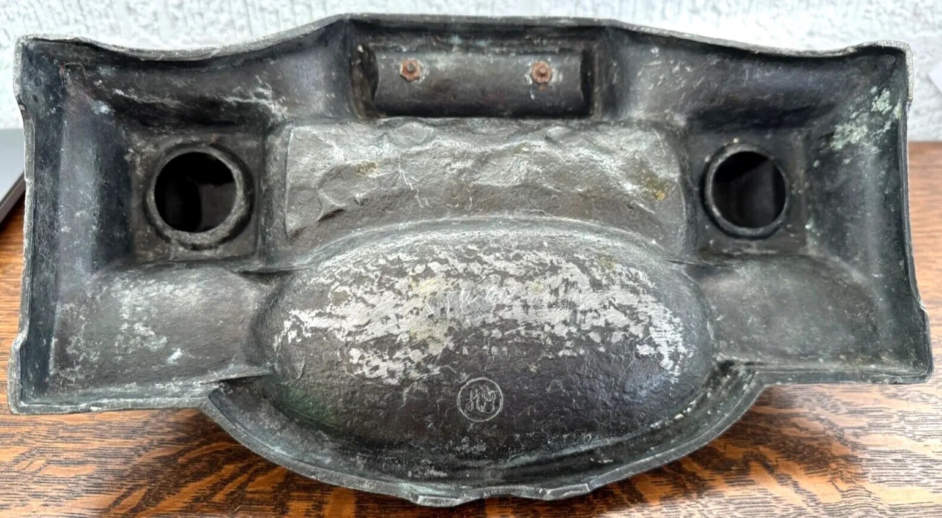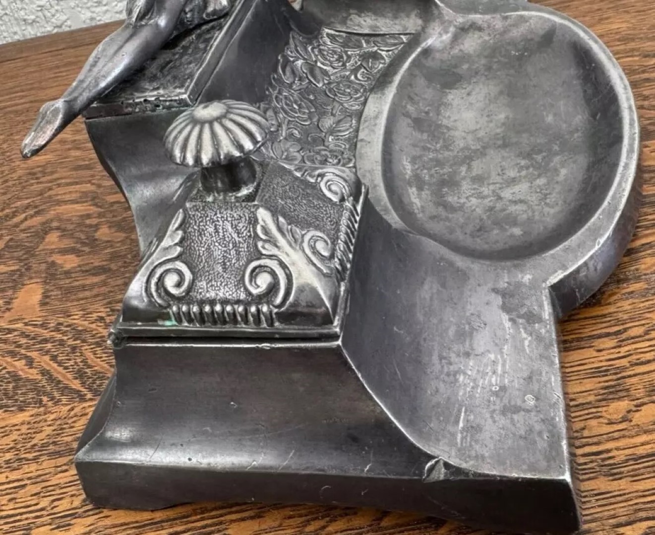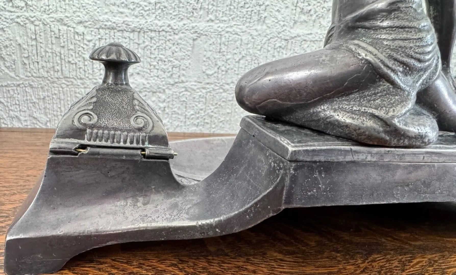 An Art Nouveau double inkstand featuring a nude woman in a classic dancer’s position. The lids are hinged. In front is a pen tray with a floral rose pattern. The underside is marked with the letters “AG”.