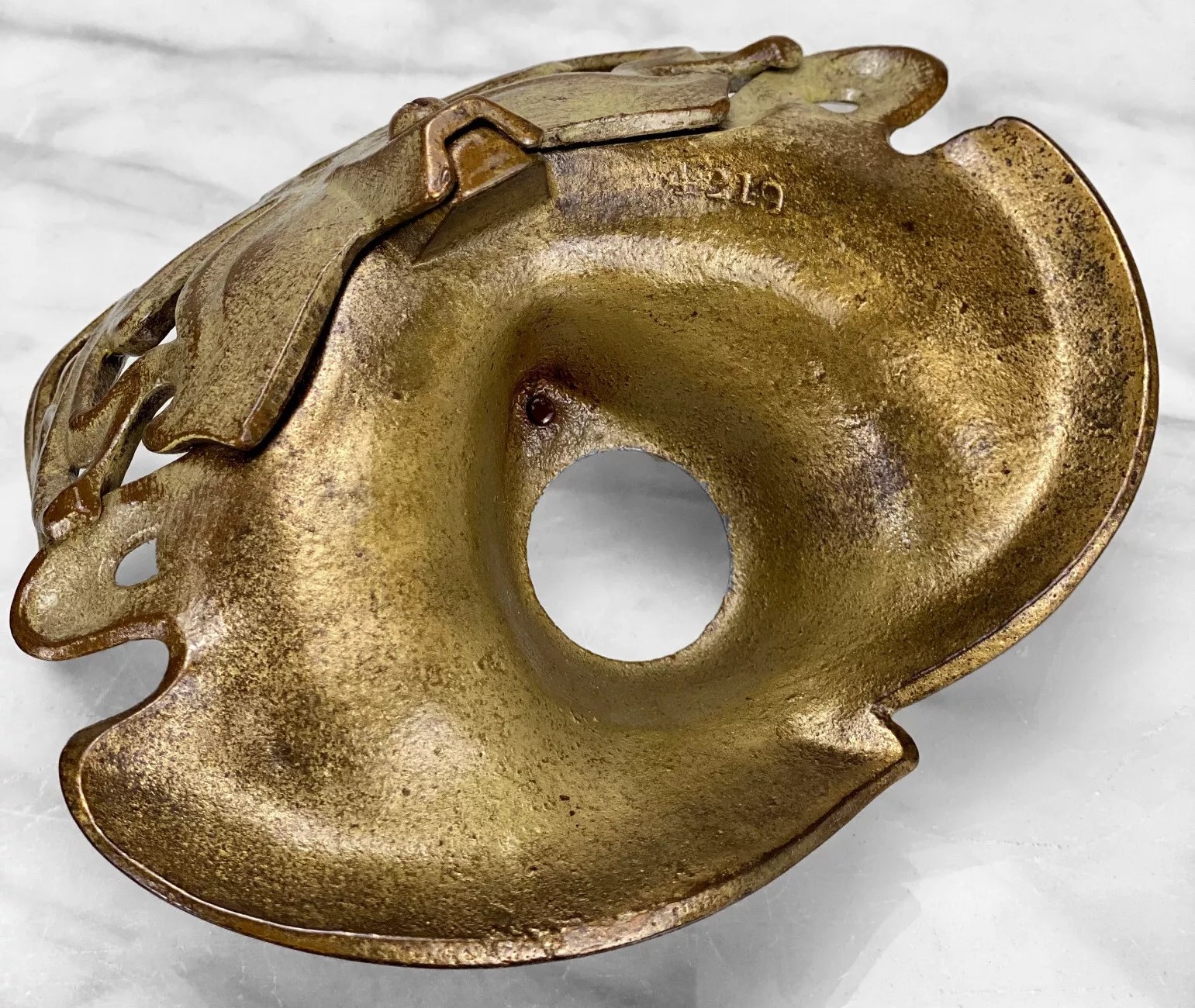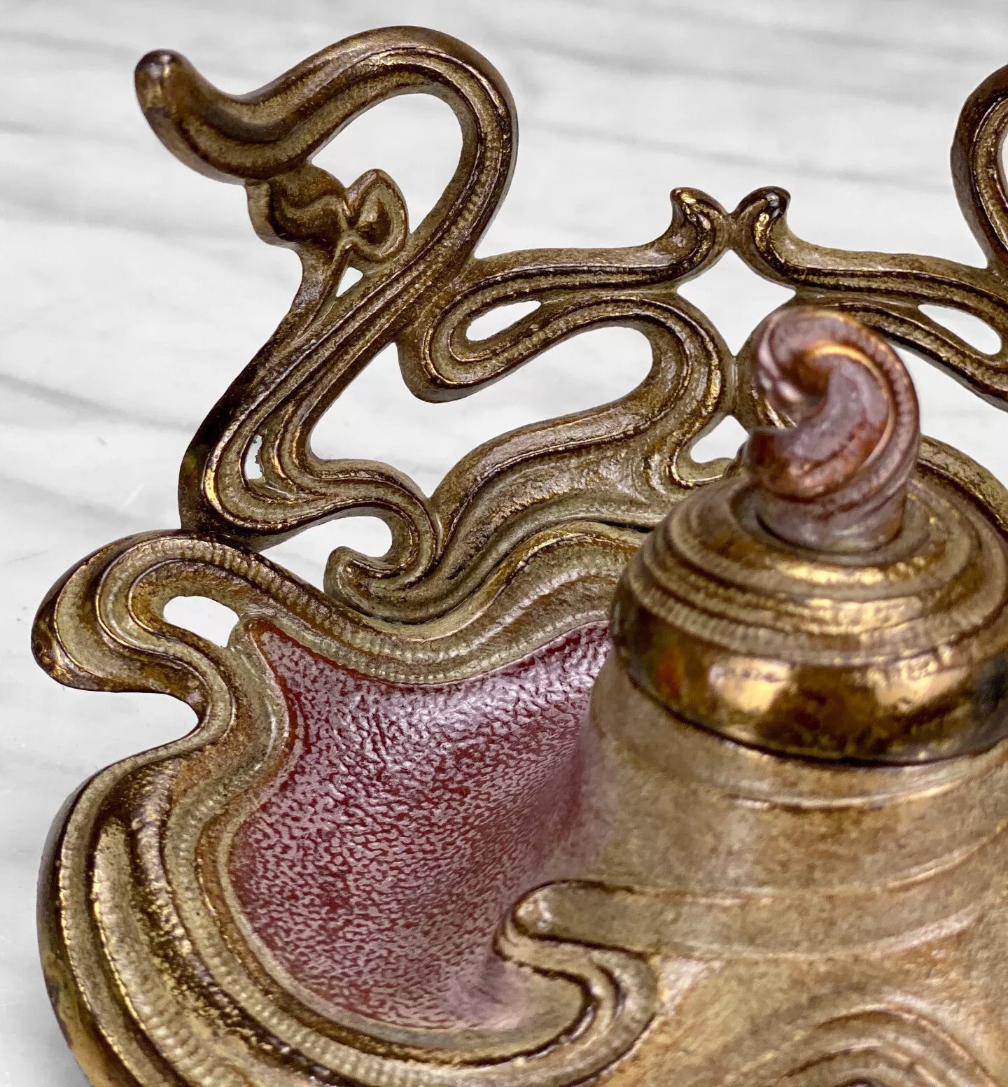 This brass inkstand showcases the distinctive features of the Art Nouveau movement. Its design is characterized by flowing, organic lines reminiscent of stylized vines, leaves, or tendrils. The symmetrical composition includes a raised, dome-shaped lid with a finial that pivots open and closed. Marked “4219”. Insert missing.