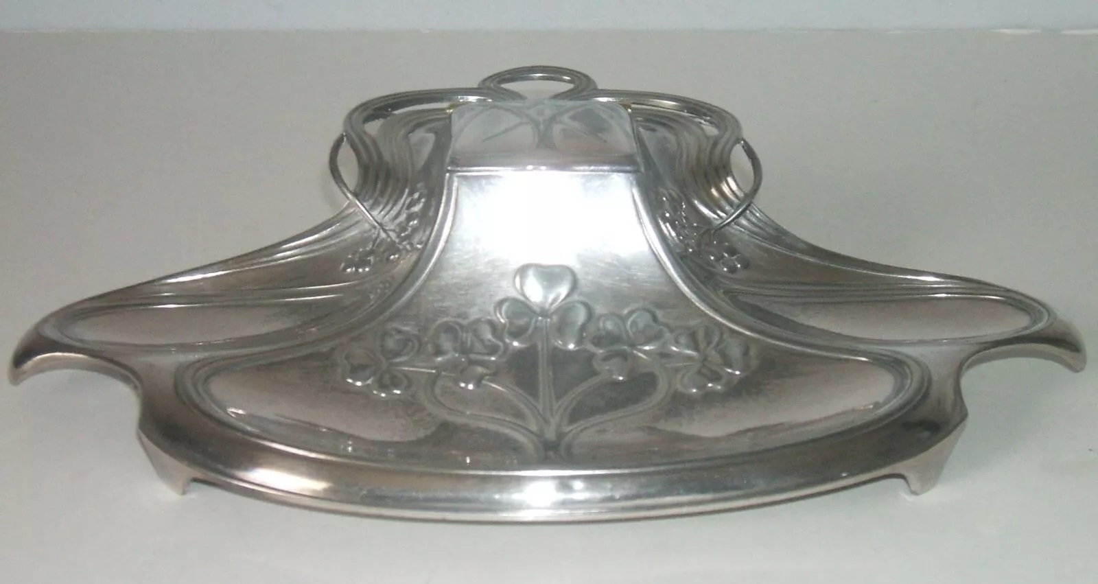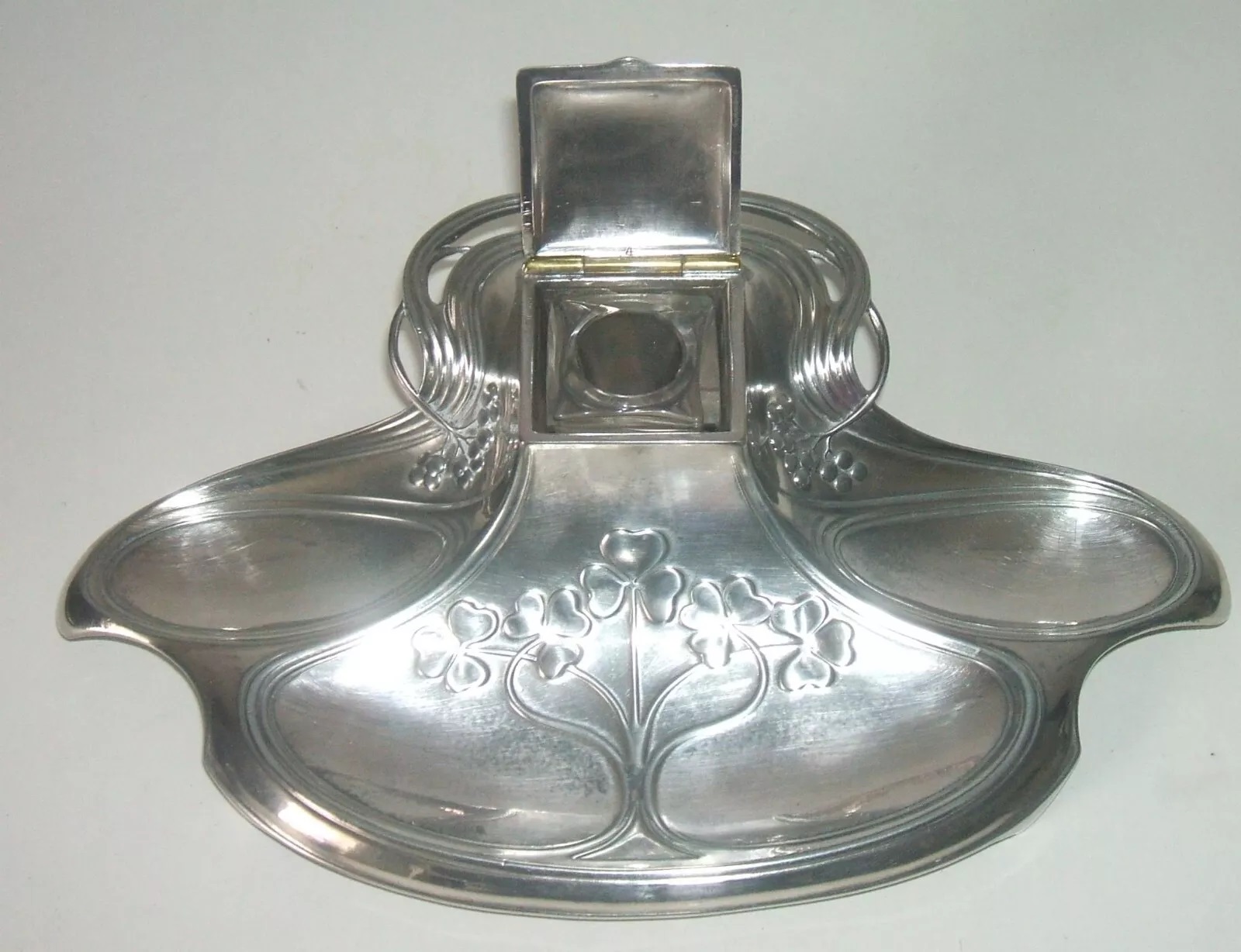 WMF (Württembergische Metallwarenfabrik) made this silverplated inkwell. It features an ornate design with a symmetrical shape and three lobes. The central part showcases a raised decorative element resembling a stylized plant or floral motif. The handles on either side also bear similar decorative elements. The overall shape reflects the flowing and organic style typical of Art Nouveau, a movement WMF was known for during its peak production years. The underside is marked “WMF” with “EP” (electroplate) and “OX” (oxidized).